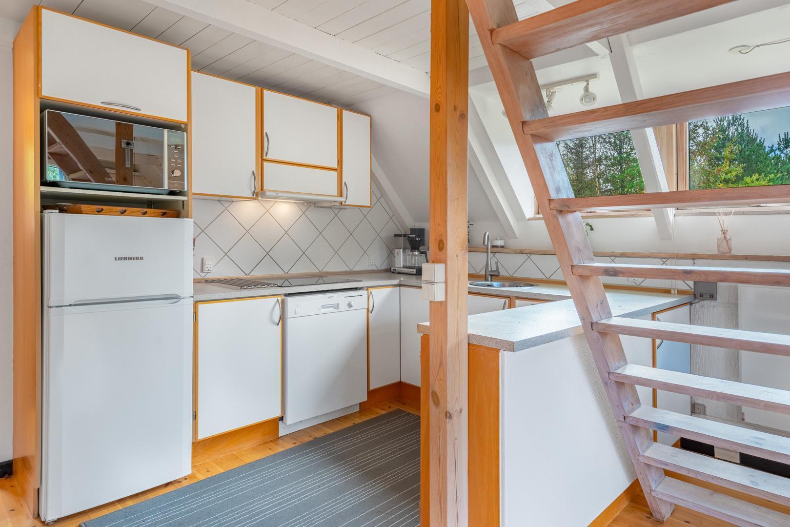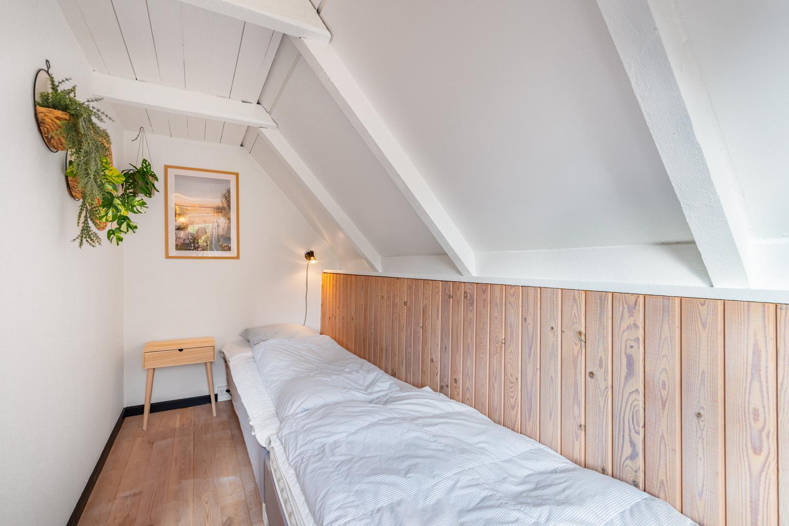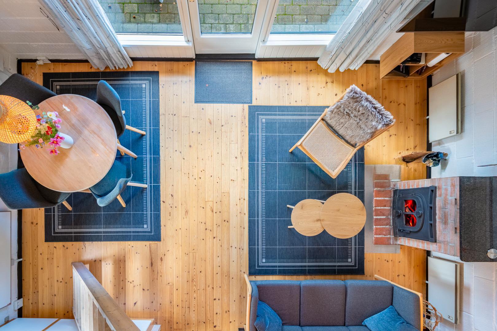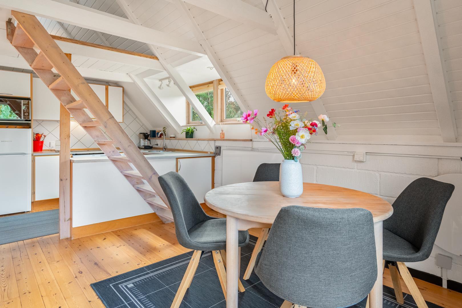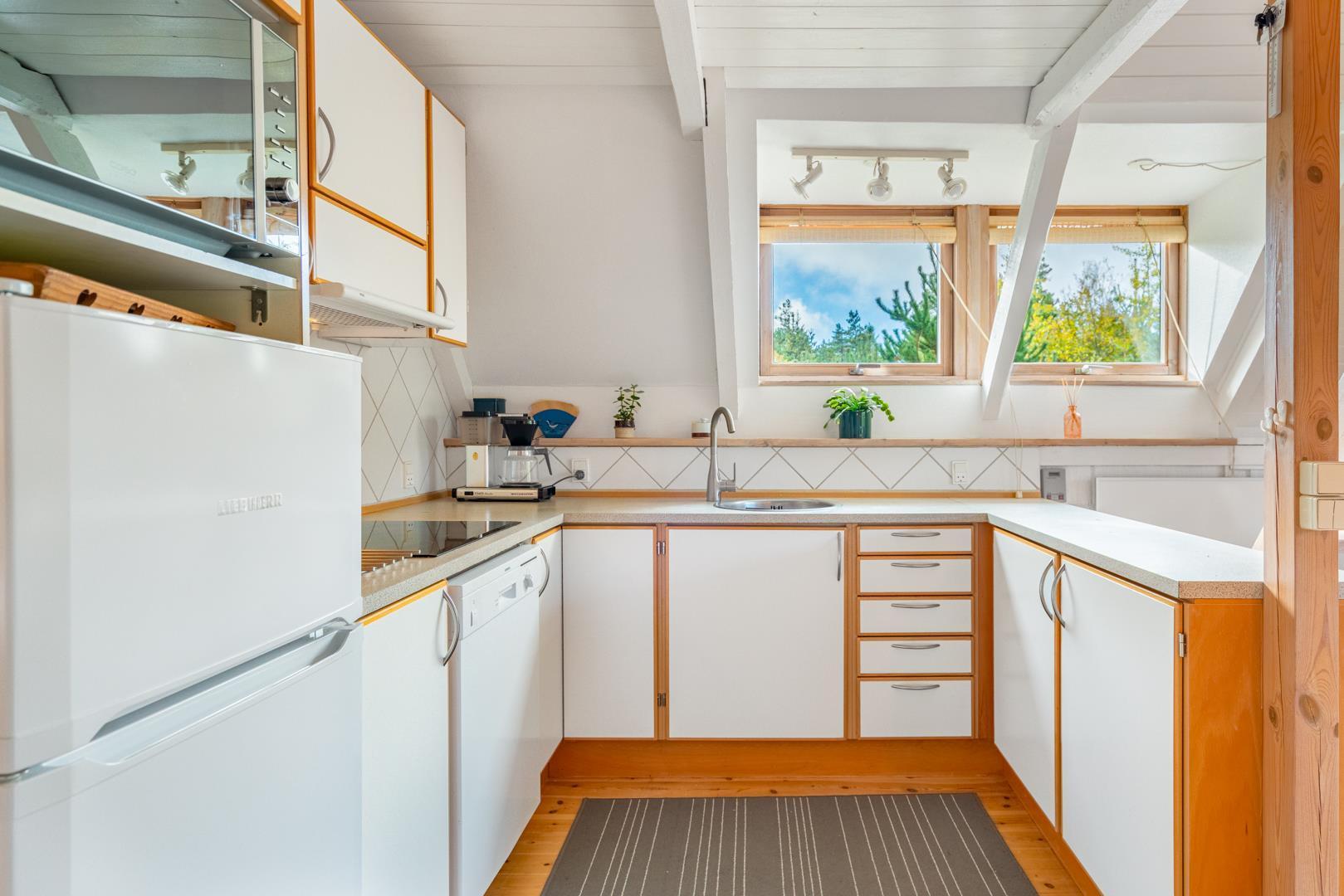 Loftet er åbnet til kip, og de sortmalede træbjælker tilfører en helt speciel "hytte-stemning" til huset. I det hyggelige sofahjørne i stuen finder I også brændeovnen, som vil fylde rummet med varme på en kold vinterdag.