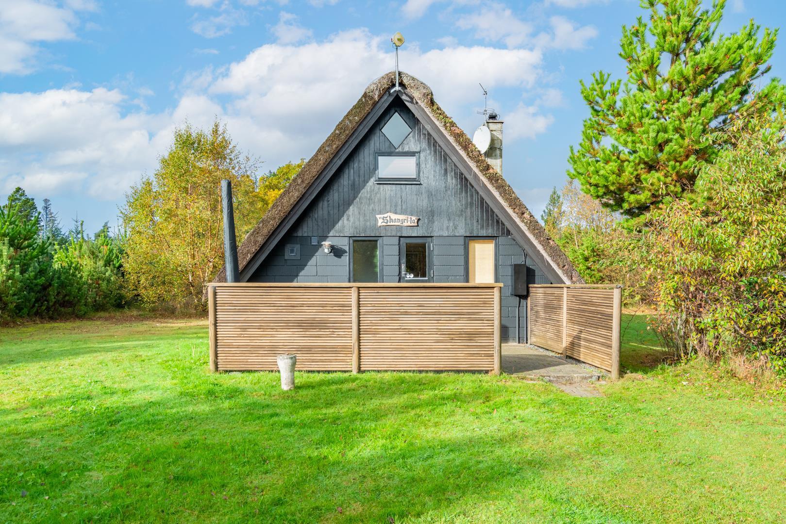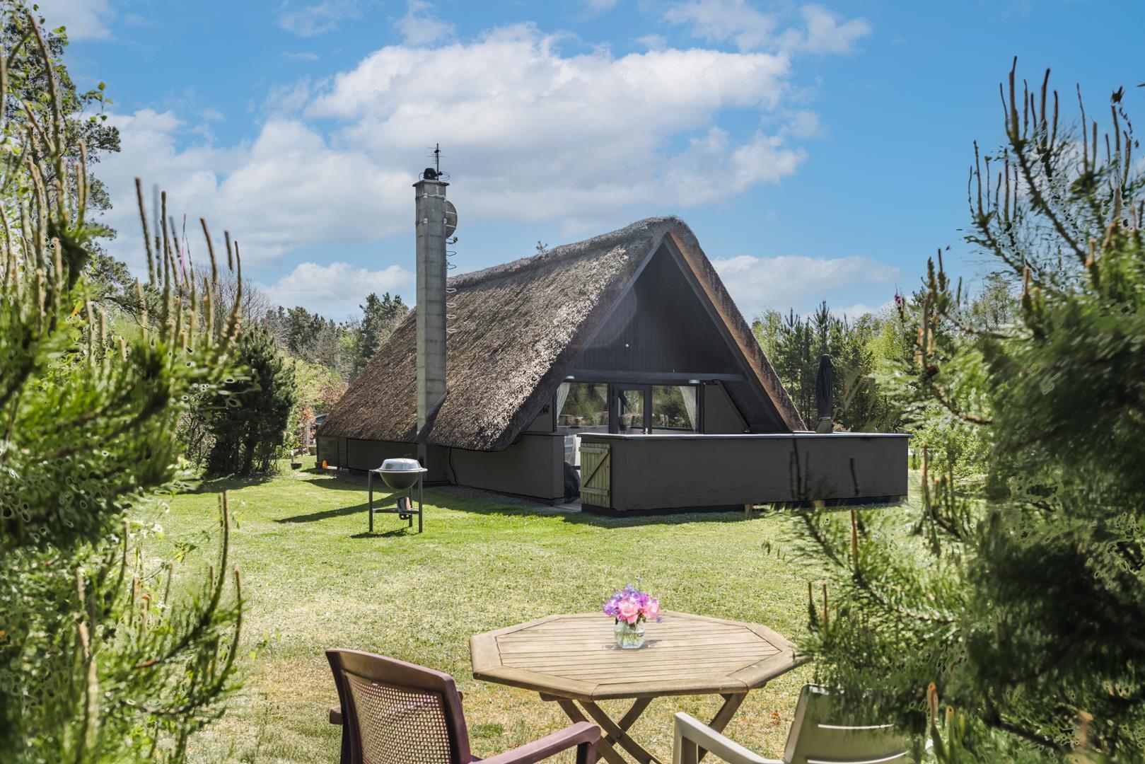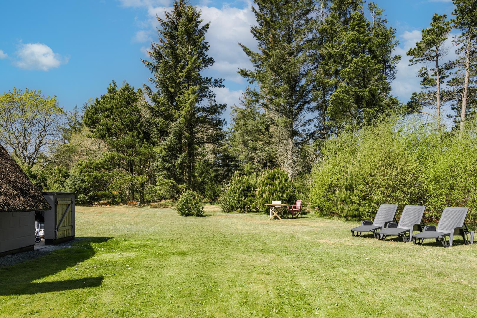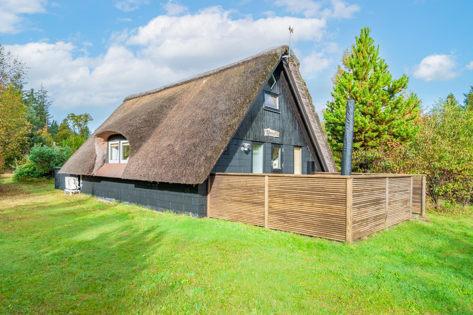 Dette lille charmerende stråtagshus, ligger på en stor, naturgrund blandt skovens høje træer med en dejligt lukket terrasse, både foran og bag ved huset. Der er flere små hyggekroge rundt omkring blandt træerne i haven, hvor man kan nyde lidt koldt at drikke i den bagende sol. Fuglene kvidrer, bierne summer ren ferieidyl!