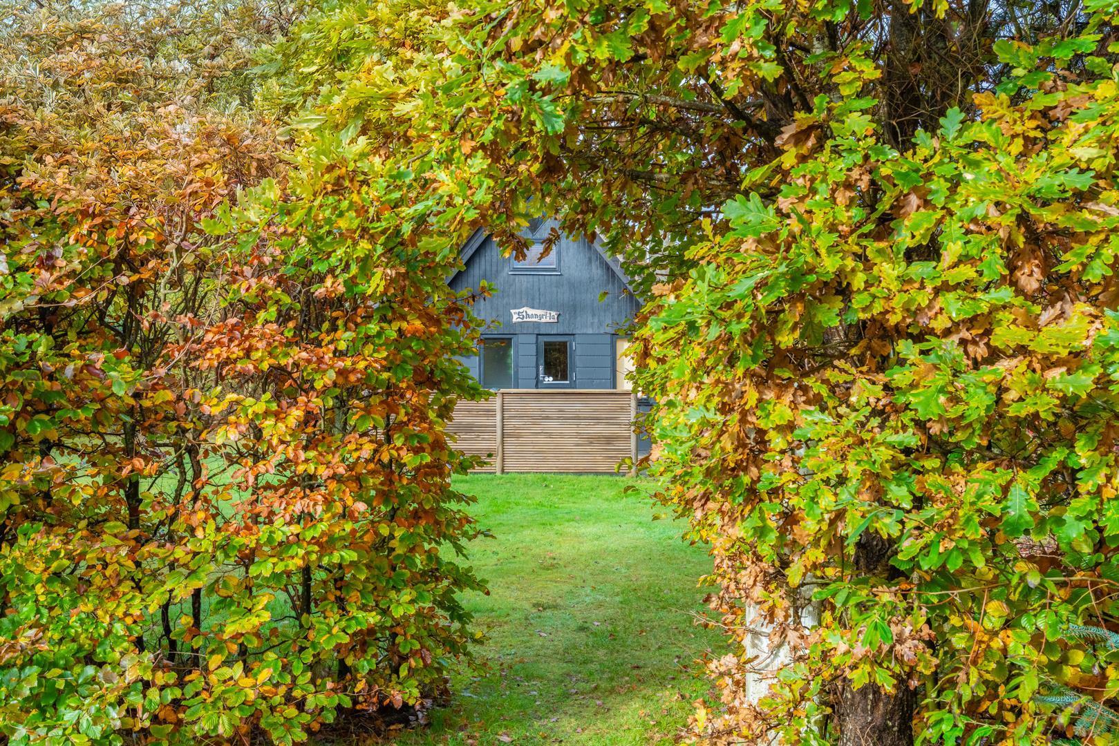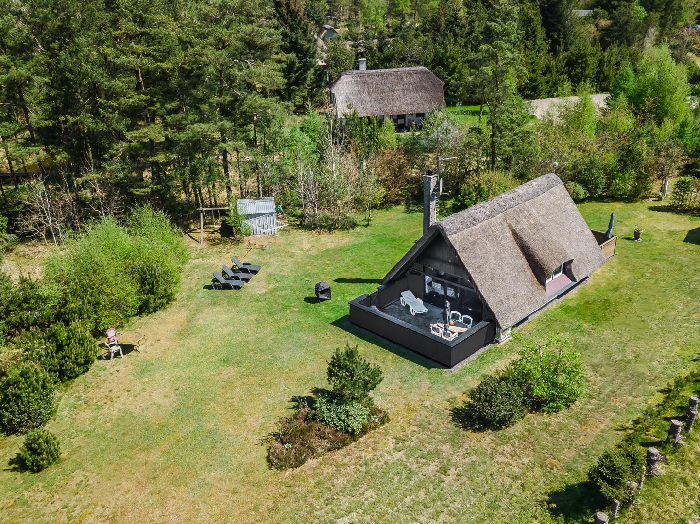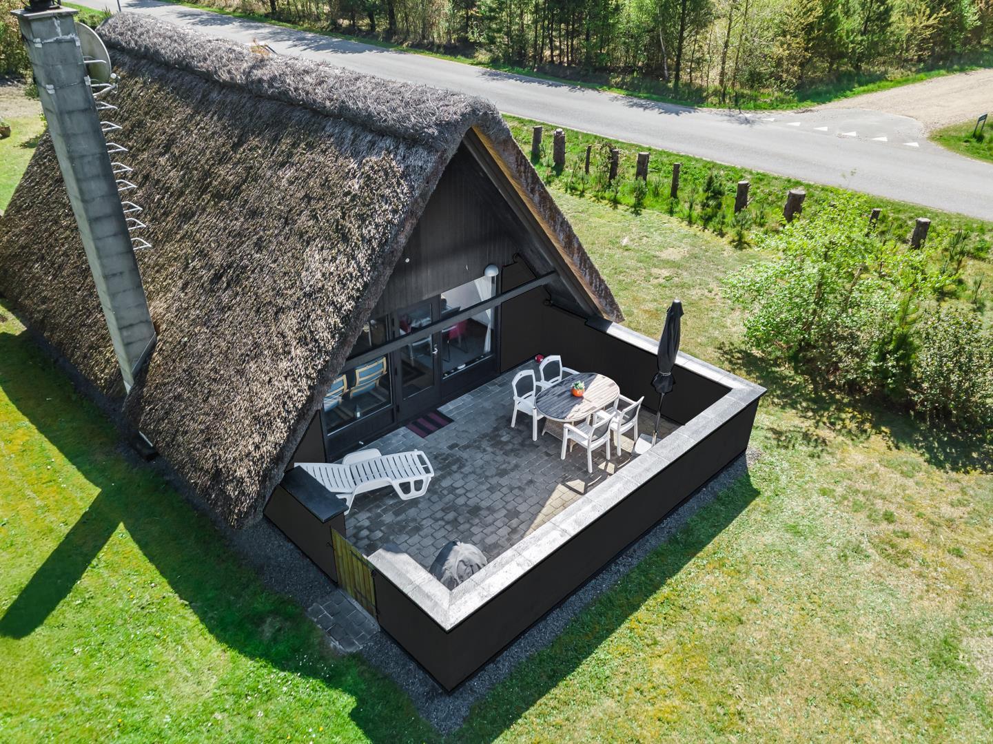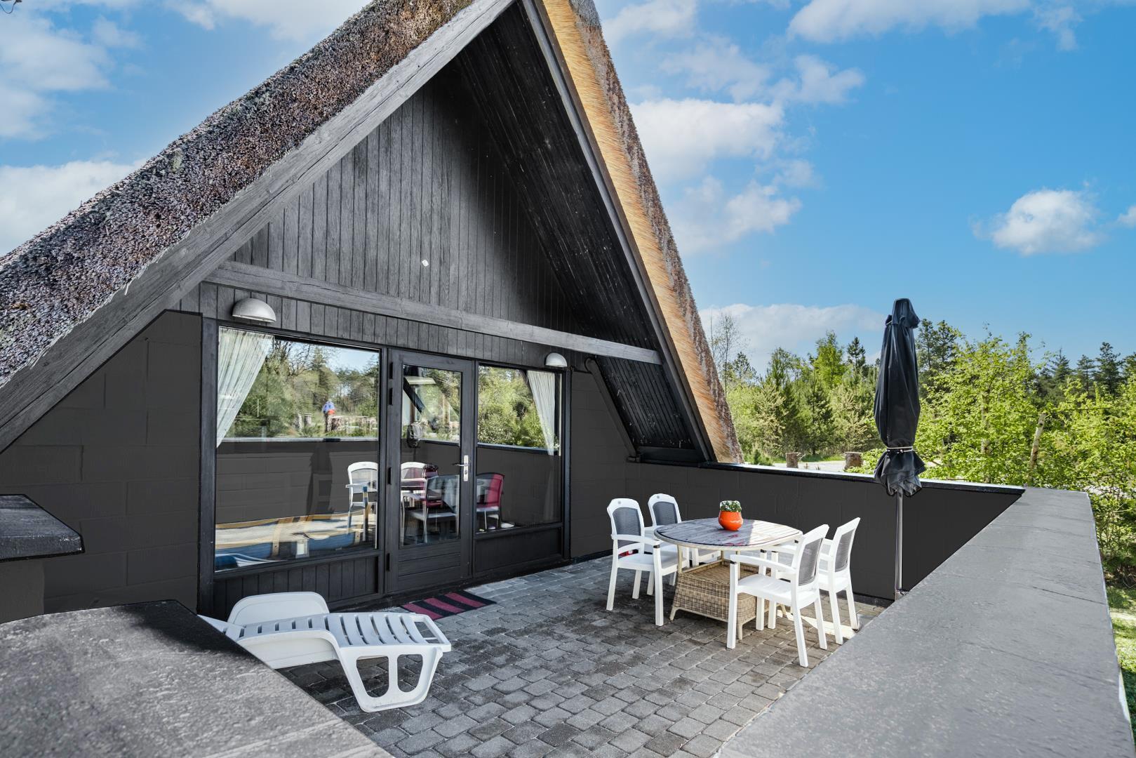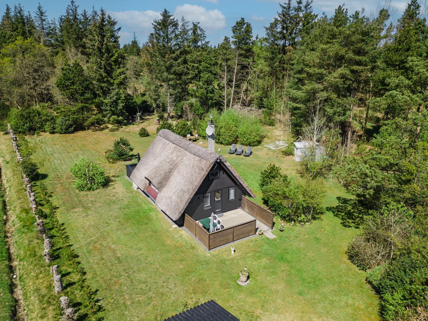Dette lille charmerende stråtagshus, ligger på en stor, naturgrund blandt skovens høje træer med en dejligt lukket terrasse, både foran og bag ved huset. Der er flere små hyggekroge rundt omkring blandt træerne i haven, hvor man kan nyde lidt koldt at drikke i den bagende sol. Fuglene kvidrer, bierne summer ren ferieidyl!