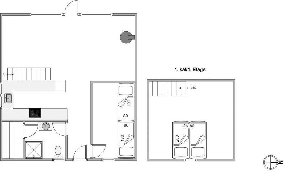 Sengestørrelse: 1 dobbeltseng med 2 madrasser 80 x 200 cm + 2 enkeltsenge 80 x 190 cm.