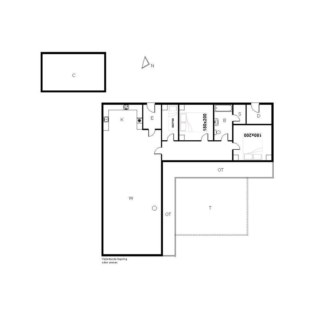 Sengestørrelse: 2 dobbeltsenge 180 x 200 cm 1 enkeltseng 90 x 200 cm