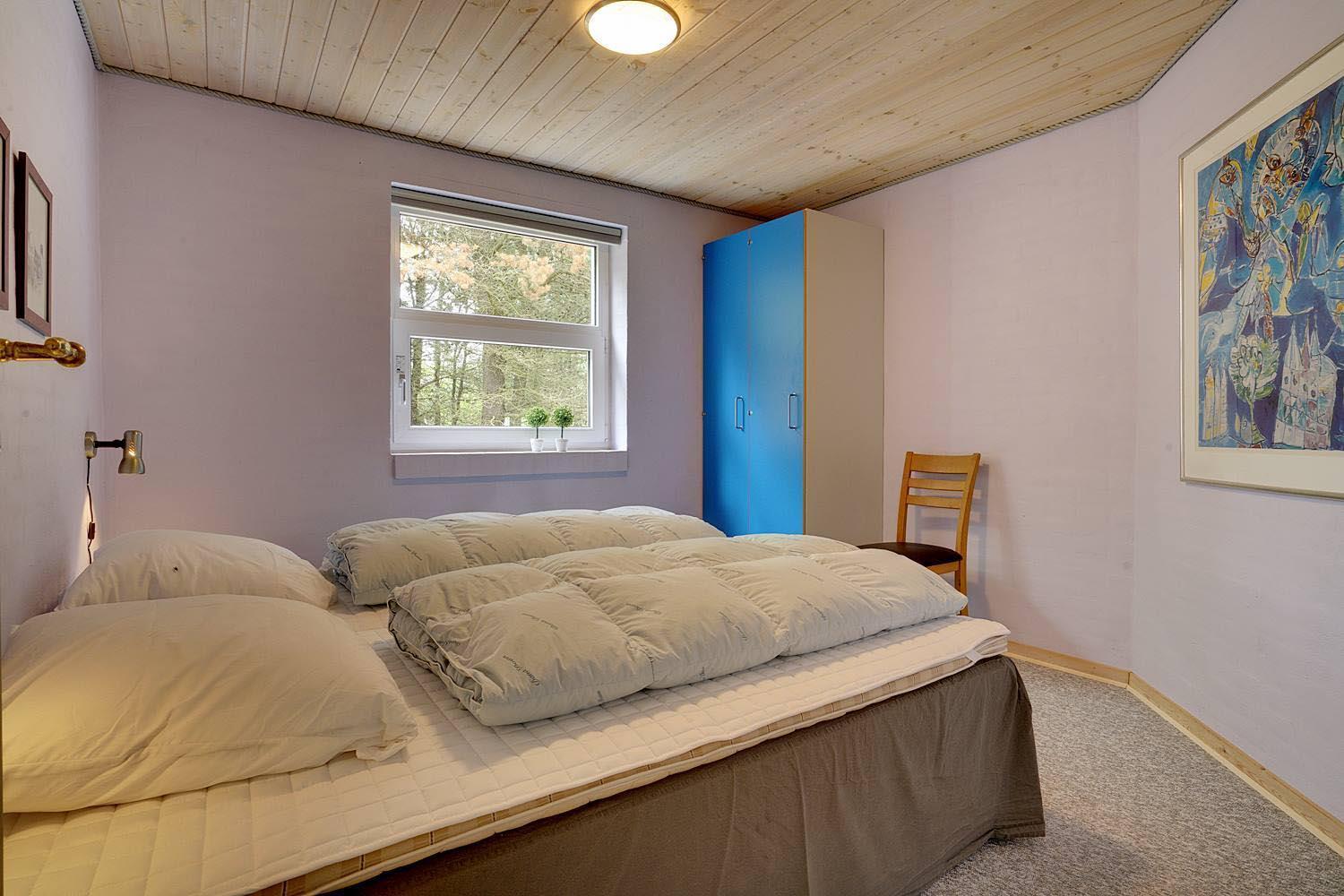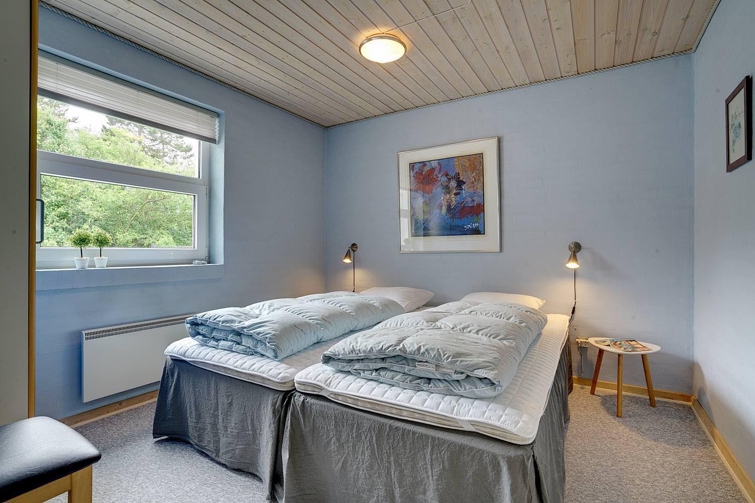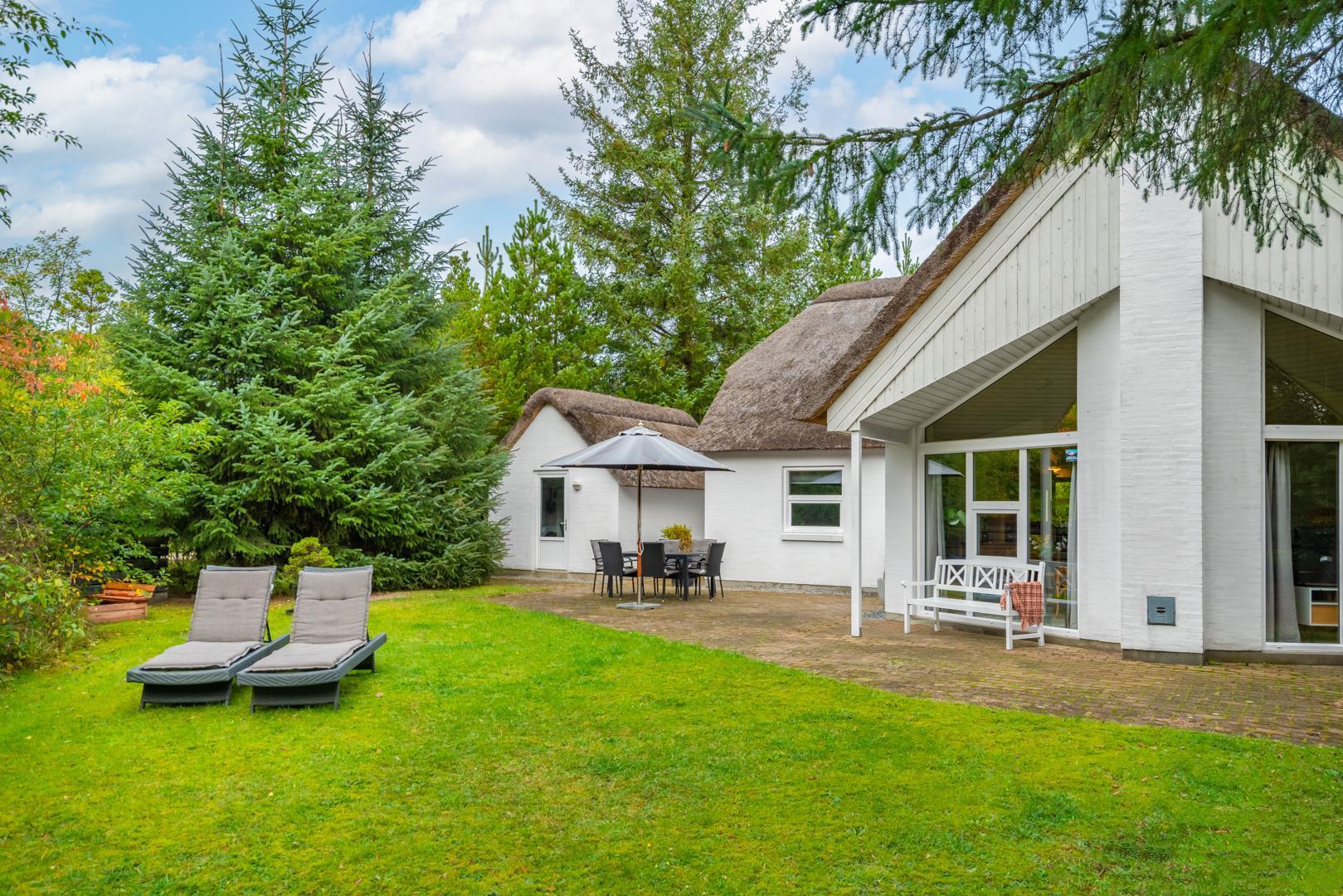 Das Ferienhaus liegt auf einem großen, naturnahen Grundstück in ruhiger Lage von Houstrup – umgeben von hohen Bäumen, duftenden Kiefern und Heidekraut.