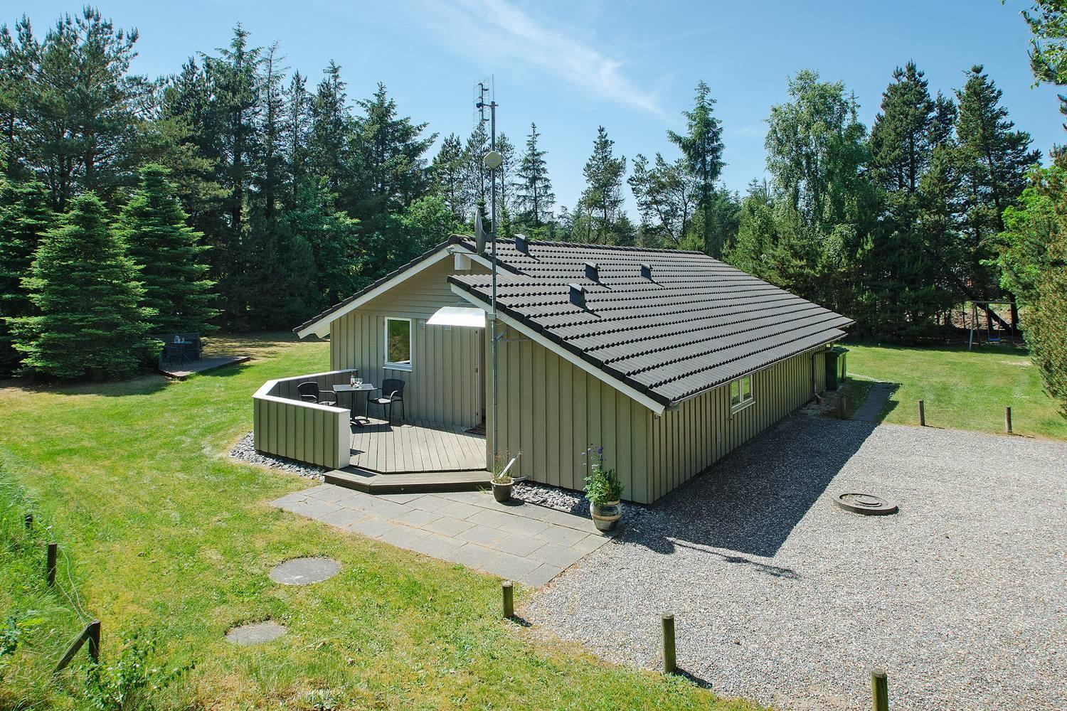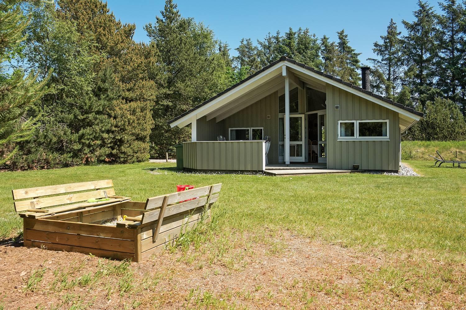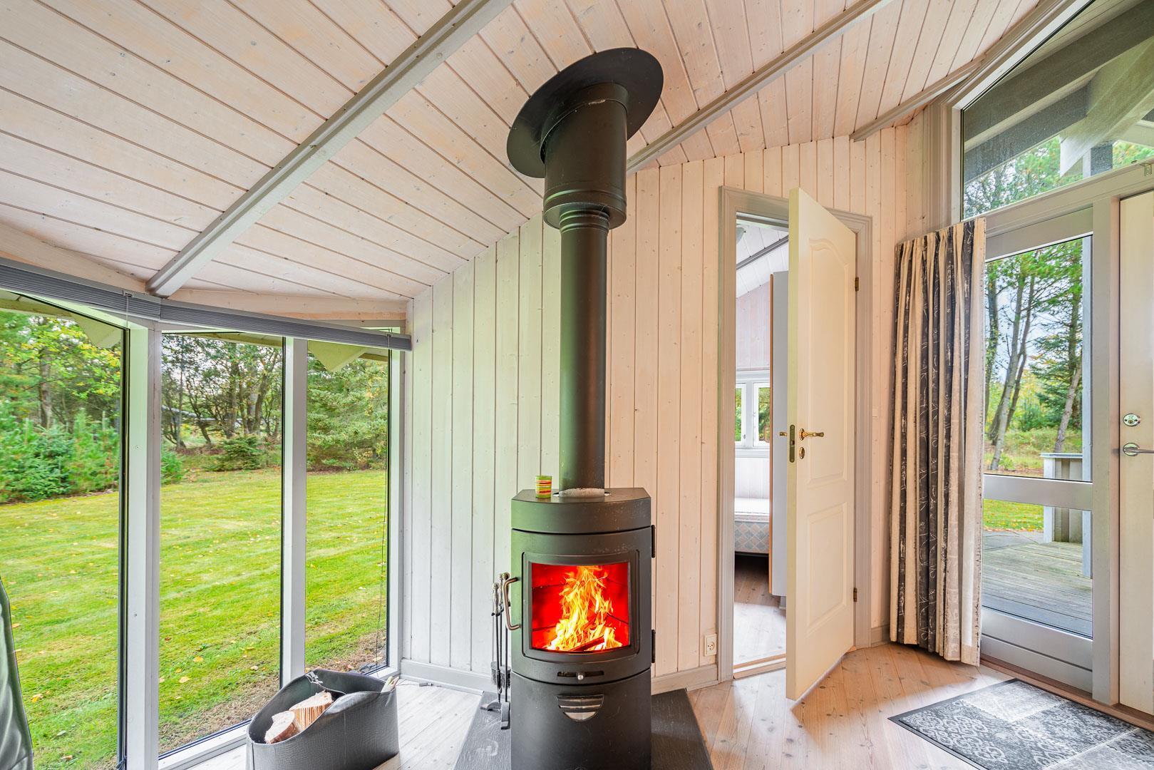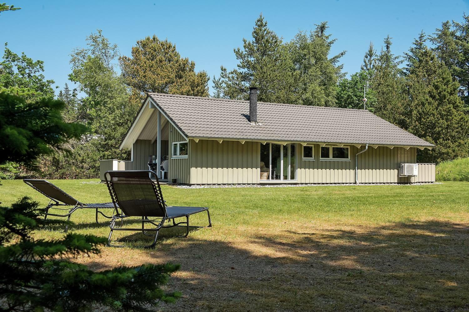 Velholdt sommerhus beliggende for enden af lukket vej på en stor grund med græs og træer omkring, hvor det er muligt at spille bold eller børnene kan lege i de rolige omgivelser. Husets delvist overdækkede terrasse er indbydende og ligger i læ for vinden. Stuen er indrettet med stor brændeovn, der gør det nemt og billigt at opvarme huset hele året.Der er desuden varmepumpe i huset. Desuden er der fjernsyn med video- og DVD-afspiller samt tilsluttet parabol med tyske og danske kanaler. Køkkenet er udstyret med opvaskemaskine, mikroovn samt køle/fryseskab. Badeværelset er med behagelig gulvvarme samt 2-personers spabad, sauna bruseniche, skabe og toilet.