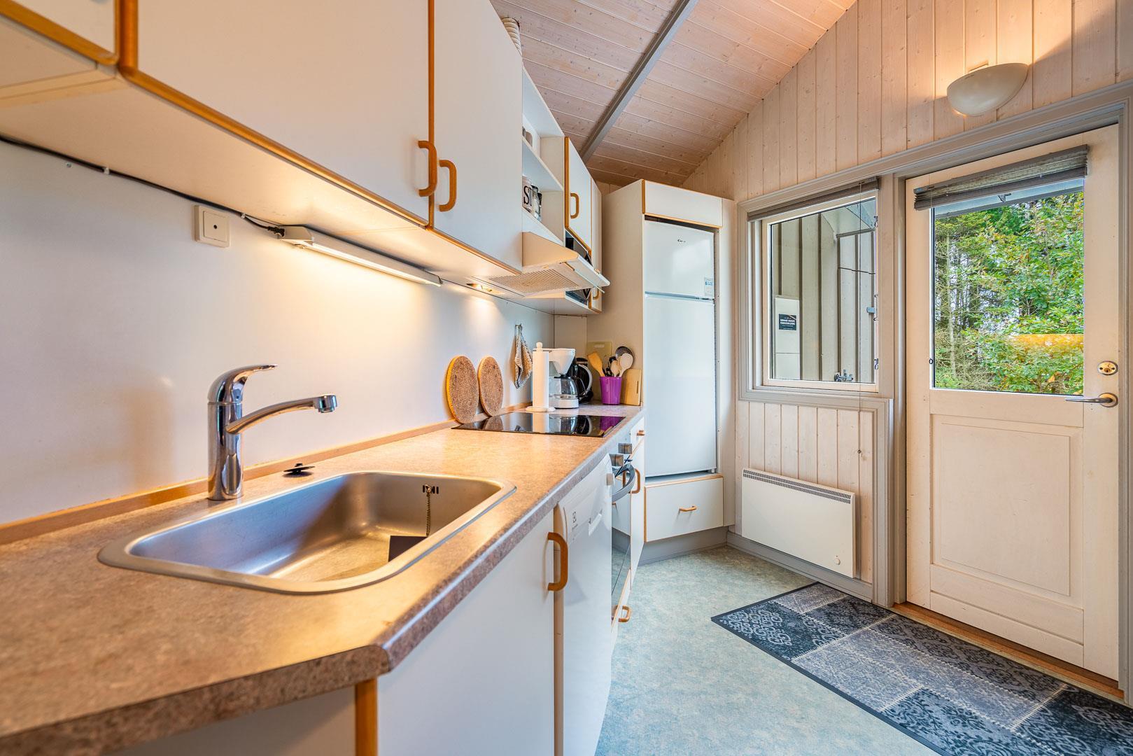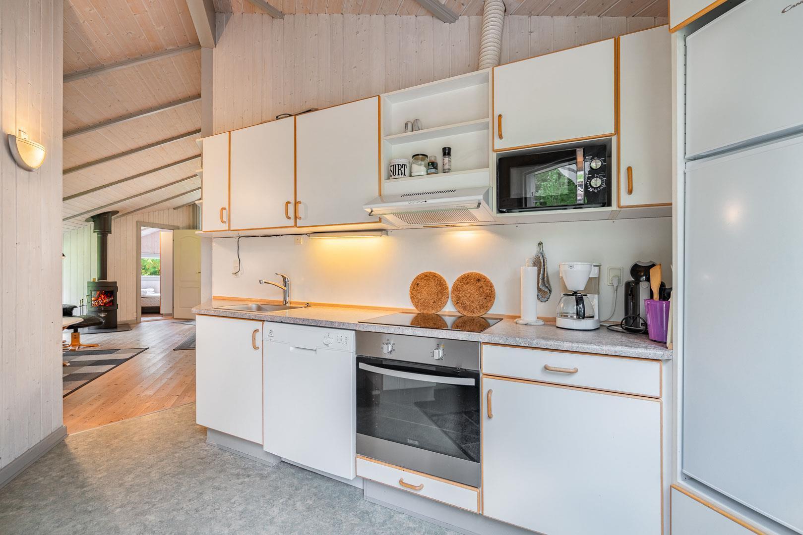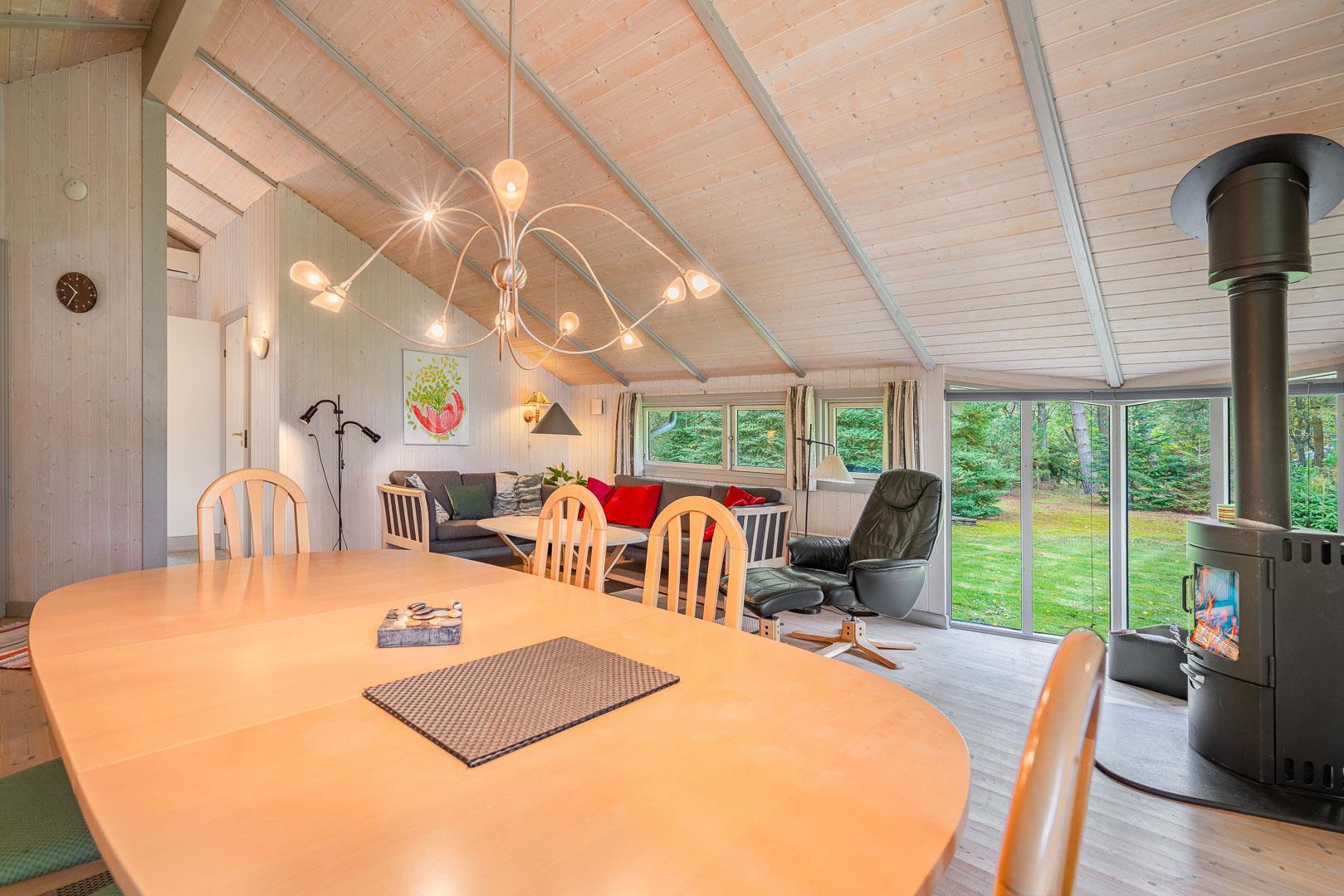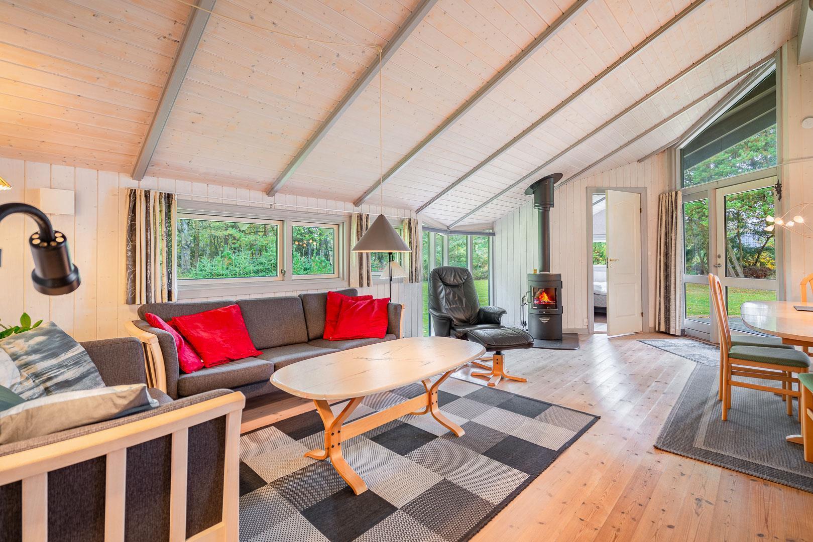 Velholdt sommerhus beliggende for enden af lukket vej på en stor grund med græs og træer omkring, hvor det er muligt at spille bold eller børnene kan lege i de rolige omgivelser. Husets delvist overdækkede terrasse er indbydende og ligger i læ for vinden. Stuen er indrettet med stor brændeovn, der gør det nemt og billigt at opvarme huset hele året.Der er desuden varmepumpe i huset. Desuden er der fjernsyn med video- og DVD-afspiller samt tilsluttet parabol med tyske og danske kanaler. Køkkenet er udstyret med opvaskemaskine, mikroovn samt køle/fryseskab. Badeværelset er med behagelig gulvvarme samt 2-personers spabad, sauna bruseniche, skabe og toilet.