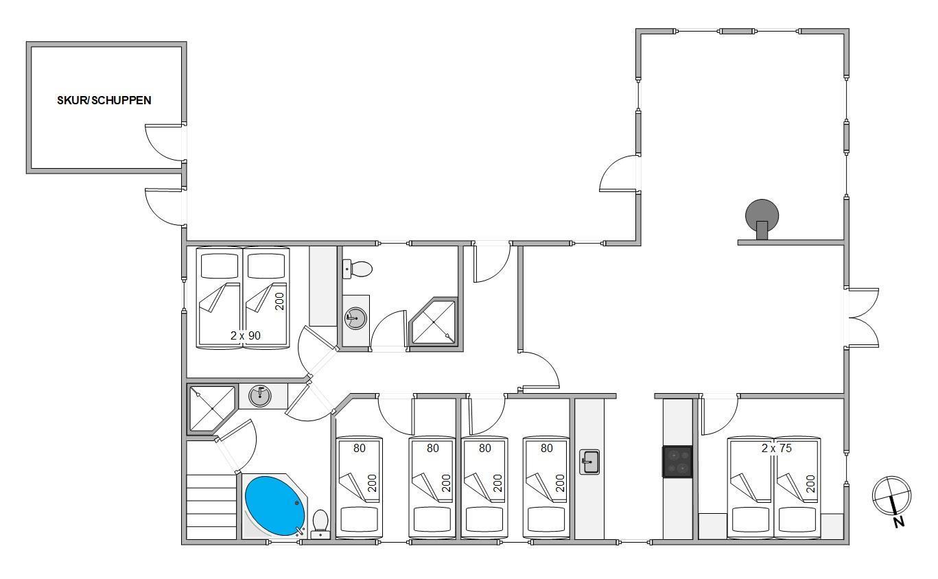Med plads til 7 personer er huset indrettet med 2 badeværelser, og I behøver altså aldrig at stå i kø til toilettet. På det største badeværelse finder I desuden både en sauna og en spa, så I rigtig kan forkæle jer selv og hinanden.