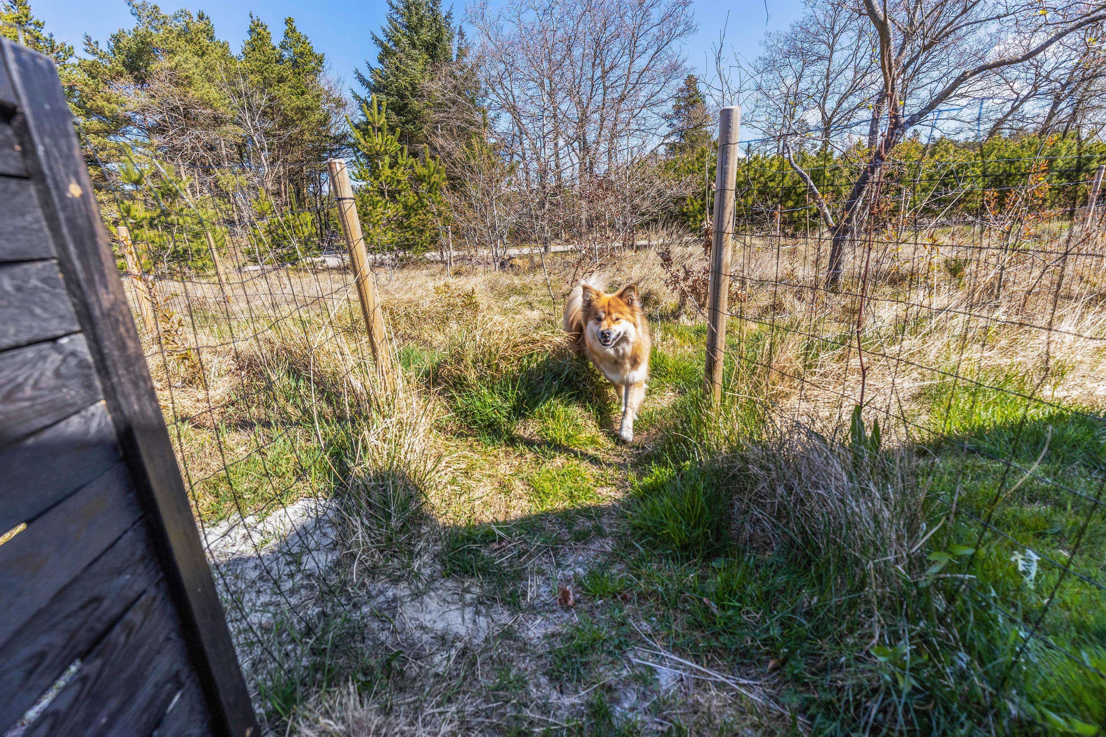 På grunden er der også en stor indhegning til familiens hund, så I ikke skal være bekymrede for at den tager alene på eventur i området.
