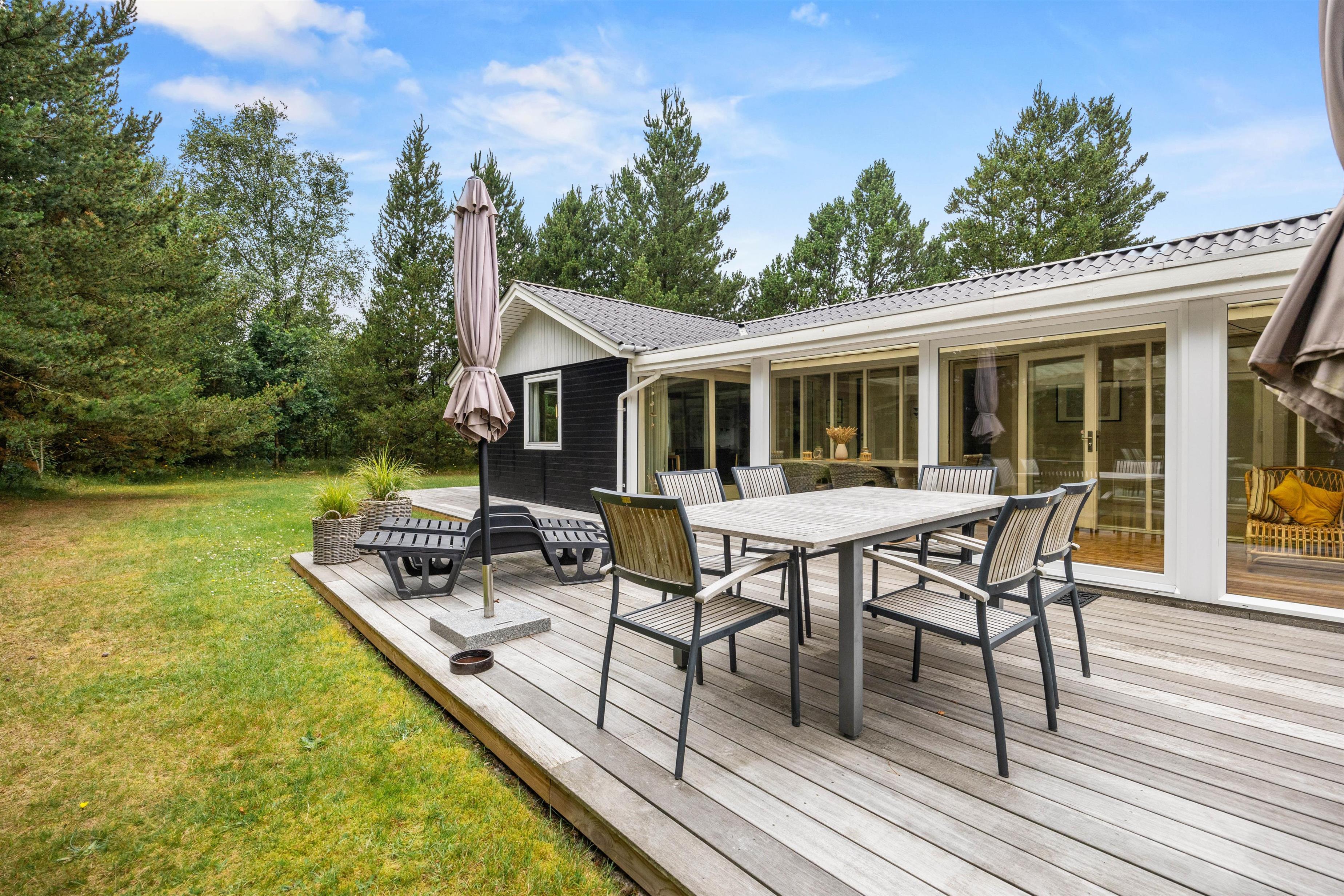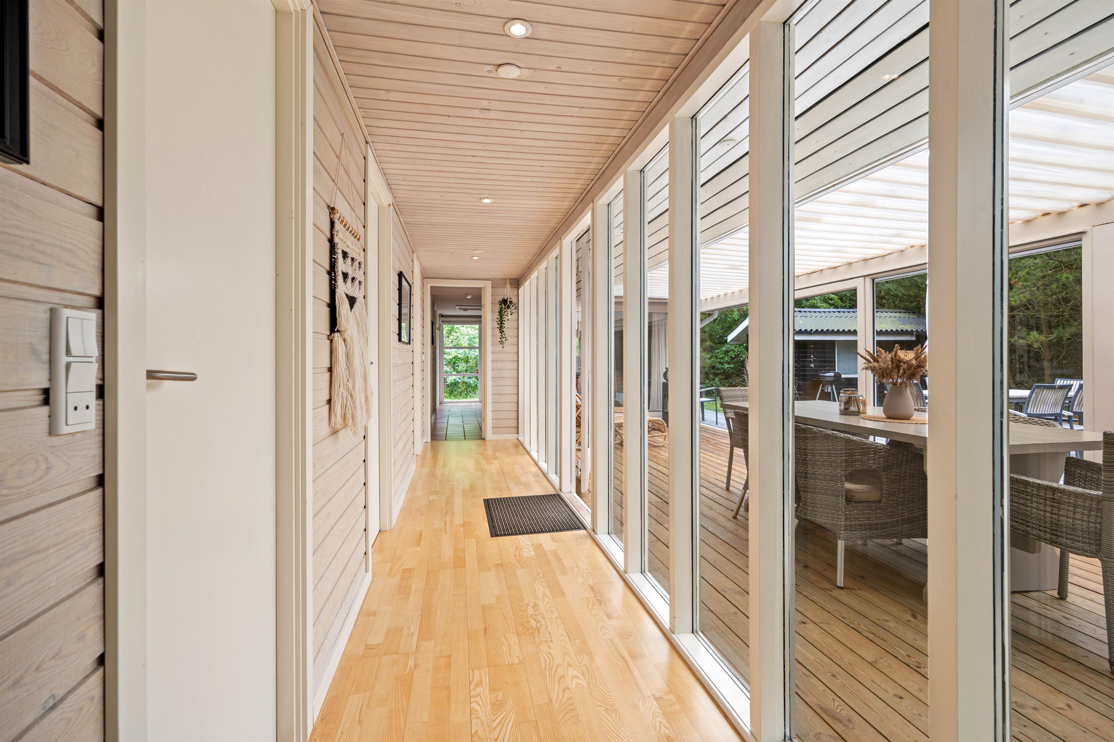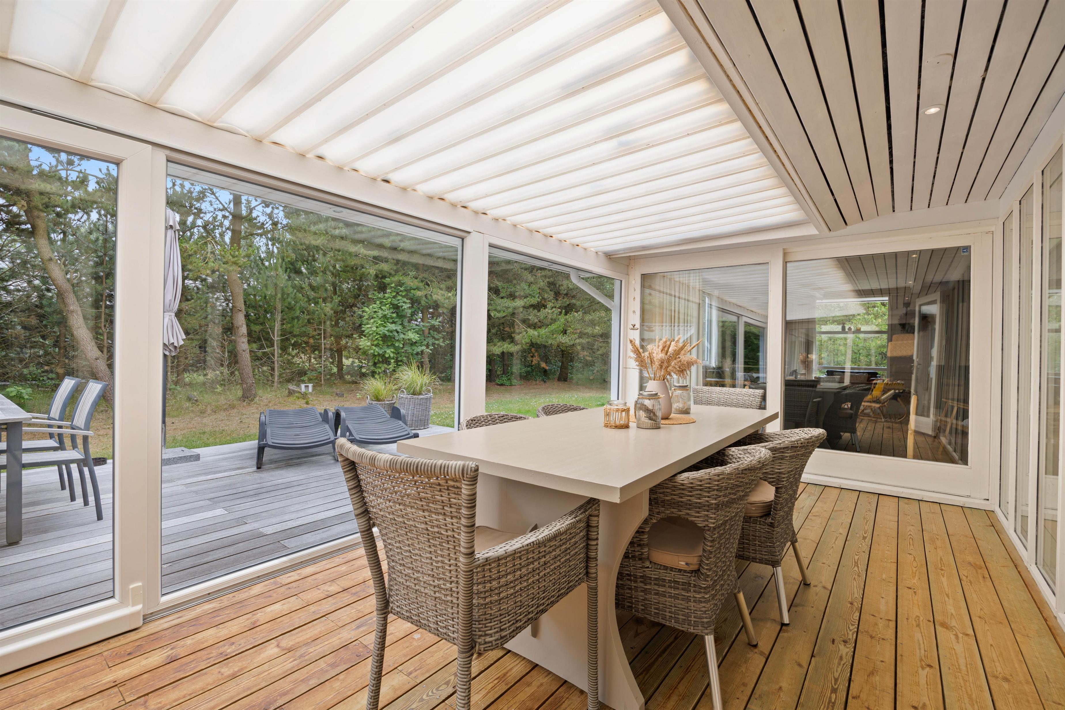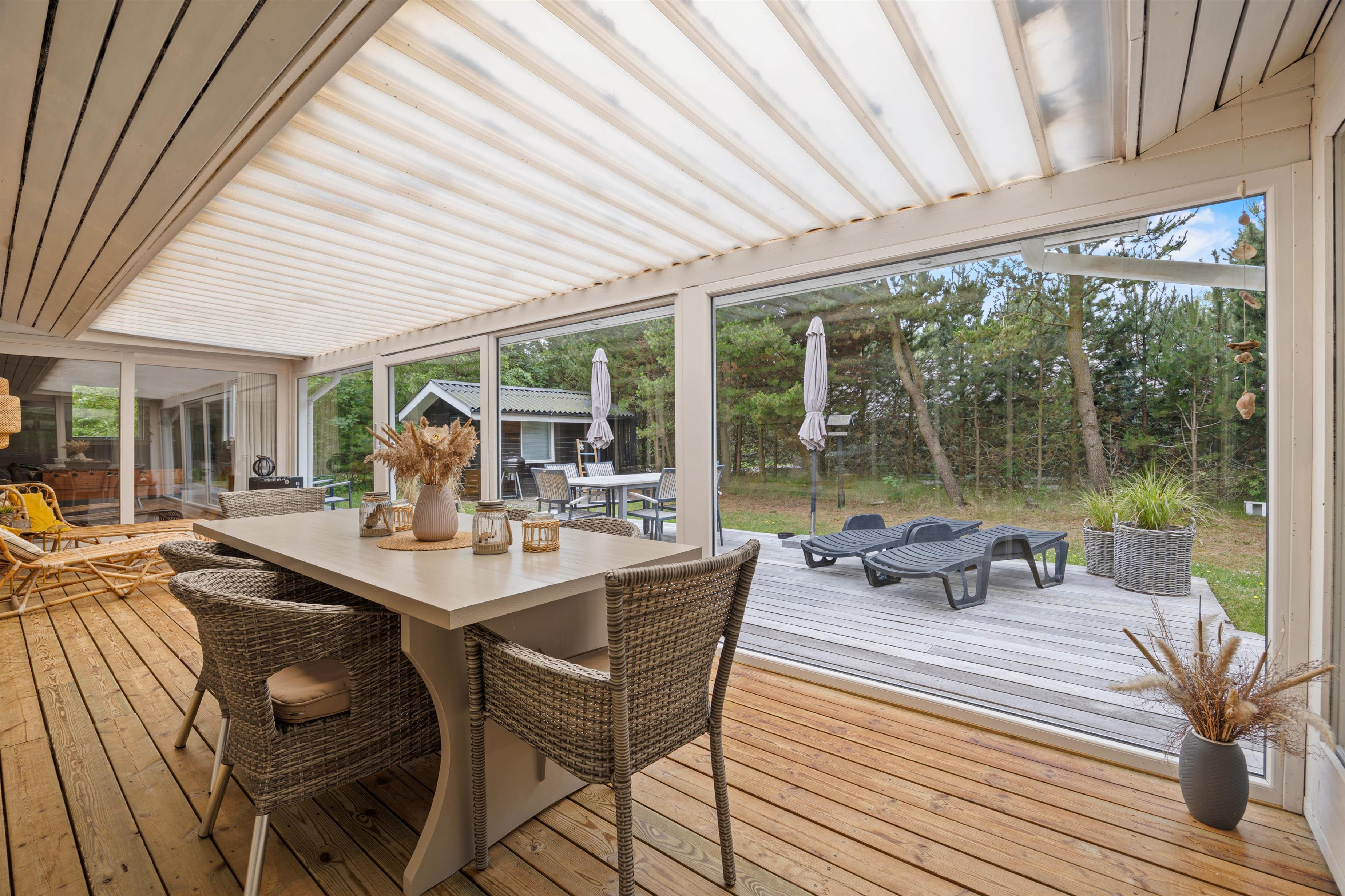 Ikke kun indenfor er huset perfekt til feriehygge. Hele vejen rundt om huset slænger sig en træveranda, så I altid kan finde den perfekte plads i solen. Er vejret lidt drilsk, kan I søge ind i den skønne udestue og derfra nyde lyset og udsigten til naturgrunden, der i øvrigt byder masser af plads til leg for både børn og hund.