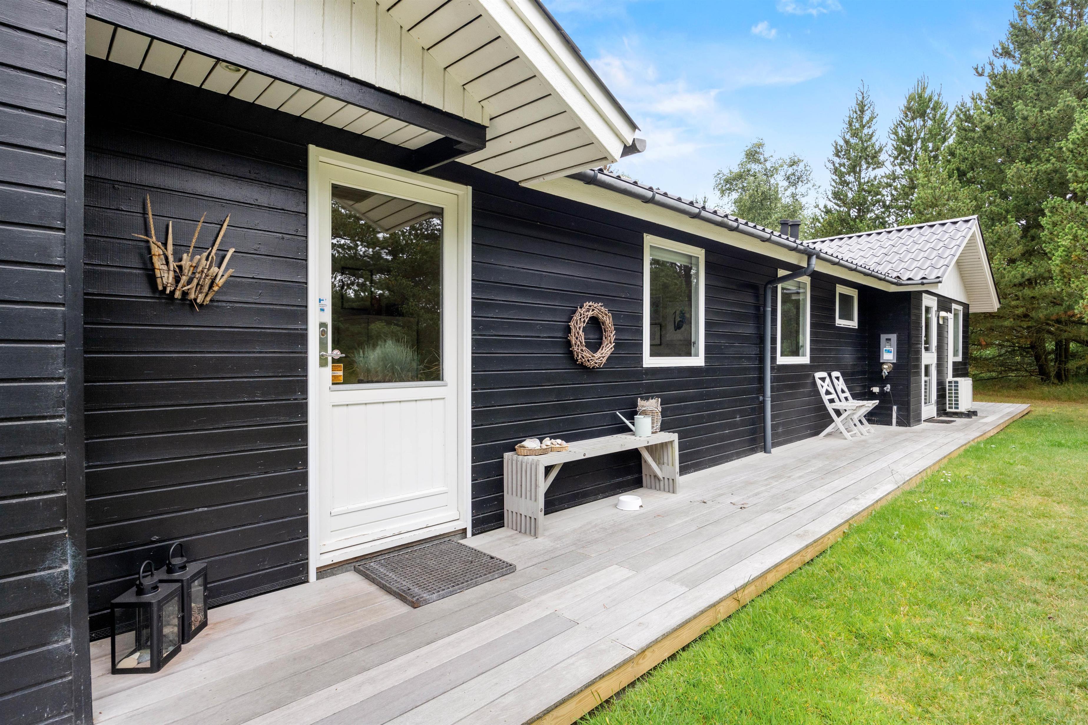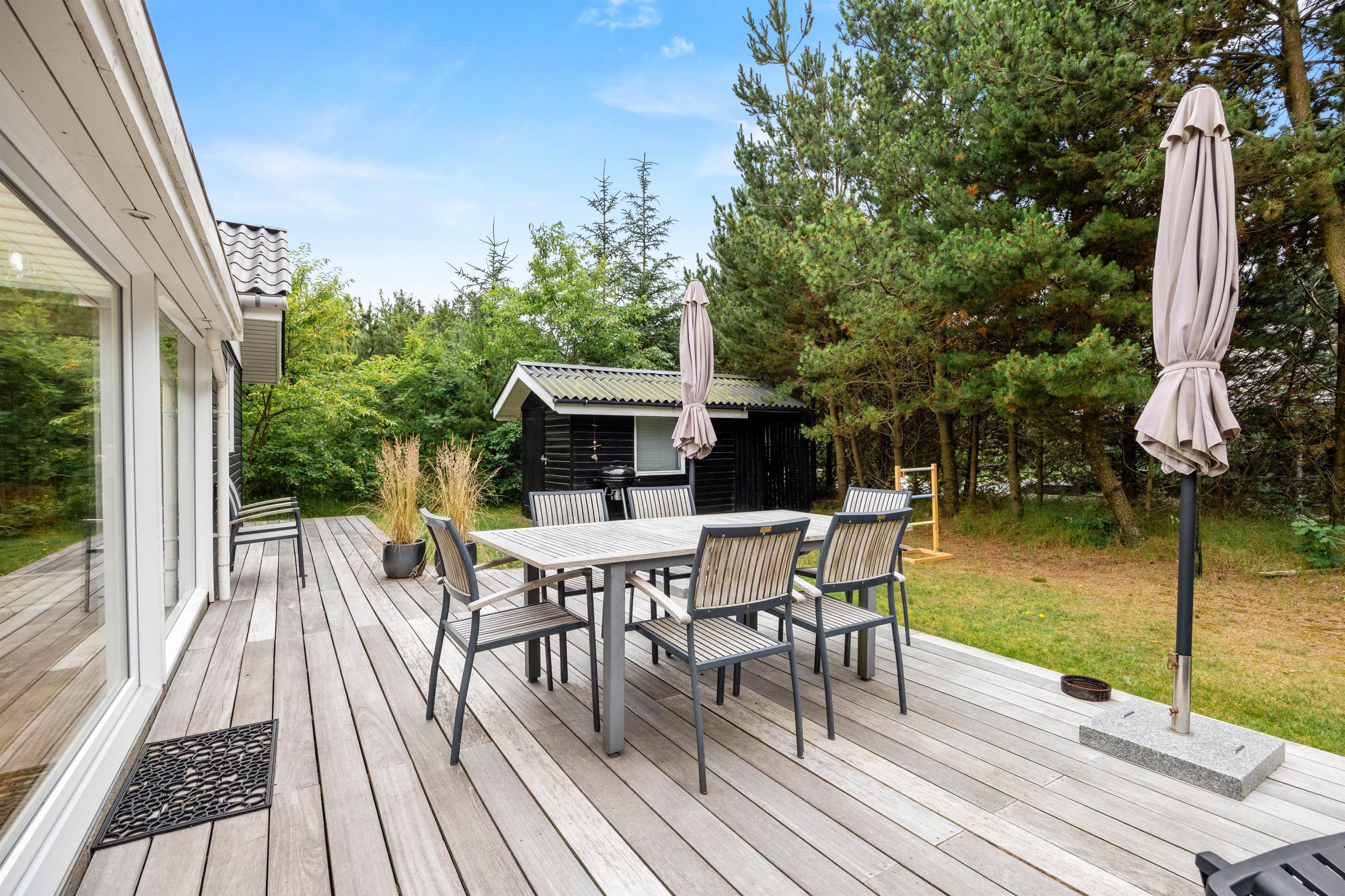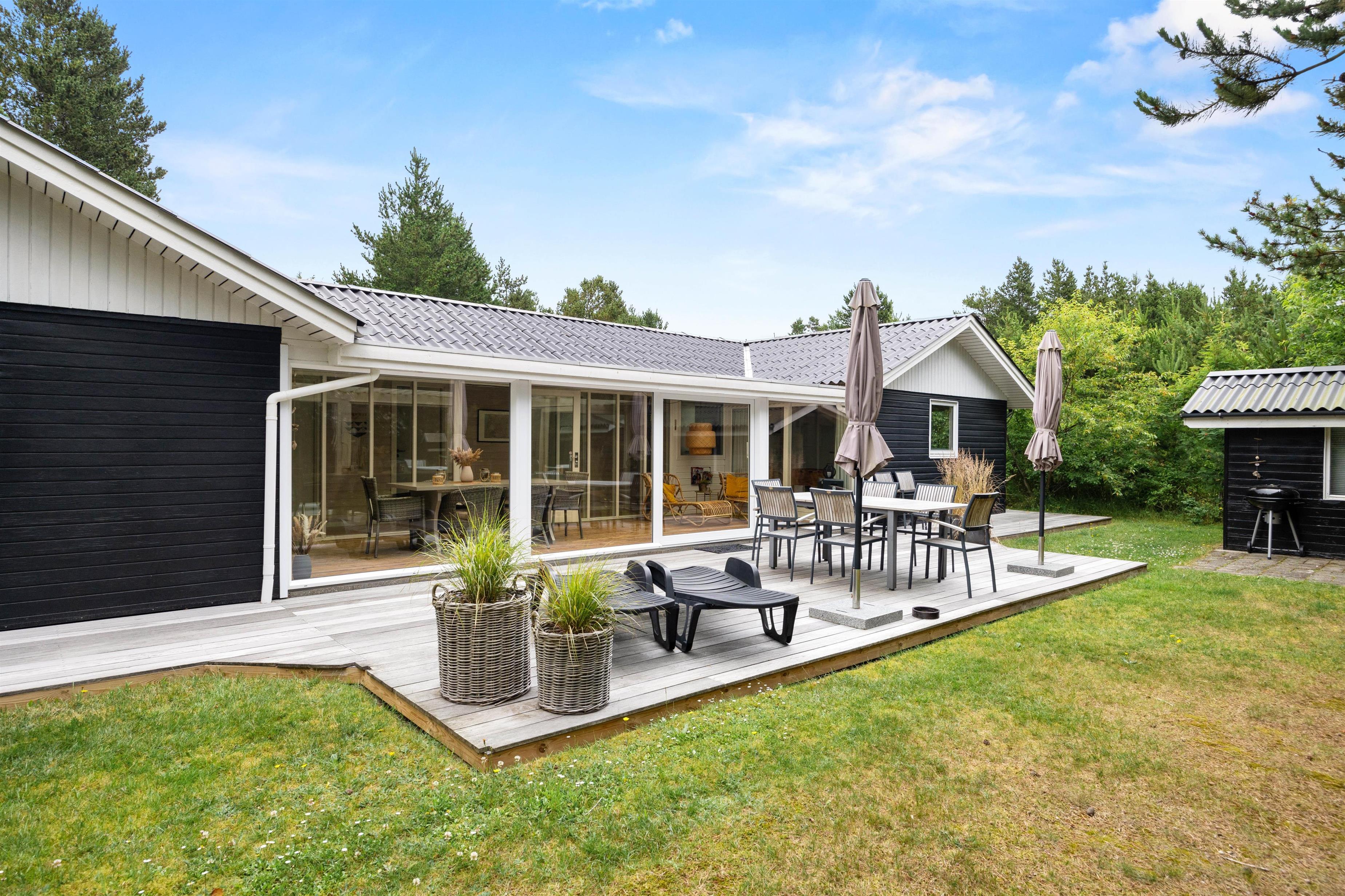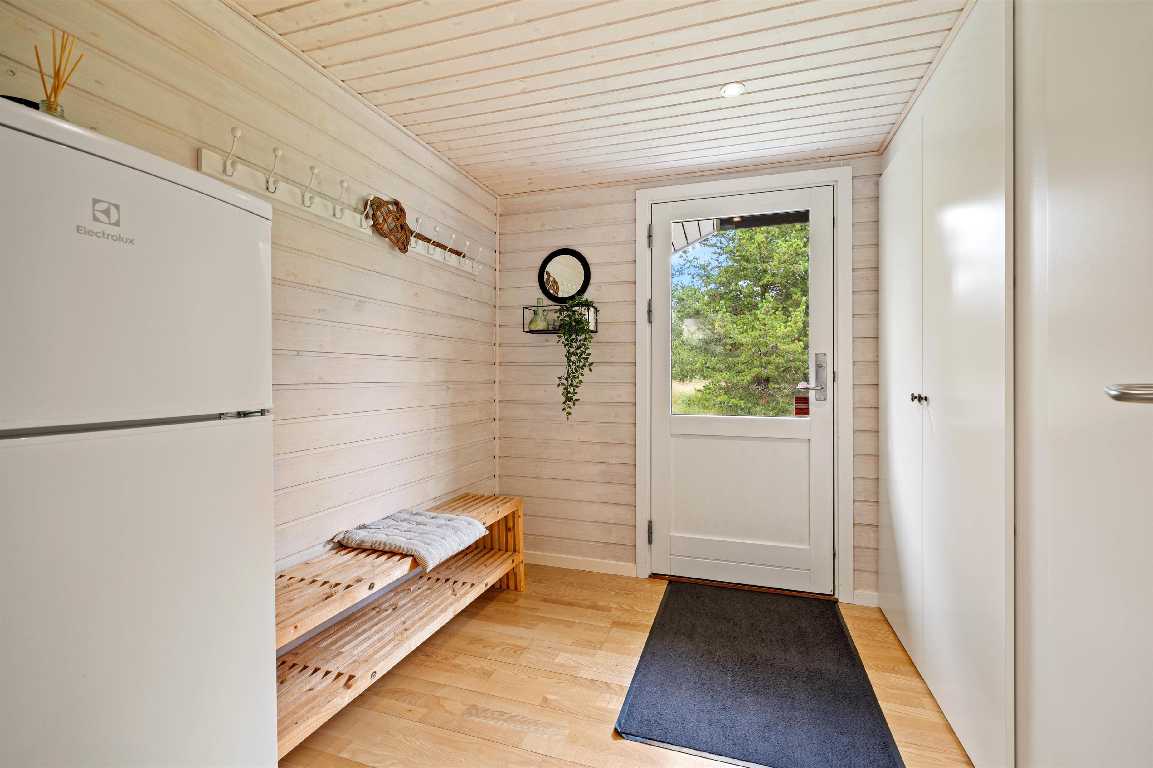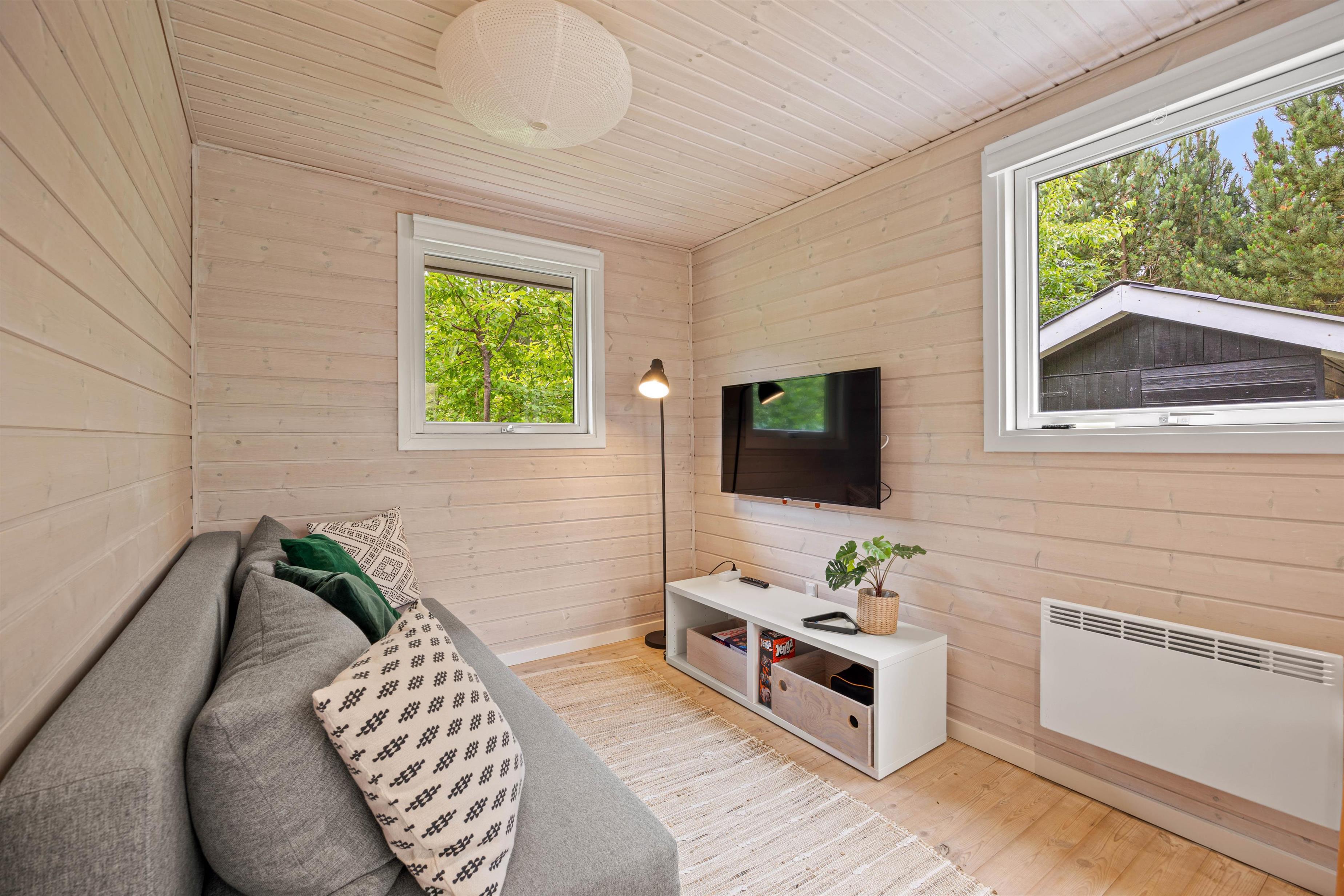 Ikke kun indenfor er huset perfekt til feriehygge. Hele vejen rundt om huset slænger sig en træveranda, så I altid kan finde den perfekte plads i solen. Er vejret lidt drilsk, kan I søge ind i den skønne udestue og derfra nyde lyset og udsigten til naturgrunden, der i øvrigt byder masser af plads til leg for både børn og hund.
