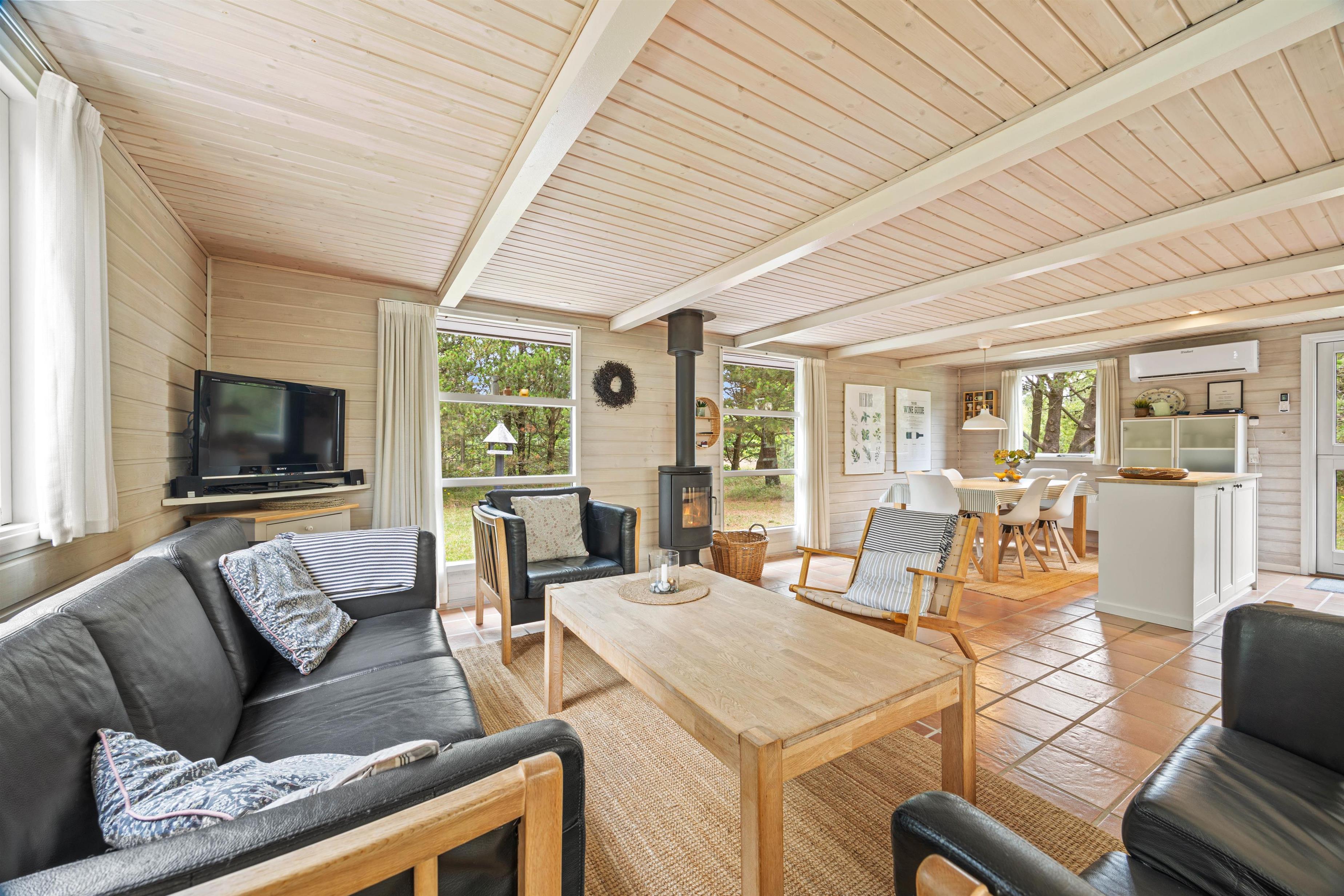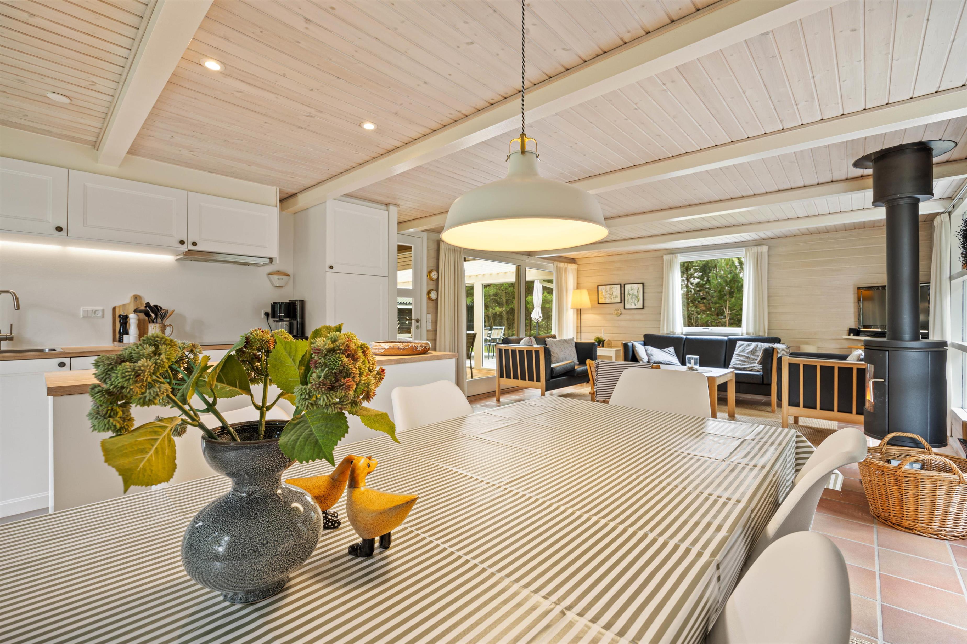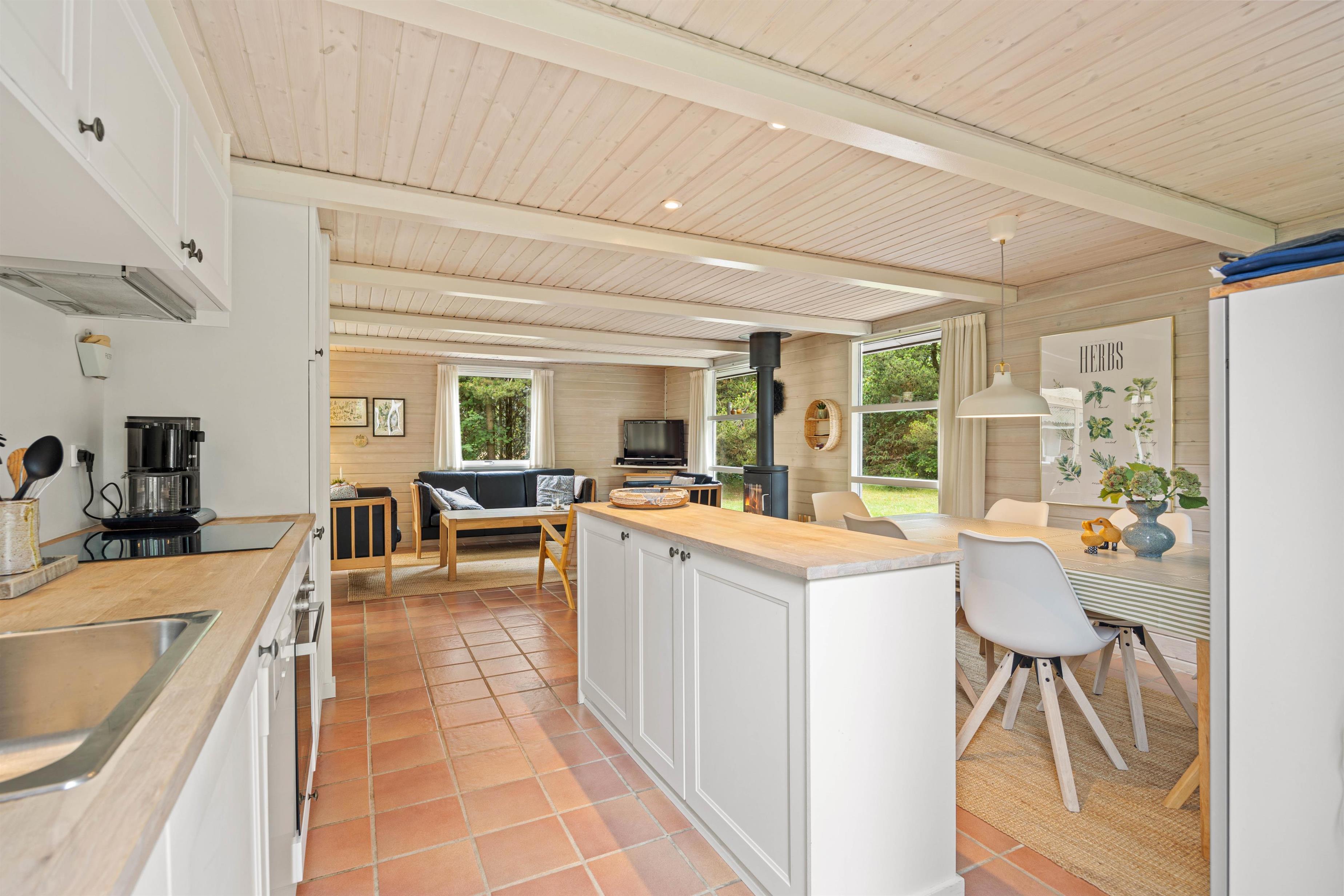 Her er plads til feriehygge for op til 6 personer. Alrummet med det smukke åbne køkken ud mod spisestue og stue emmer af feriehusstemning med hvide trævægge og lofter, store vinduer, der lukker naturen ind i huset og sofahjørnet med den uundværlige brændeovn.