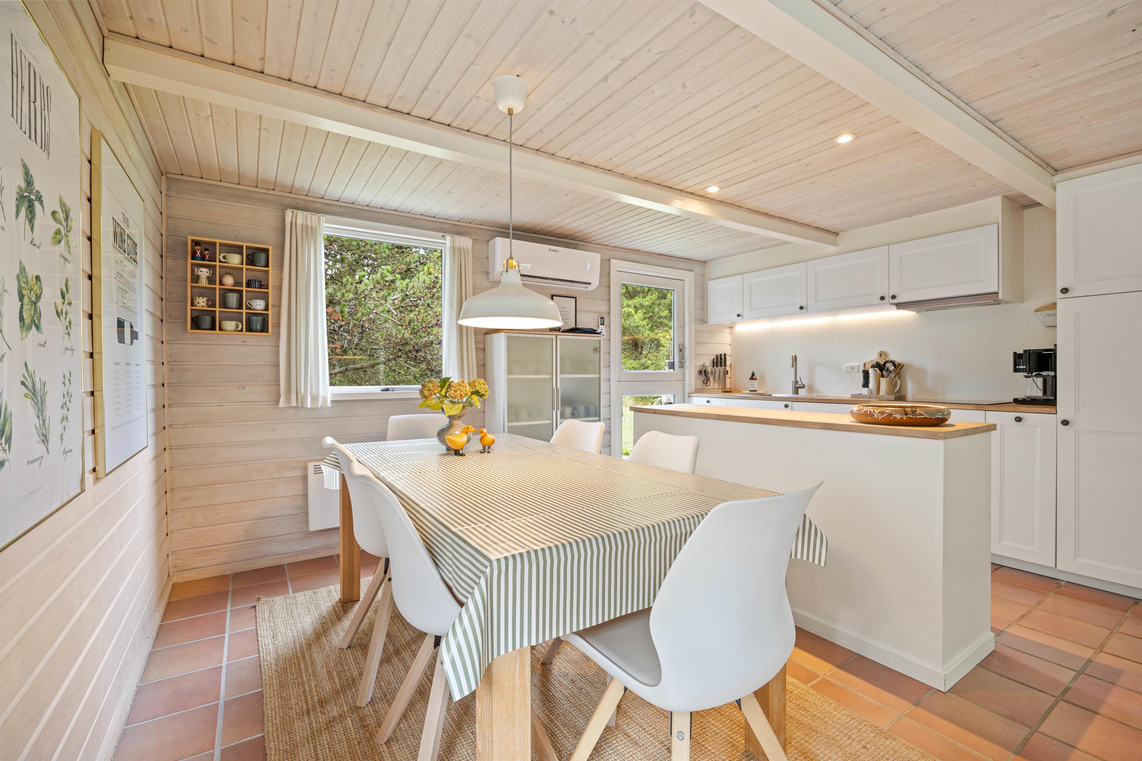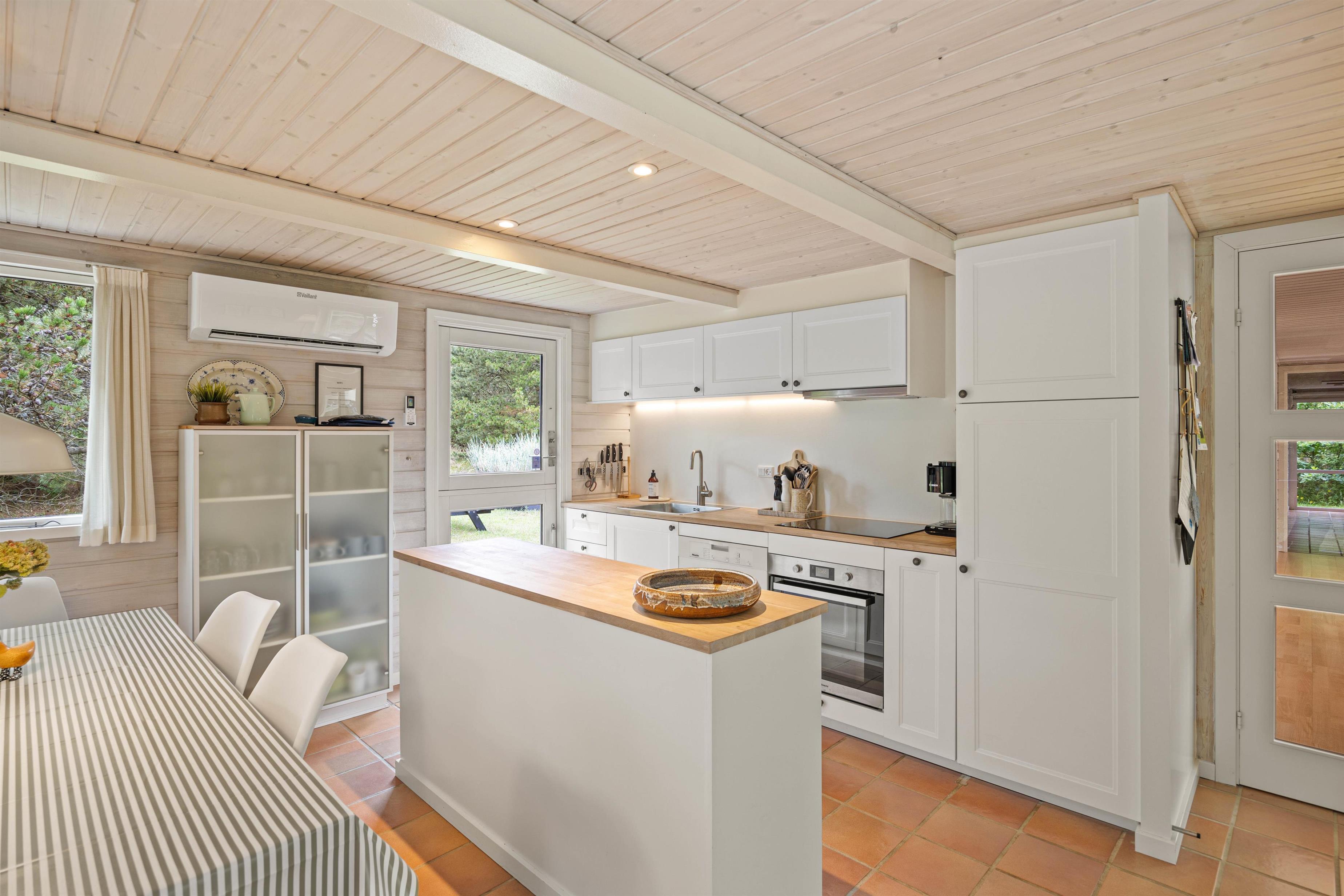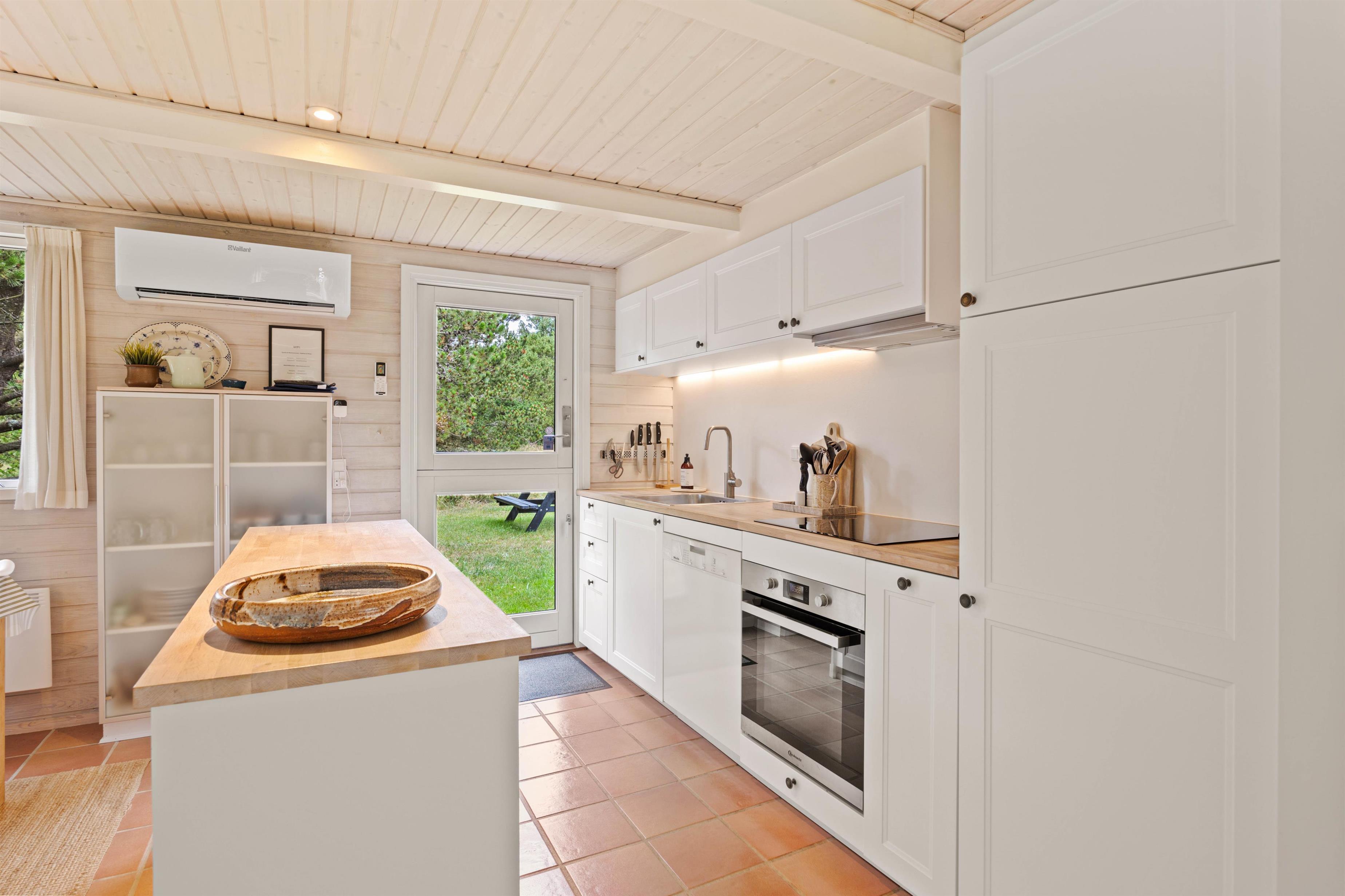 Her er plads til feriehygge for op til 6 personer. Alrummet med det smukke åbne køkken ud mod spisestue og stue emmer af feriehusstemning med hvide trævægge og lofter, store vinduer, der lukker naturen ind i huset og sofahjørnet med den uundværlige brændeovn.