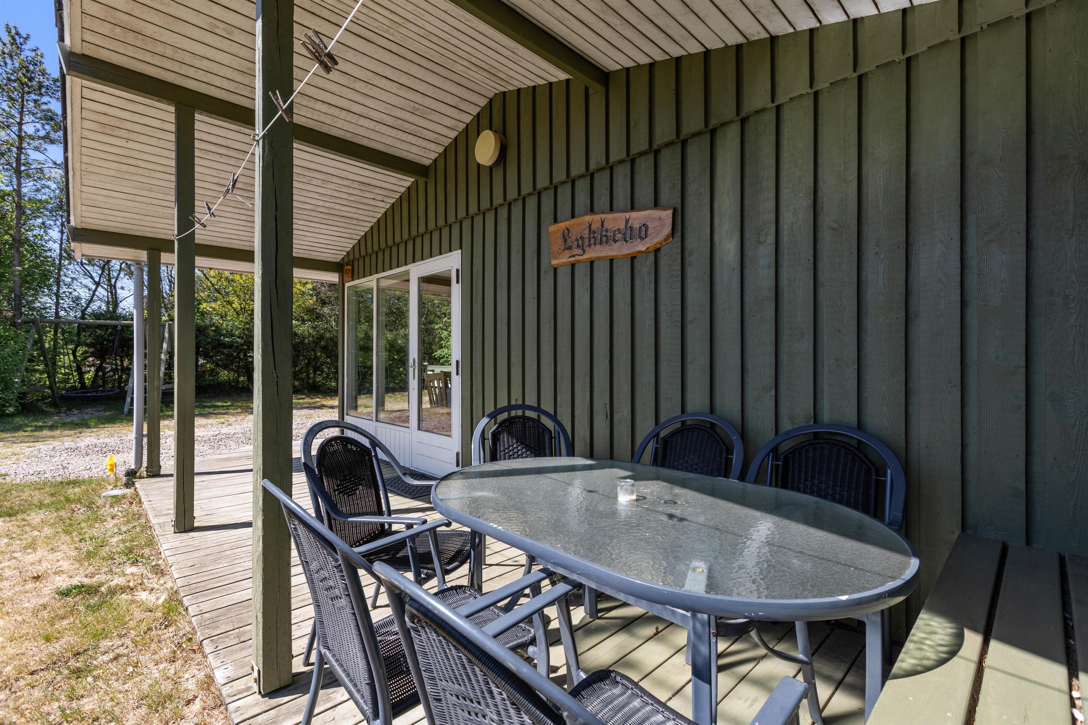 Fra stuen har I ikke kun en god udsigt ud over den omkringliggende natur, men I kan også komme direkte ud på den delvist overdækkede terrasse. Her kan I sidde i god læ om aftenen, tilberede en lækker feriemiddag på grillen og nyde et godt glas rødvin ved siden af.