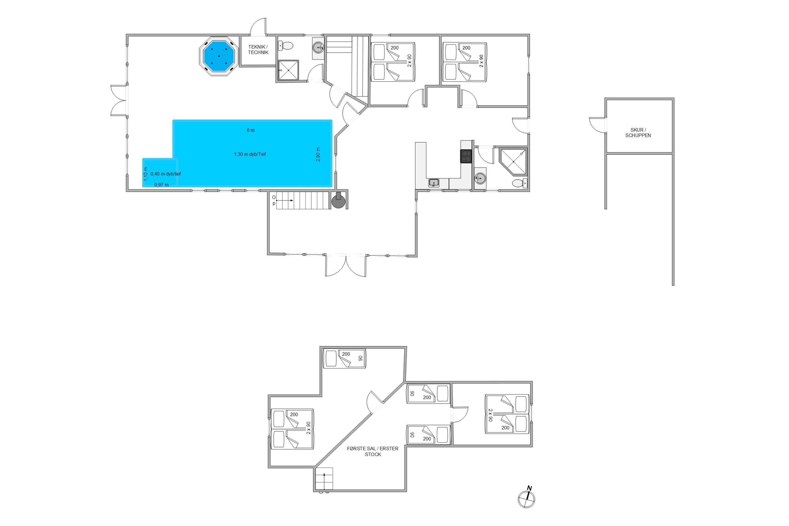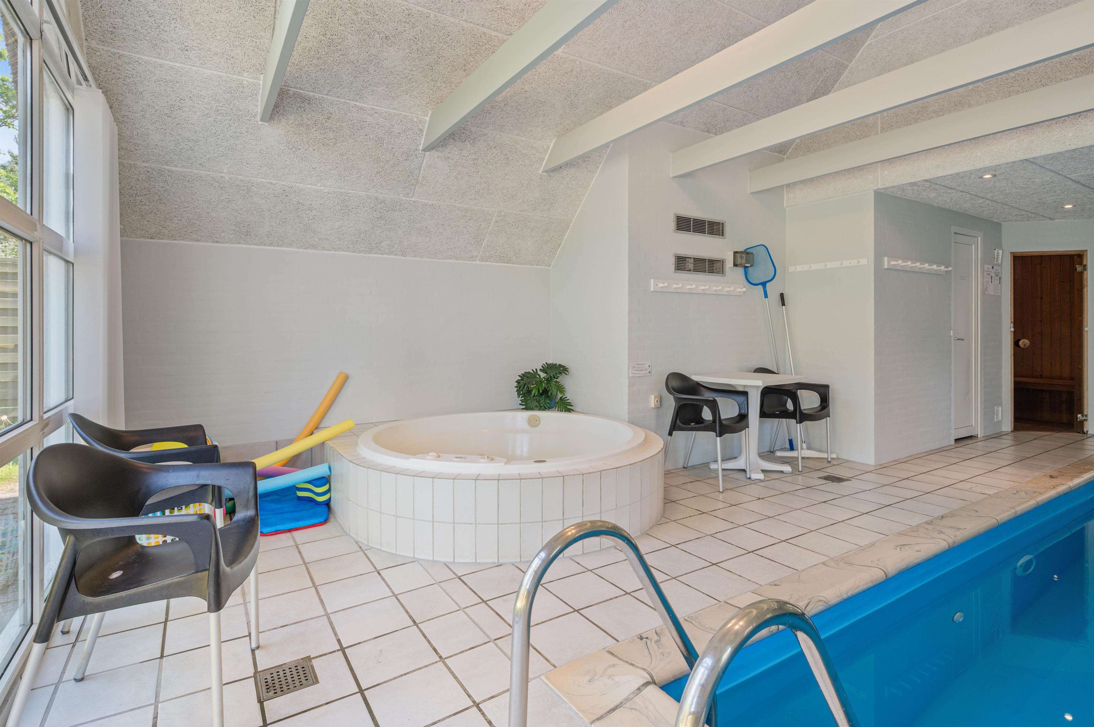 Et af sommerhusets helt store højdepunkter er poolrummet med flot udsigt til skoven. Her venter jer en 16 kvadratmeter stor pool, hvor I kan tilbringe mange underholdende timer med sjov og leg i vandet. Swimmingpoolen har svømmetræner, og så er den op til 1,40 dyb. I direkte forbindelse med poolen er der et 1x1 m babybassin.