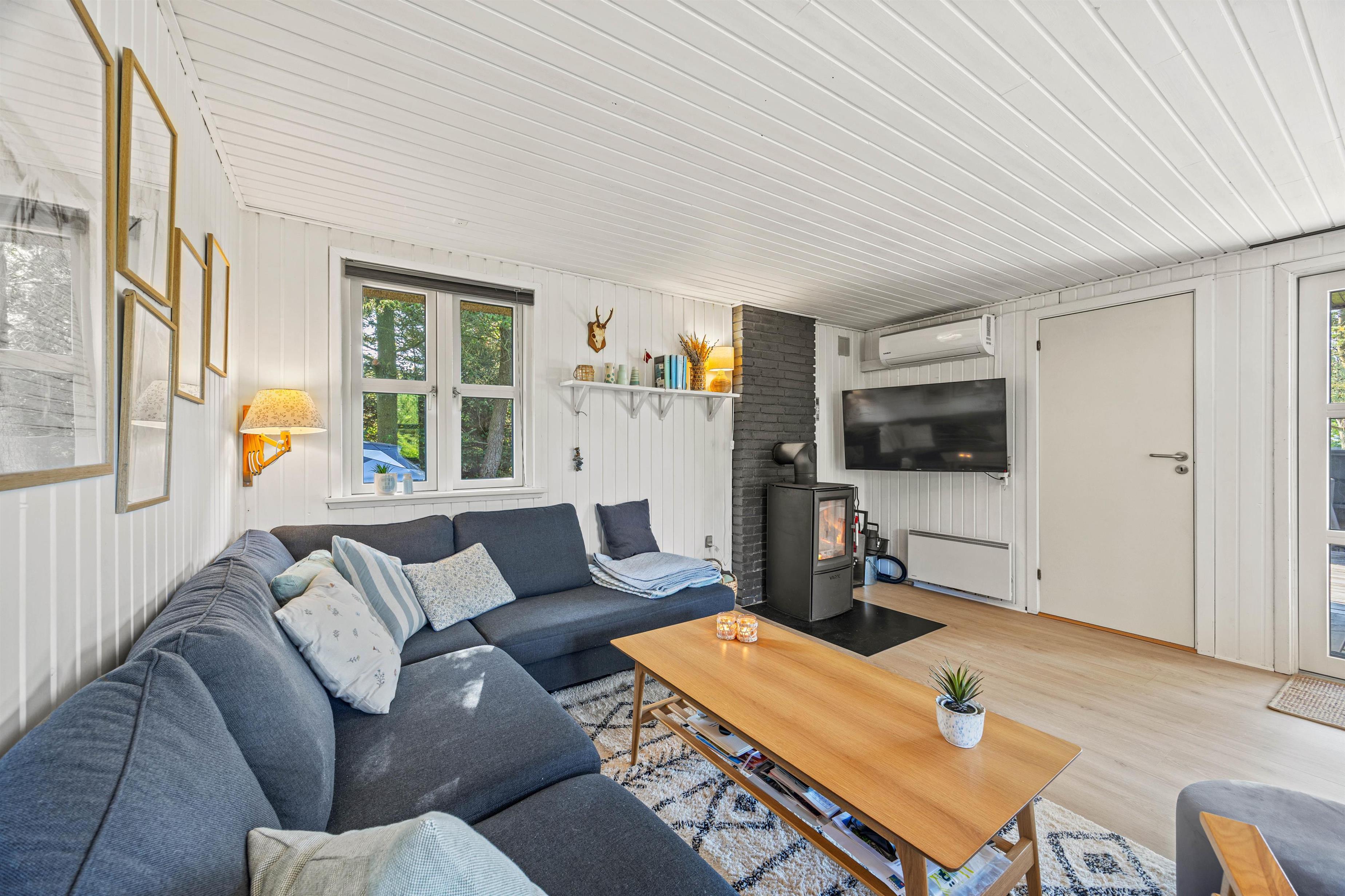 På sofaen kan I samles til et spil kort, se en spændende film, eller læse en god bog i fred og ro, mens den knitrende brændeovn i baggrunden fylder rummet med varme og god stemning. Her finder I også den energibesparende og behagelige varmepumpe.