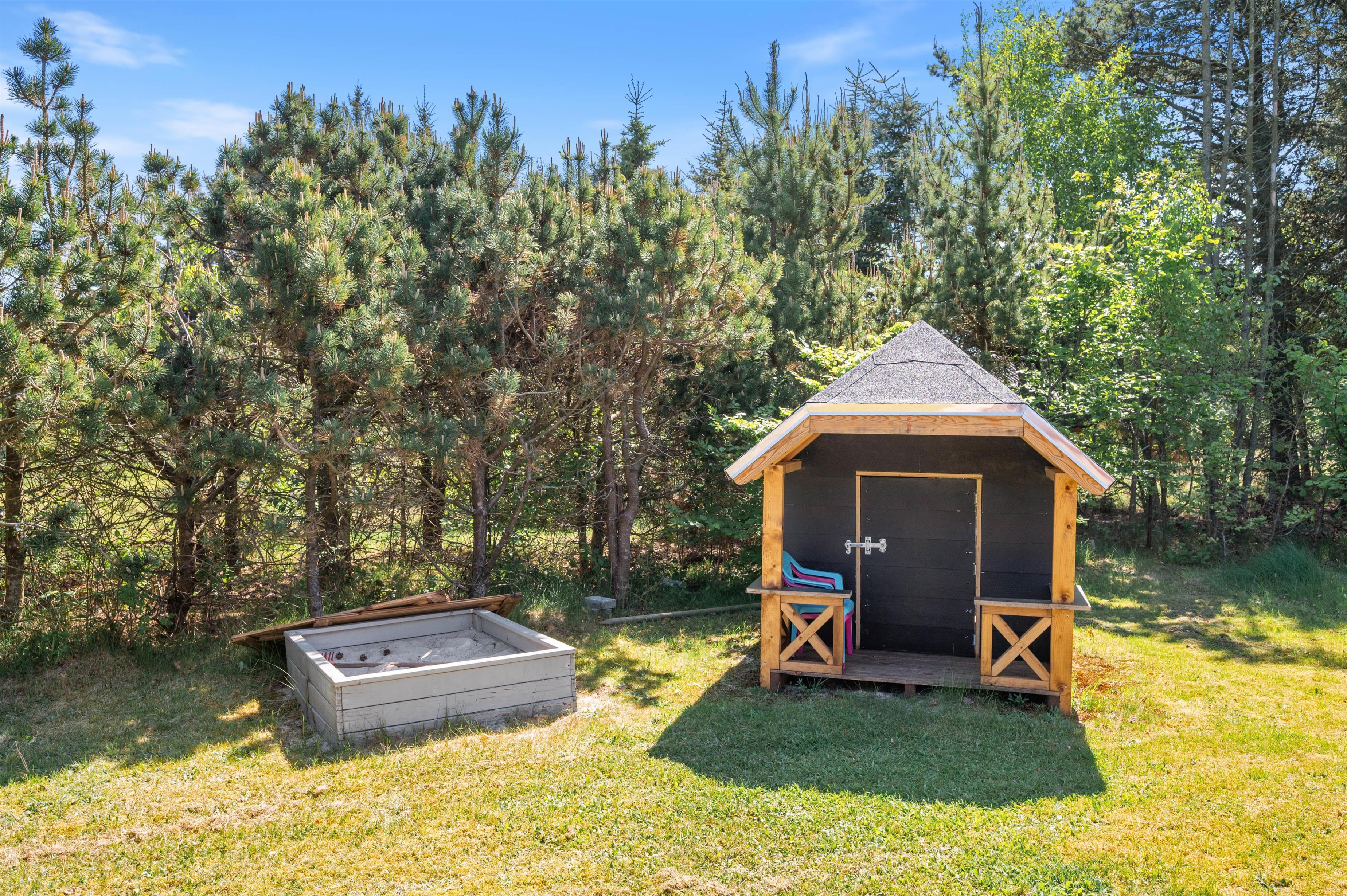 Sommerhuset ligger på en skøn 1.720 m2 stor, lukket grund, som er omkranset af træer og buske. Det giver læ, så I kan nyde jeres ferie i fred og ro. Huset har flere terrasser, så I har mulighed for at finde sol og læ.
