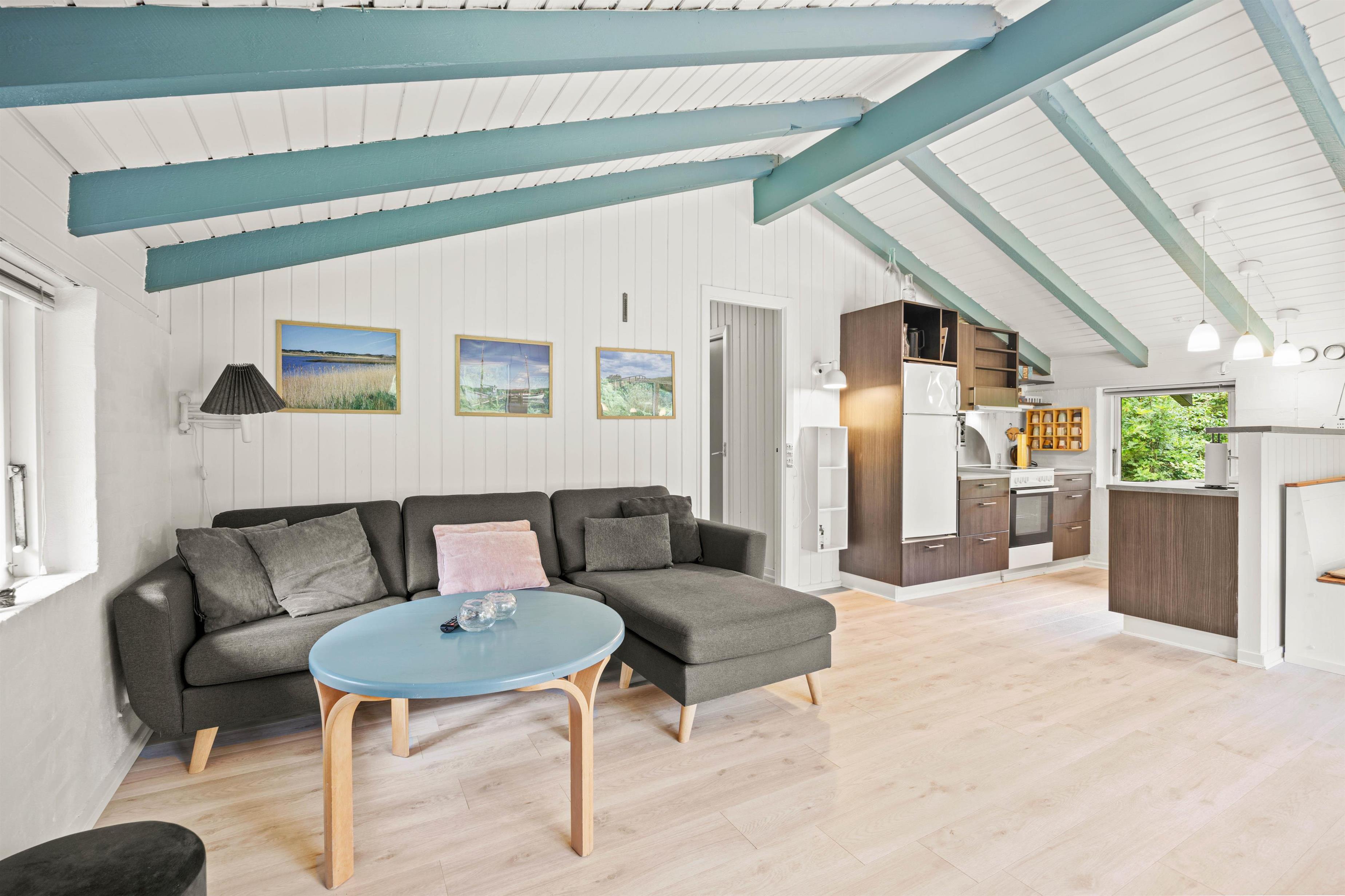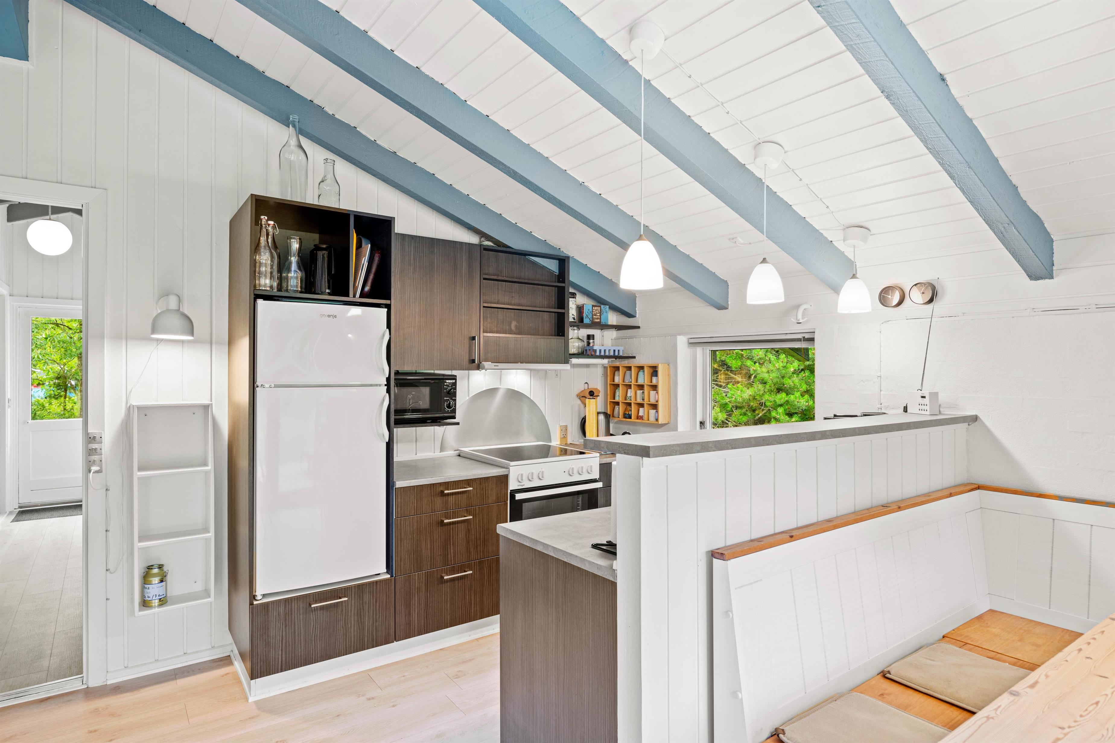 Køkkenet ligger i åben forbindelse med stuen. Køkkenet er udstyret med mikroovn, opvaskemaskine og en lille fryser. Her vil I helt sikkert kunne fremtrylle mange lækre måltider. I sommerhuset er der selvfølgelig en hyggelig spiseplads og en stor sofa, der inviterer til afslapning. De store vinduespartier i stuen giver masser af lysindfald, så rummet fremstår meget større. I det ene hjørne af stuen står brændeovnen, som vil sikre en hyggelig ferie og samtidig sprede varmen i huset. På de køligere dage kan I hurtigt varme sommerhuset op med den energibesparende varmepumpe.