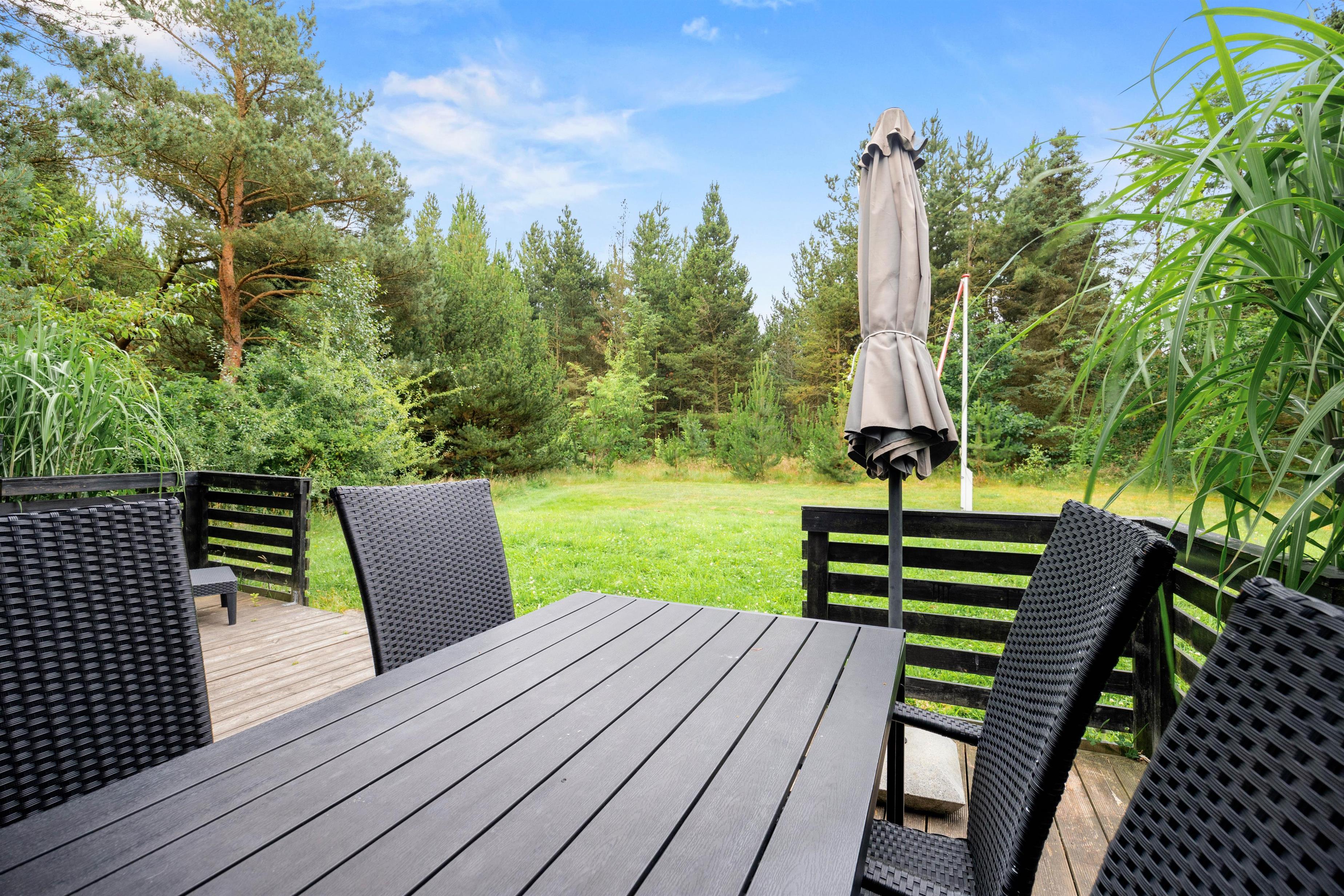 Fra stuen kommer I direkte til terrassen, hvor I uforstyrret kan nyde freden og roen. Der er behagelige havemøbler og liggestole, så I virkelig kan lade batterierne op og komme udhvilet tilbage fra ferien. I kan afslutte aftenen med et måltid fra grillen, mens solen langsomt går ned og fuglene kvidrer i trætoppene.