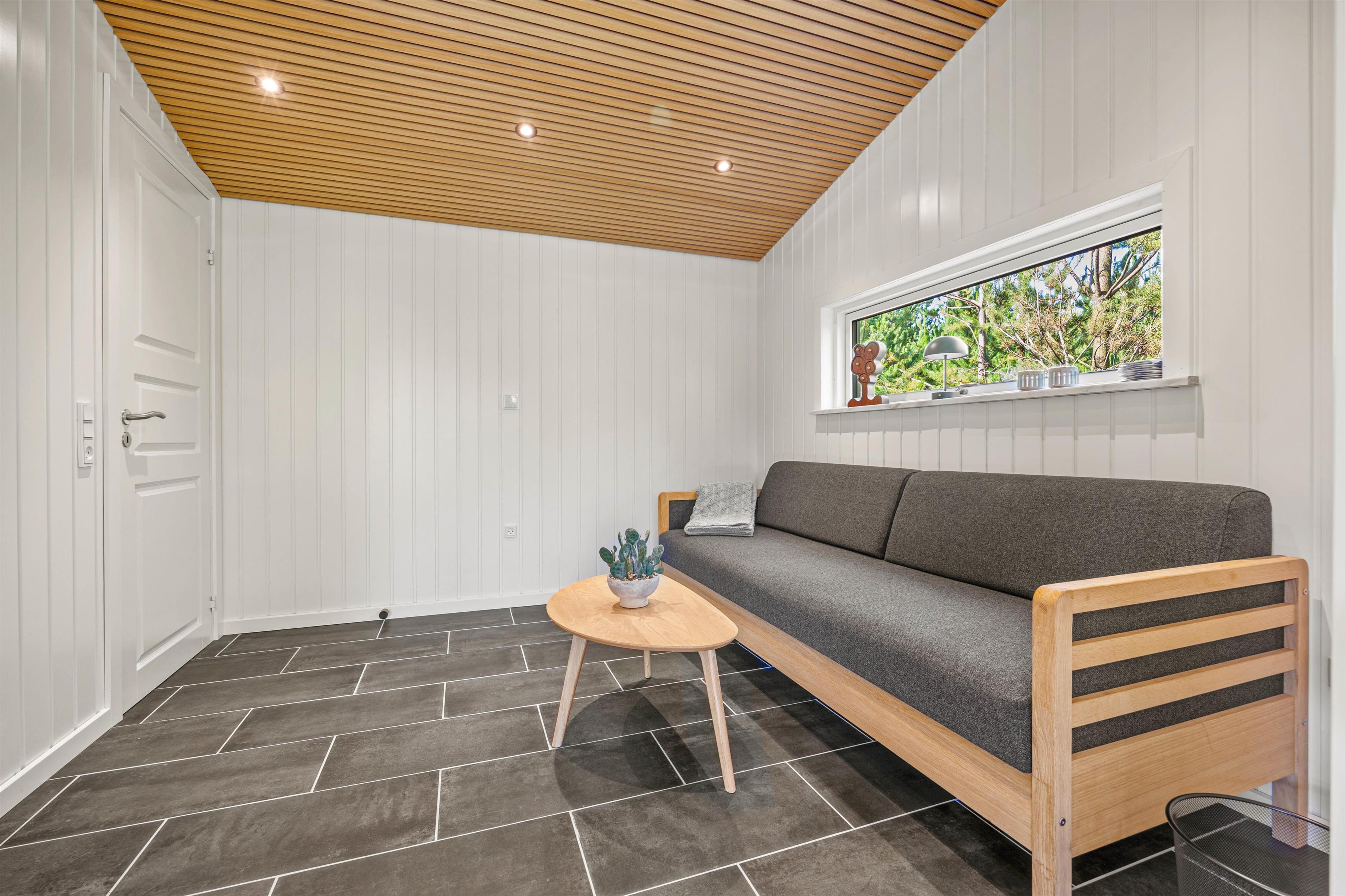 Opholdsrummet er husets hjerte: et harmonisk og elegant samspil mellem køkken og stue, hvor store vinduespartier inviterer naturen indenfor. Brændeovnen og de rolige farvetoner skaber varme og hygge – og den direkte adgang til den afskærmede træterrasse giver jer det bedste fra begge verdener - indendørs komfort og udendørs nydelse.
