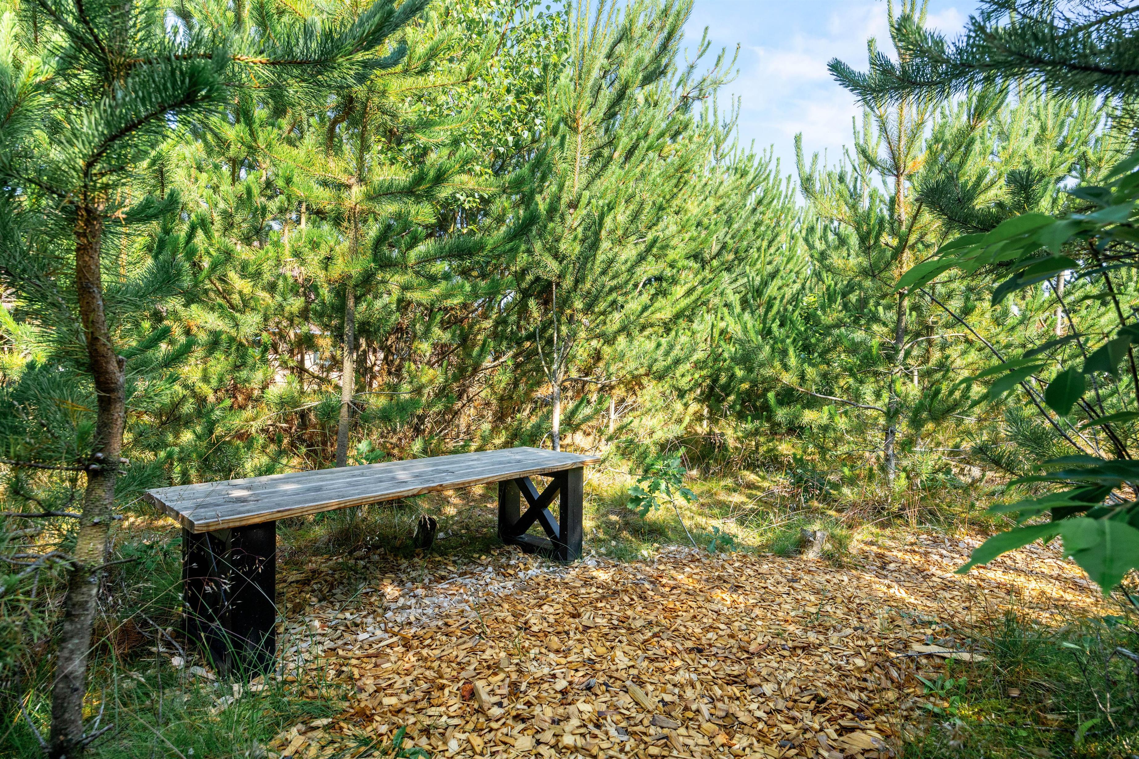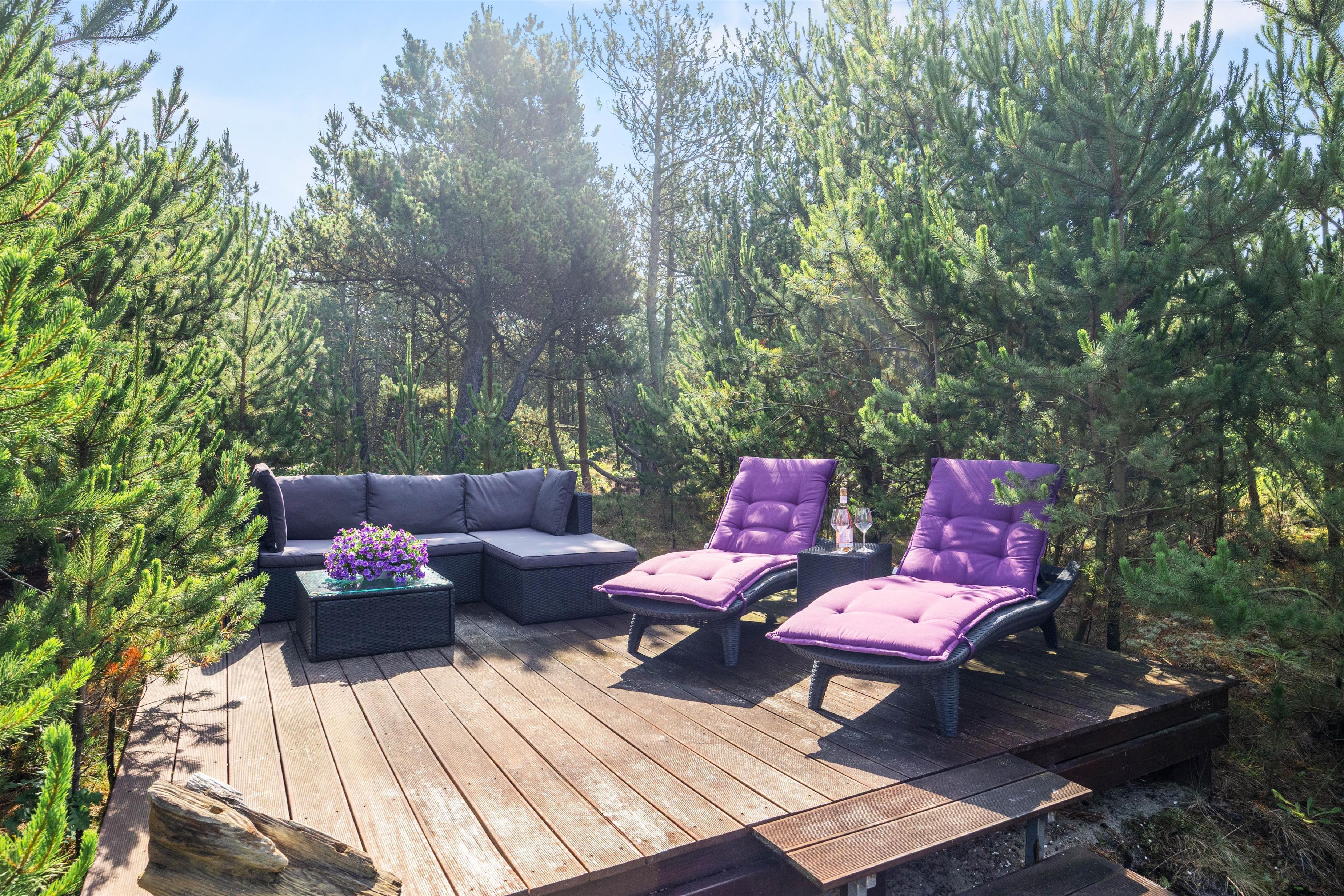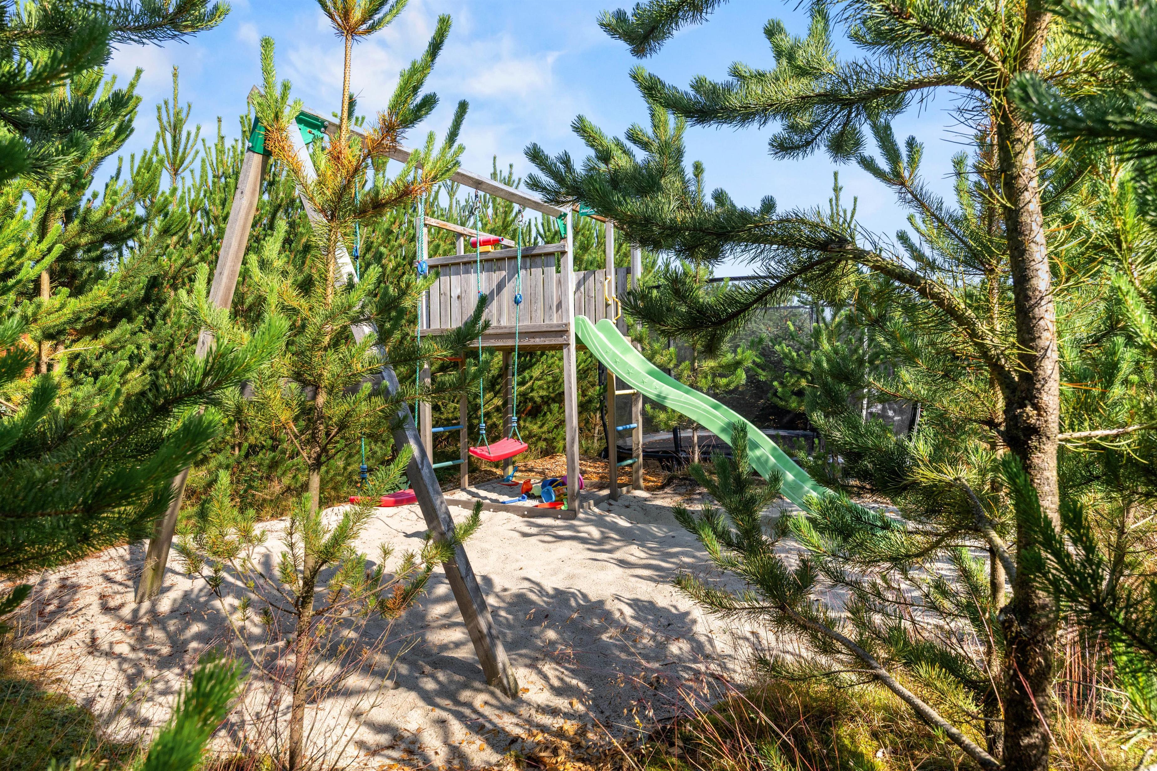 Haven er et kapitel for sig. Her ligger huset trygt på en let kuperet grund med masser af plads til leg og ro. Terrassen indbyder til solbadning, grillmiddage og afslapning i det lækre loungeområde. For børnene venter trampolin, gynger og rutsjebane – og for de voksne er der wellness under åben himmel med vildmarksbad med dyser, udesauna og udebruser (udebruser kan benyttes fra april til november). På grunden er der også bålsted, så I kan riste skumfiduser, mens flammerne fortryller jer. Det er feriestemning på første klasse.