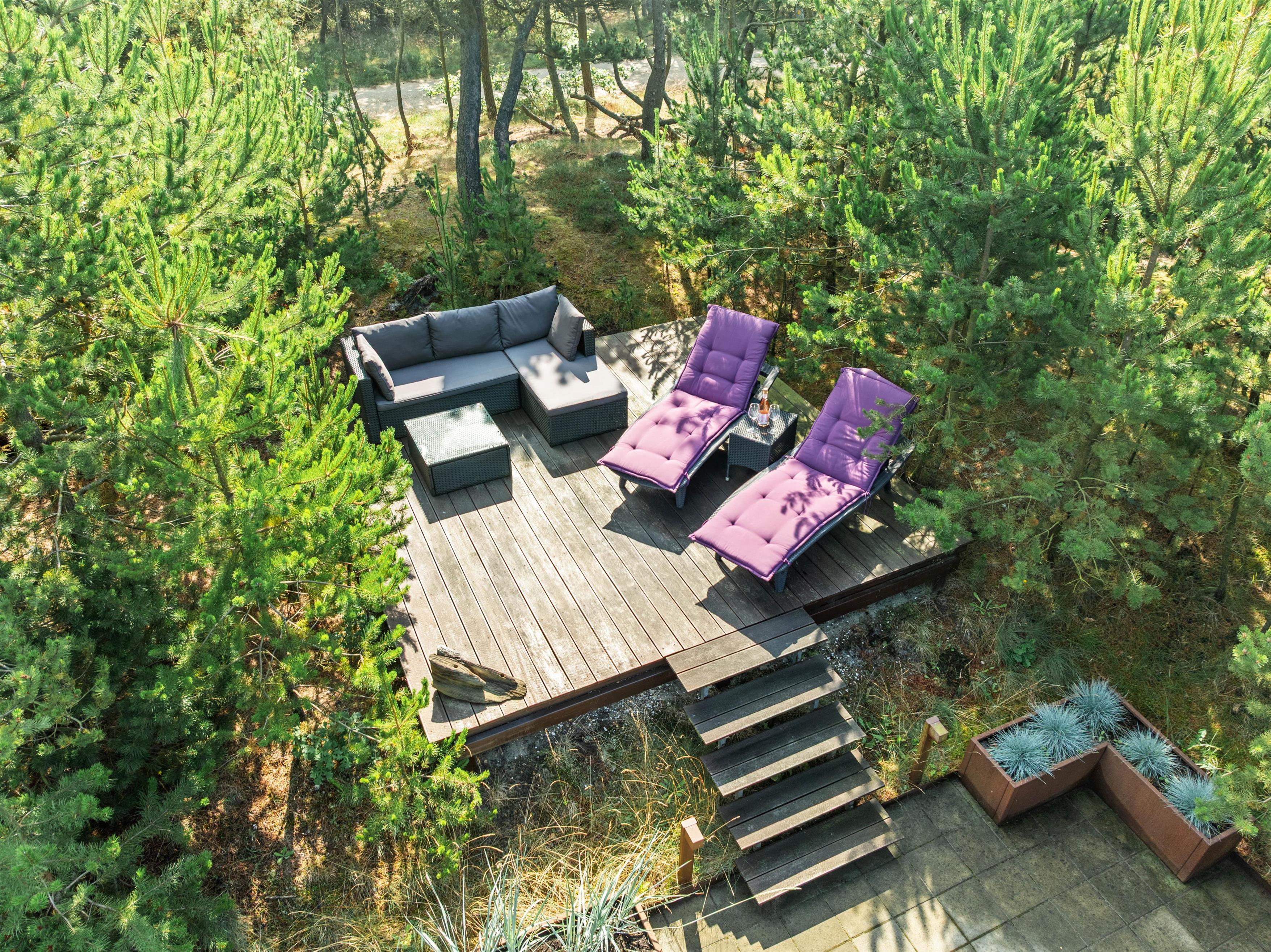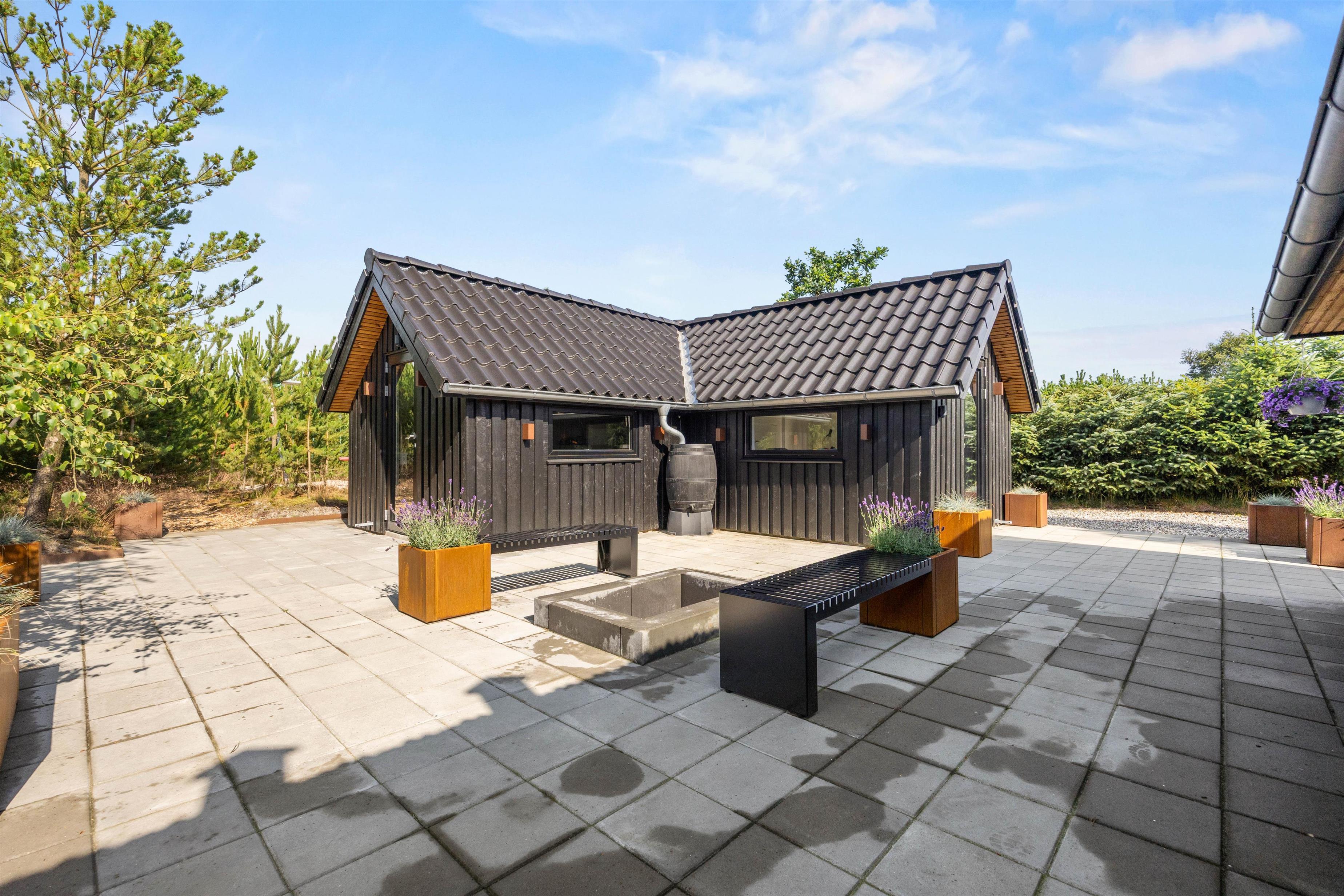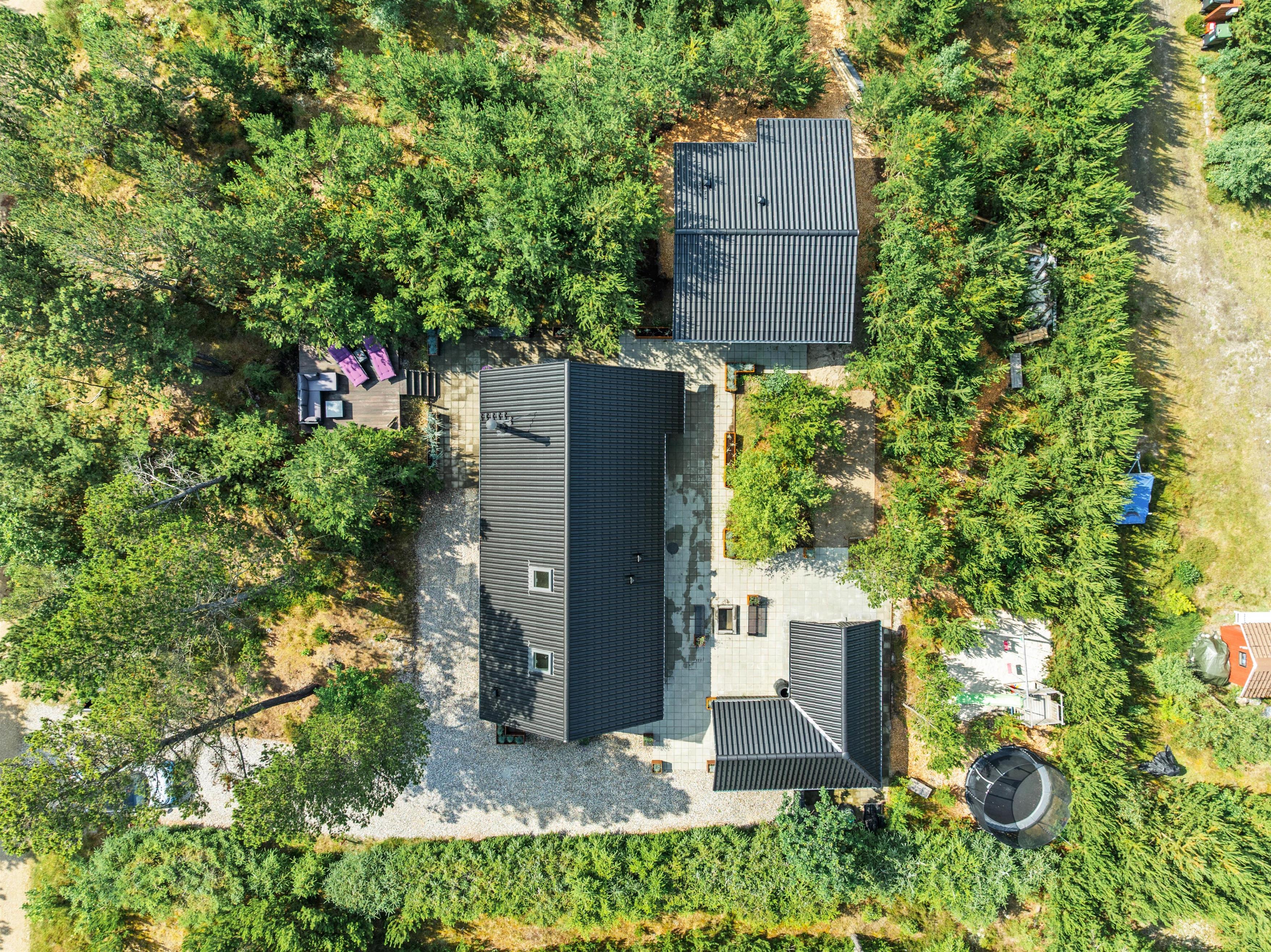 Haven er et kapitel for sig. Her ligger huset trygt på en let kuperet grund med masser af plads til leg og ro. Terrassen indbyder til solbadning, grillmiddage og afslapning i det lækre loungeområde. For børnene venter trampolin, gynger og rutsjebane – og for de voksne er der wellness under åben himmel med vildmarksbad med dyser, udesauna og udebruser (udebruser kan benyttes fra april til november). På grunden er der også bålsted, så I kan riste skumfiduser, mens flammerne fortryller jer. Det er feriestemning på første klasse.