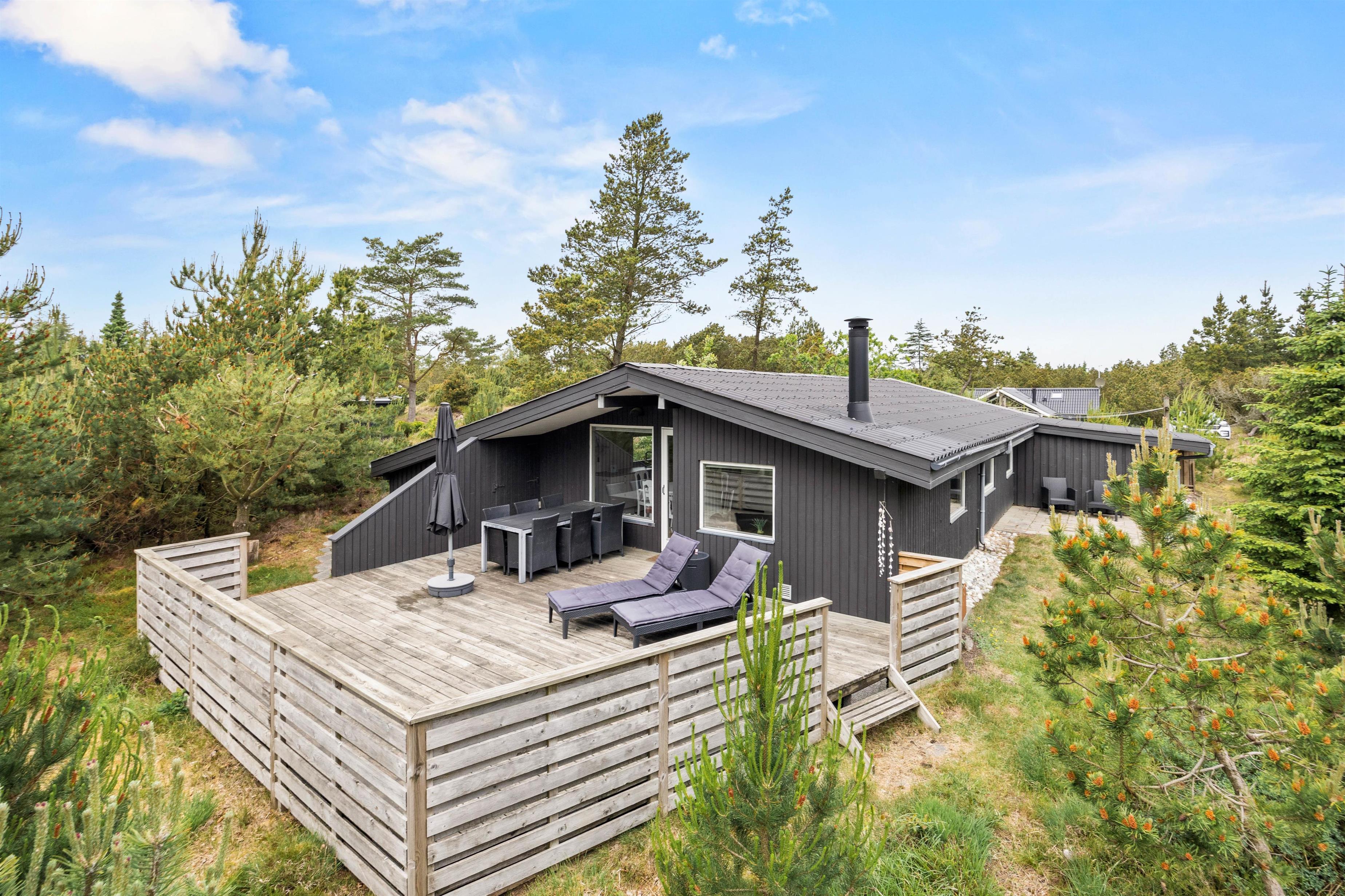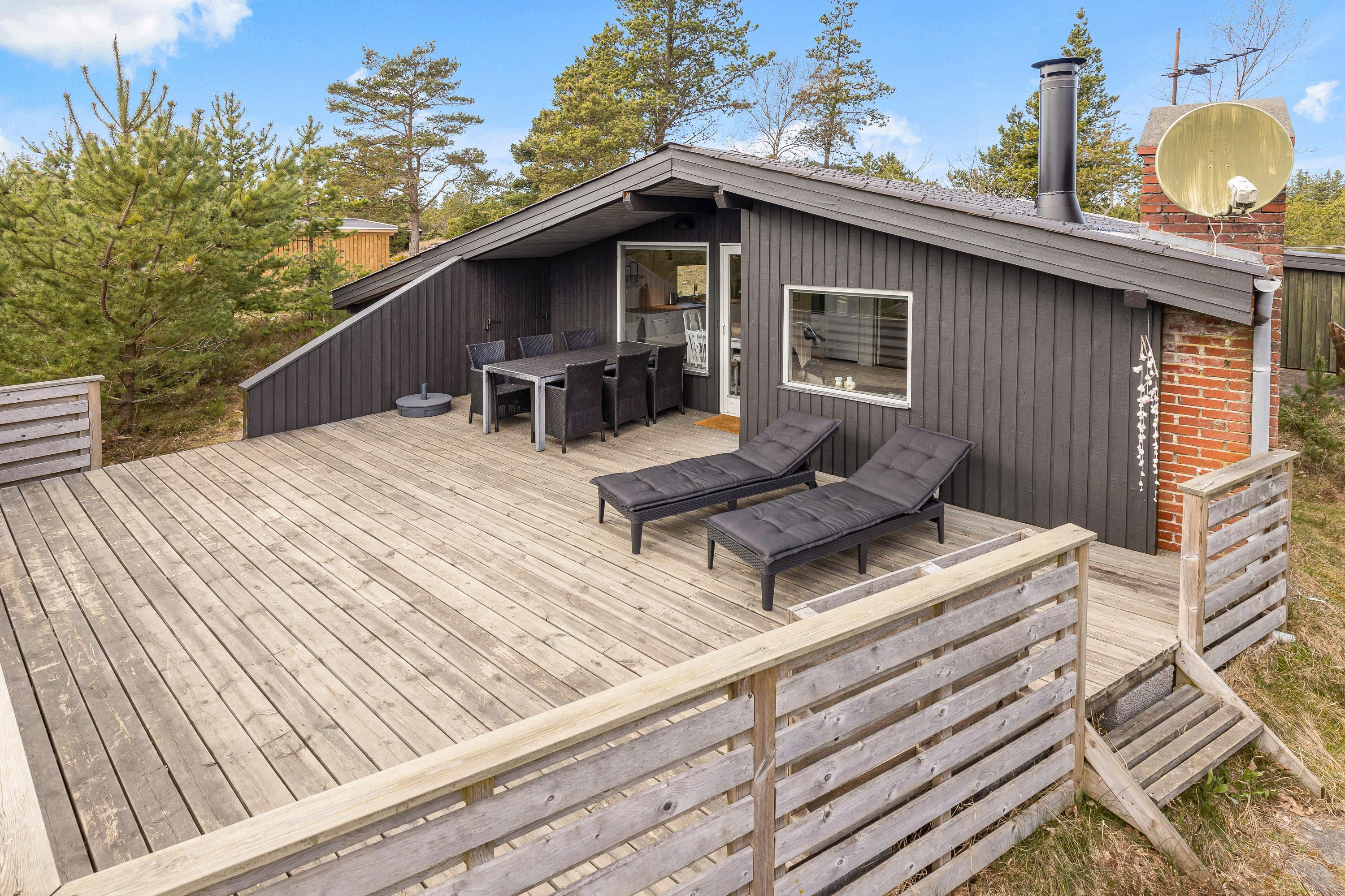 Feriehuset har selvfølgelig også et dejligt udeområde og er omringet af høje træer. Terrassen som er afskærmet, ligger bag feriehuset, så I kan være udenfor i fred og ro. Terrassen er veludstyret, med gode havemøbler, solvogne og en grill, så I har mulighed for at tilberede jeres aftensmad på den. Er solen for skrap er der også sørget for en parasol, som I kan søge ly under.
