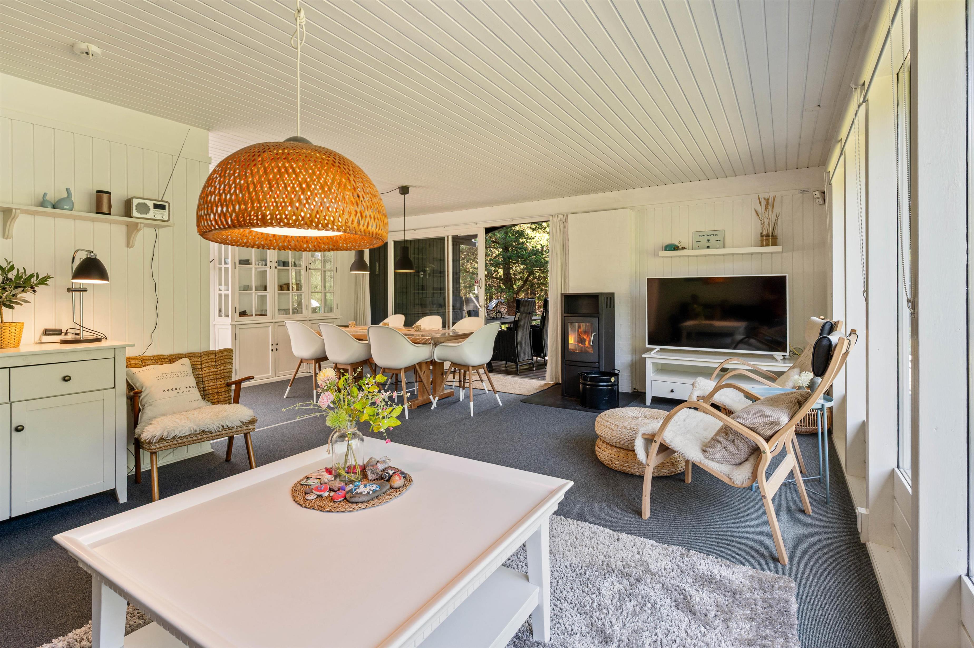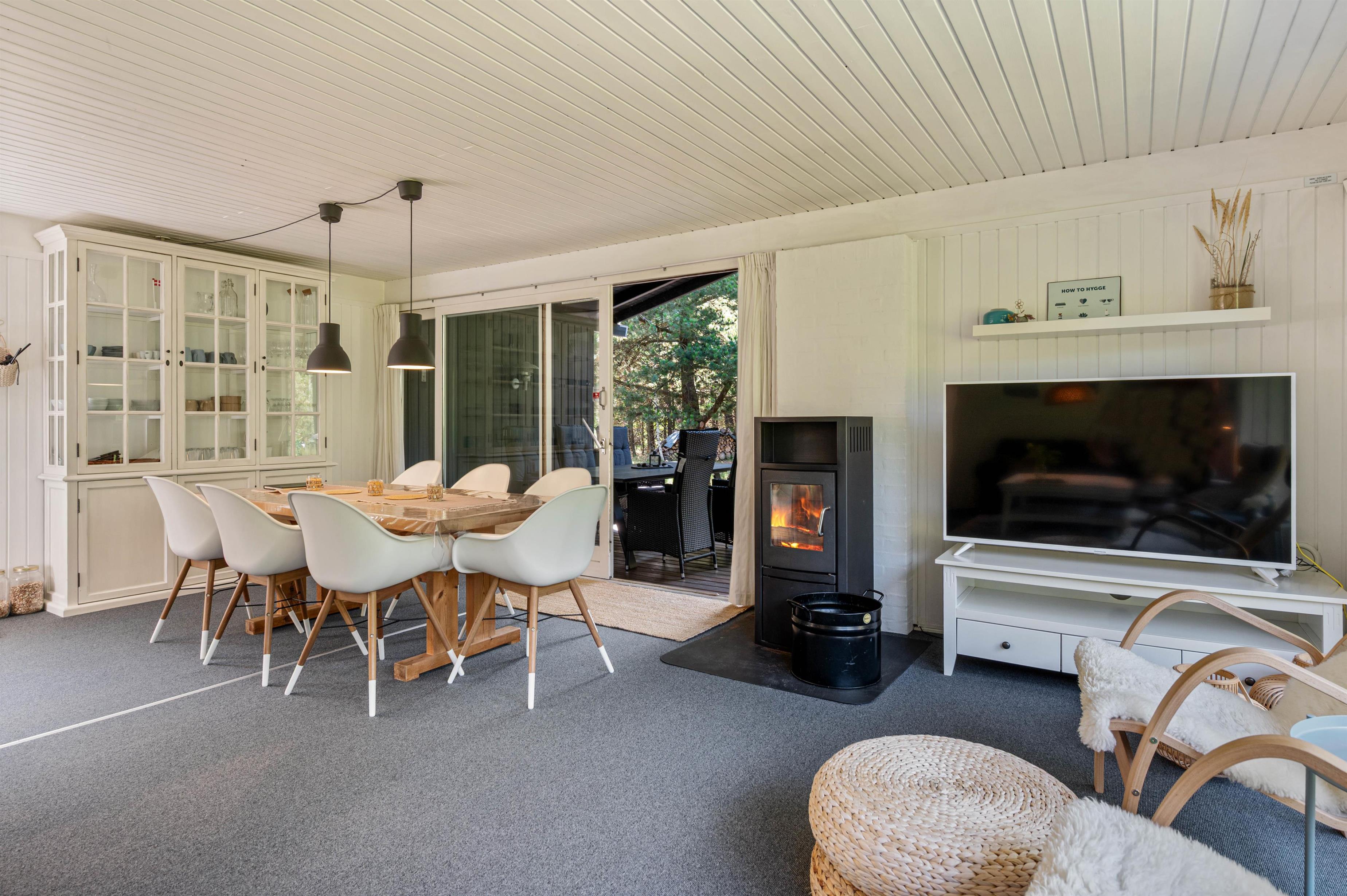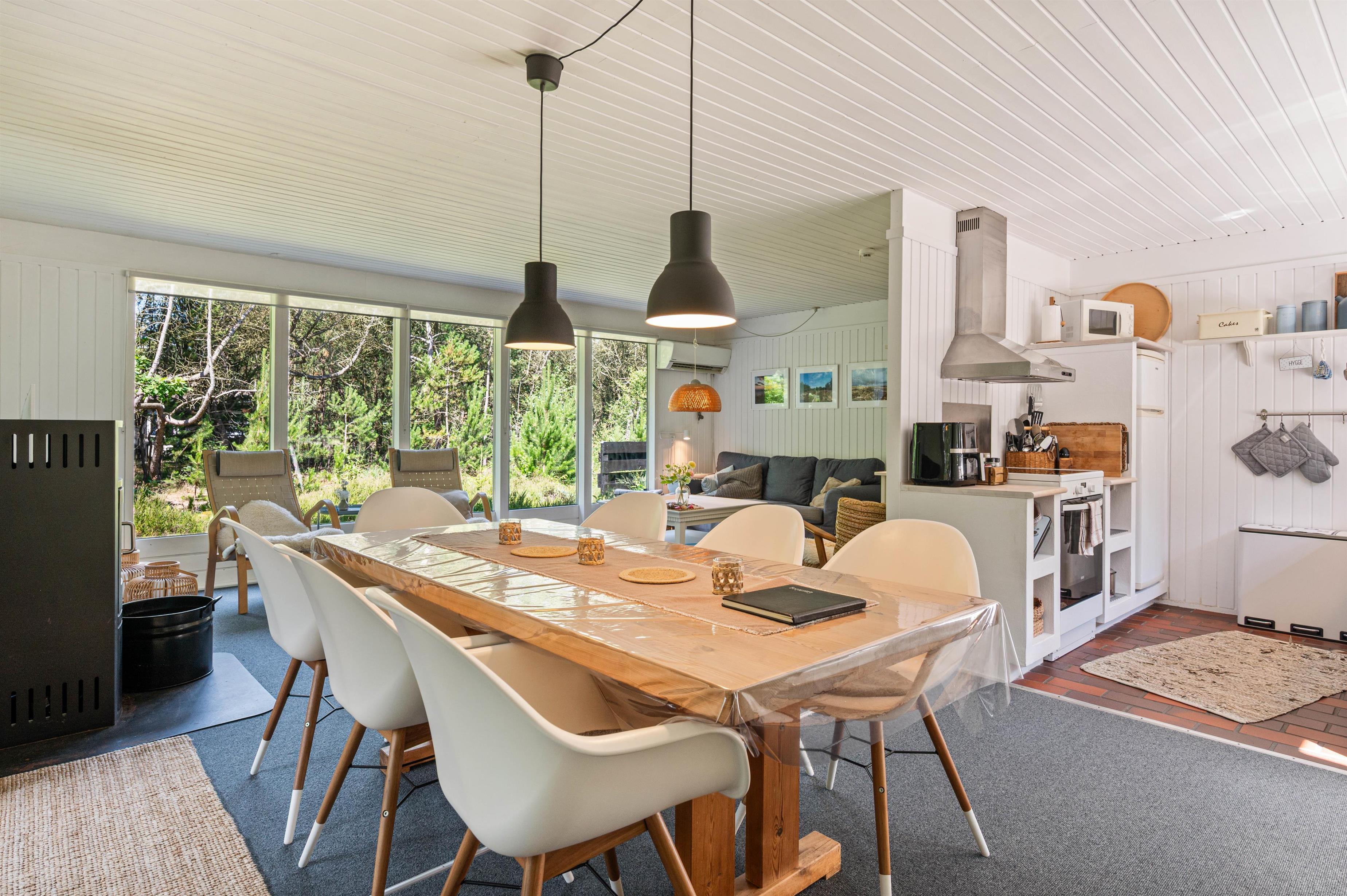 I det lyse åbne køkken finder I alt til tilberedelsen af lækre måltider, og imens opvaskemaskinen klarer resten, kan familien samles til lange sjove spilleaftener ved det store spisebord. For den perfekte stemning, kan der tændes op i den store brændeovn, der er centralt placeret i stue-alrummet.