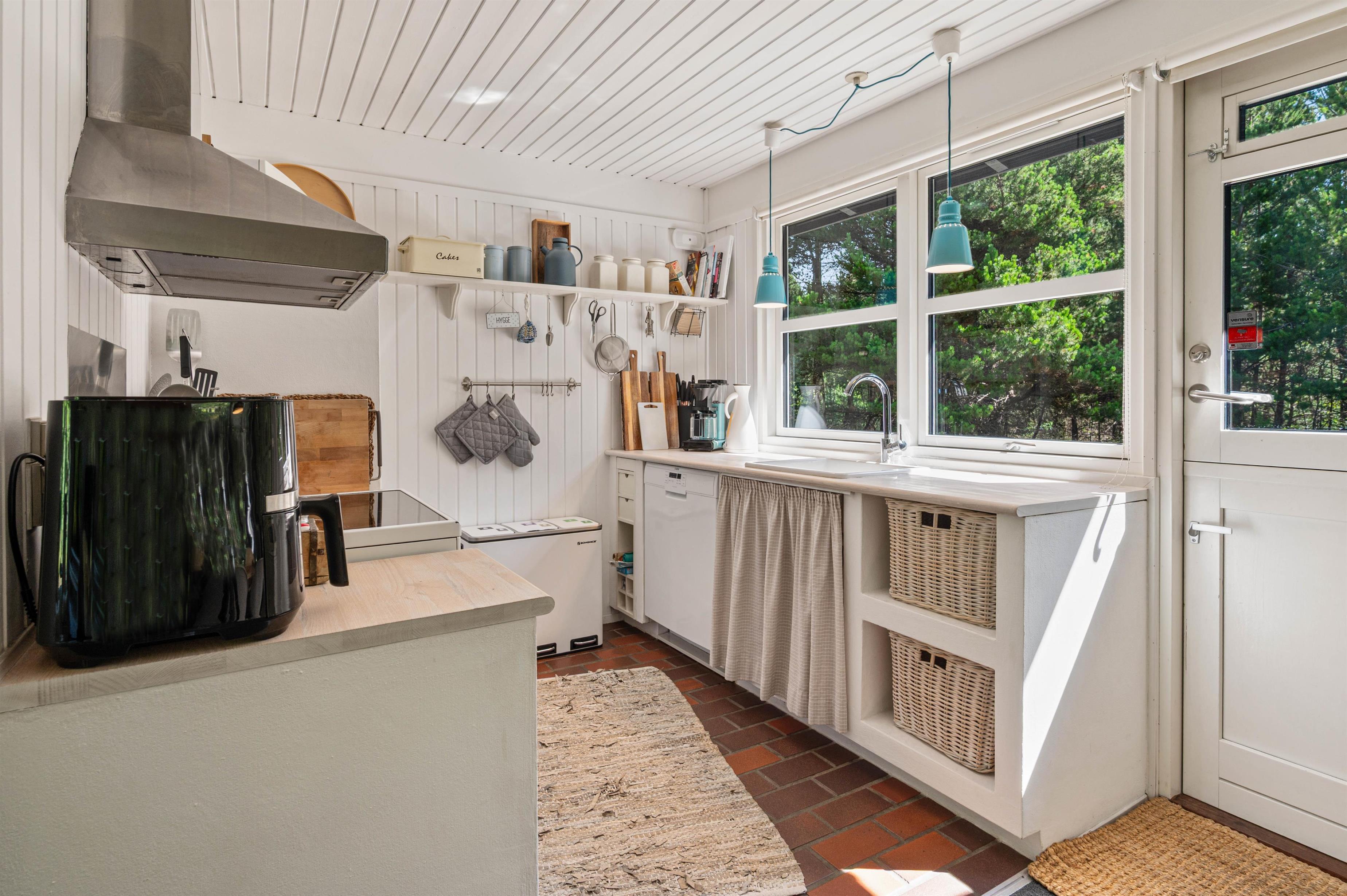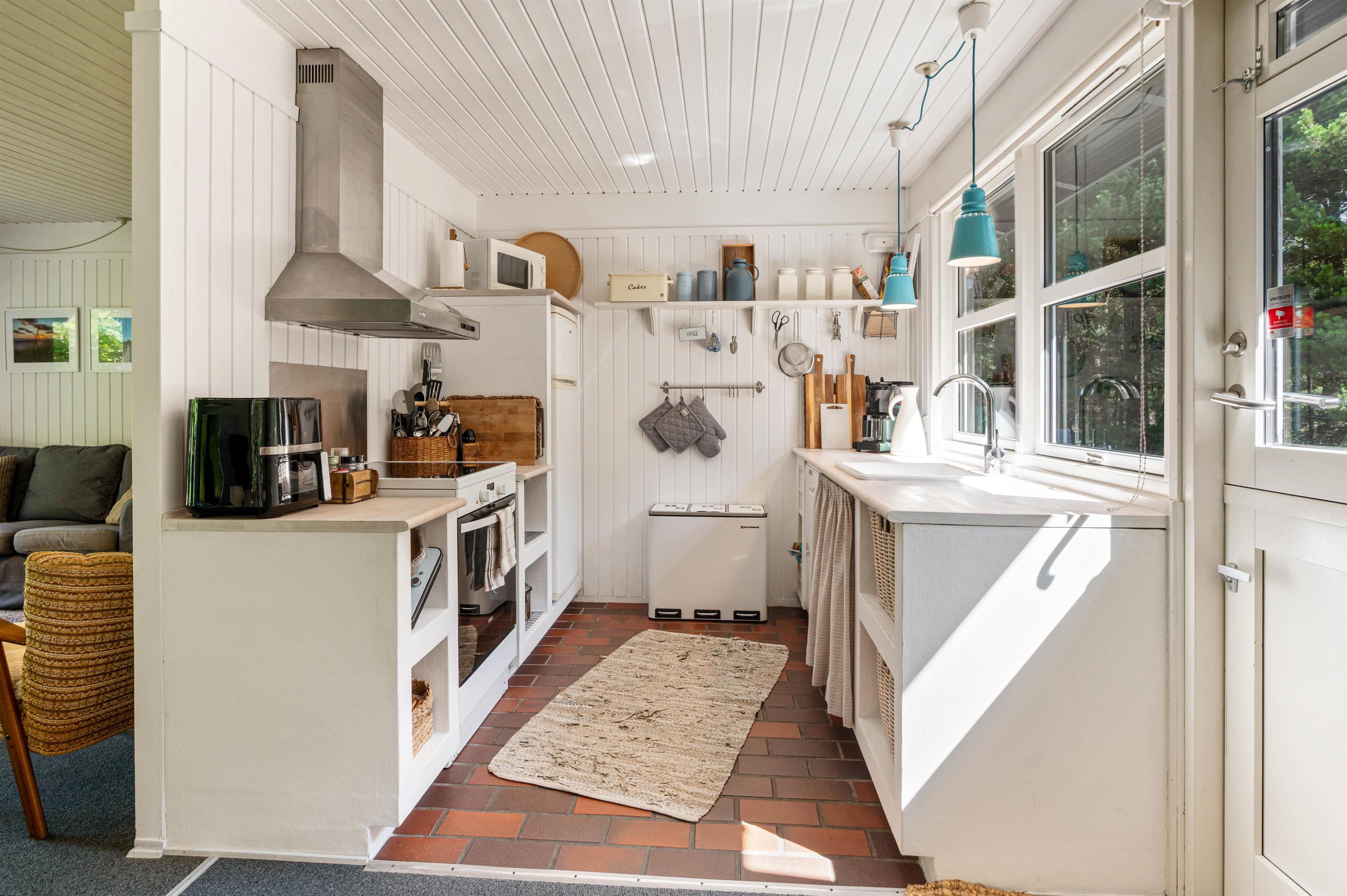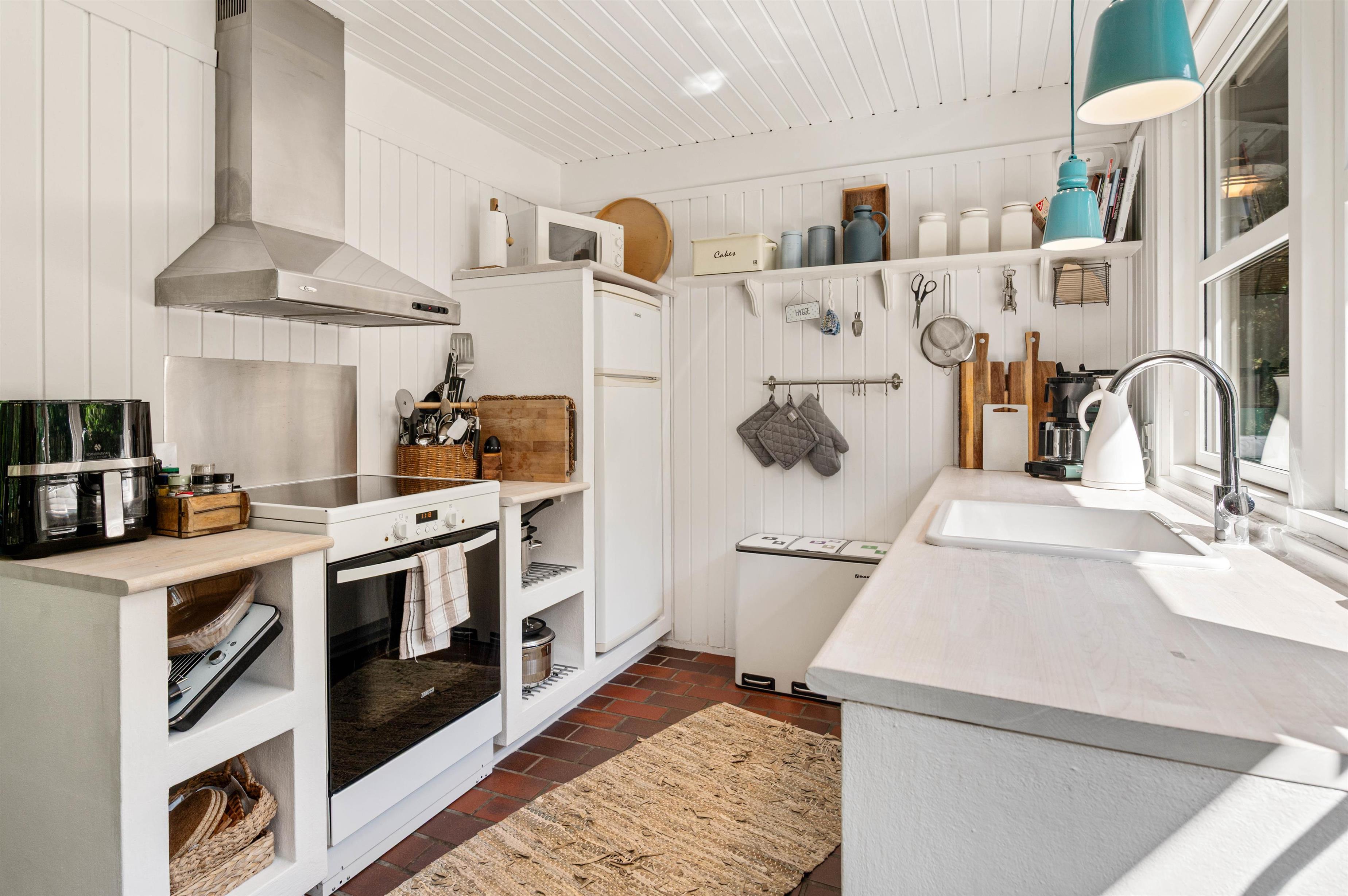 I det lyse åbne køkken finder I alt til tilberedelsen af lækre måltider, og imens opvaskemaskinen klarer resten, kan familien samles til lange sjove spilleaftener ved det store spisebord. For den perfekte stemning, kan der tændes op i den store brændeovn, der er centralt placeret i stue-alrummet.