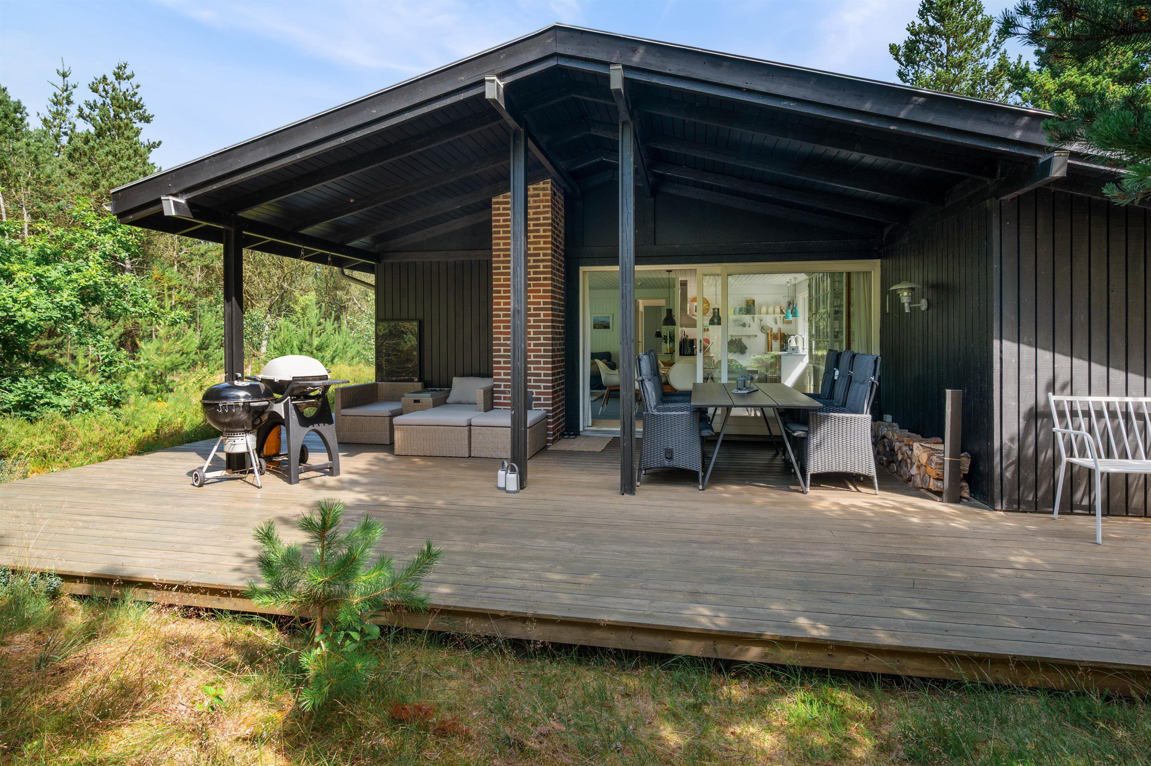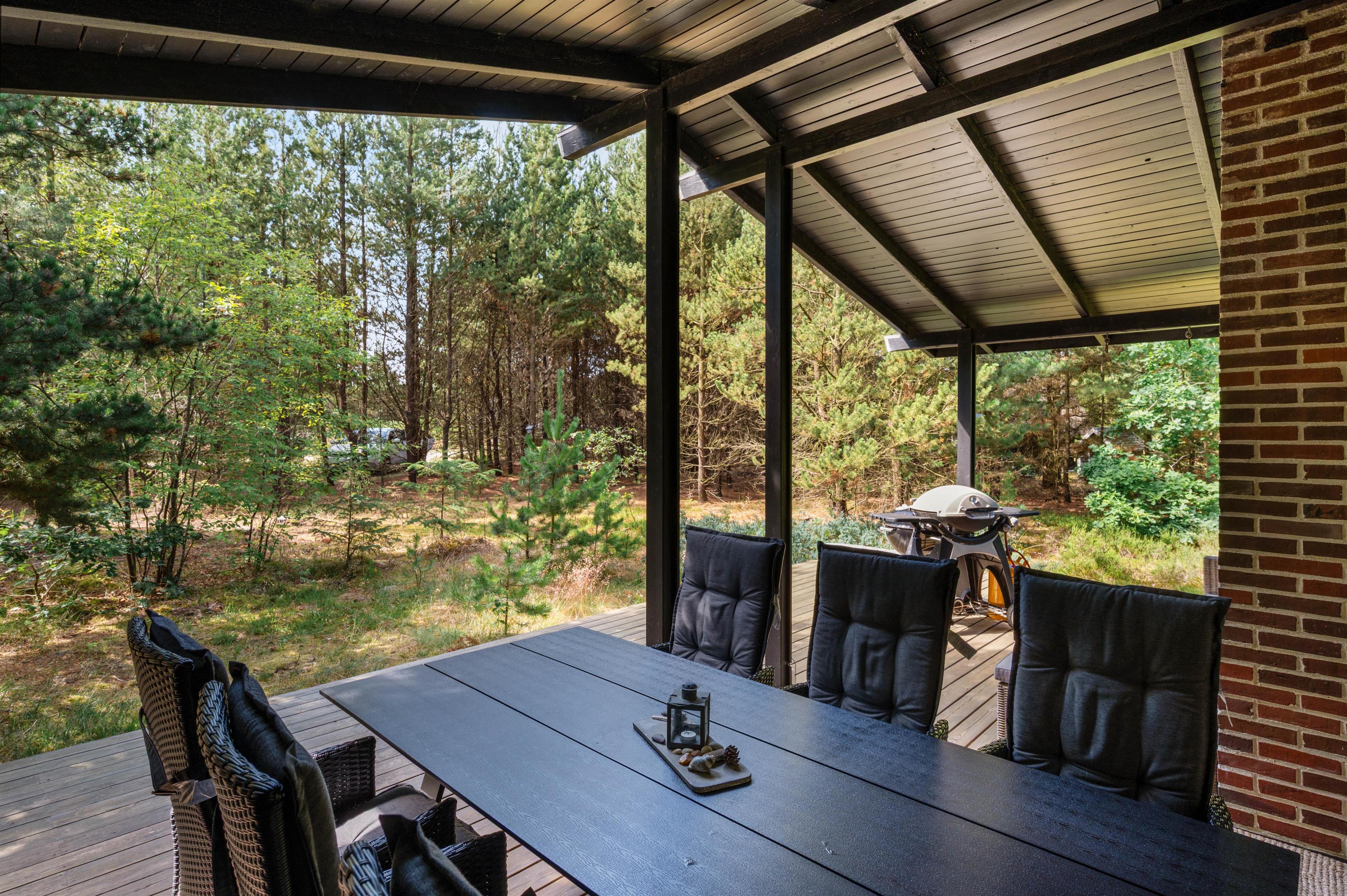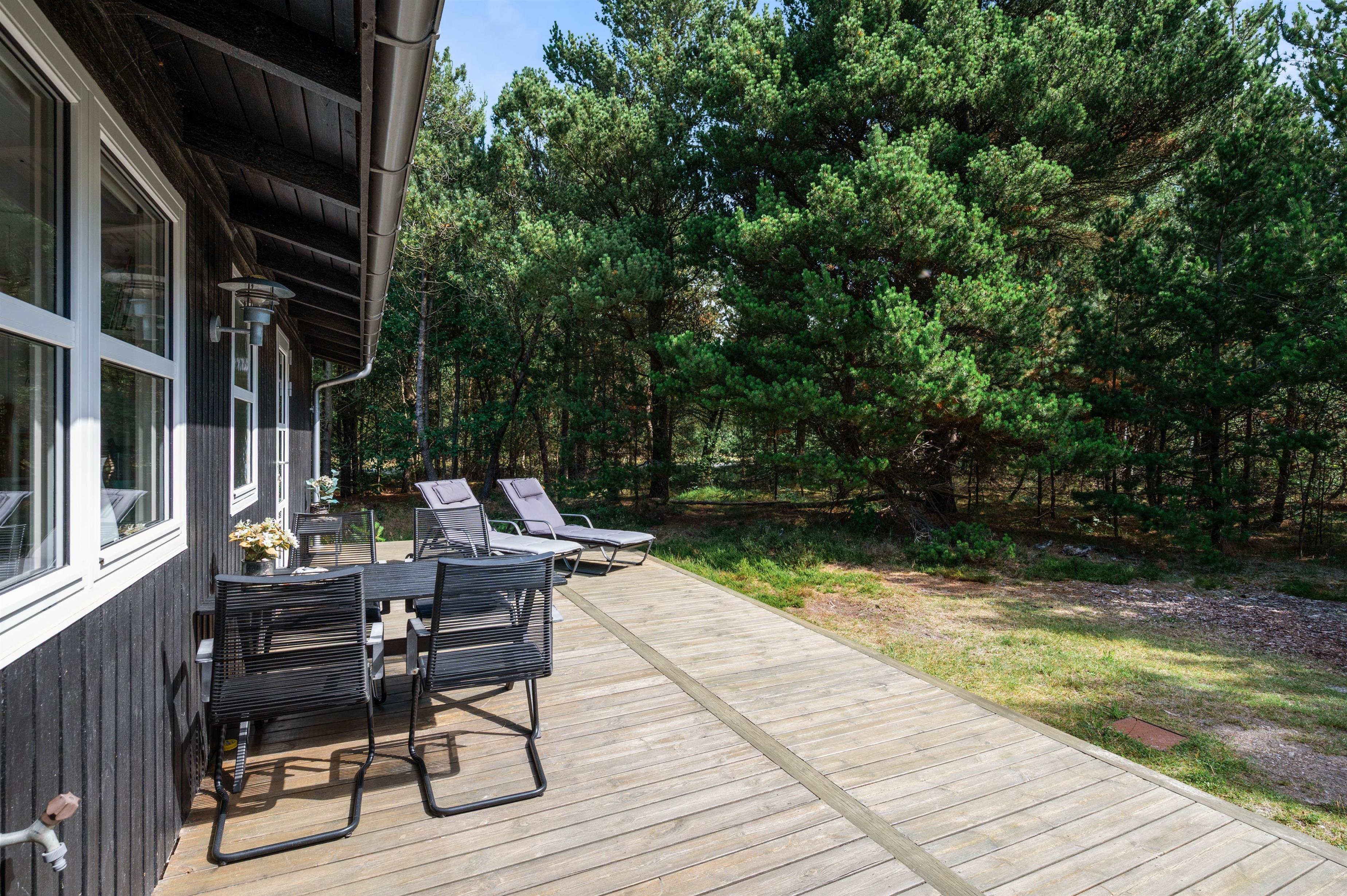 Med udgang fra både køkken og stue er der dejlige ophøjede træ-terrasse på 3 sider af huset. Her kan I altid finde ro og en perfekt læplads til solslikkeri eller en lang "morfar" i skyggen i en af husets bekvemme liggestole. Efter at have tilbragt en lang dag ved stranden, er det skønt at se frem til en stille aften på terrassen med grillmad og gode samtaler, og skulle det dryppe lidt, kan I sagtens tænde op alligevel, da en del af terrassen er overdækket.