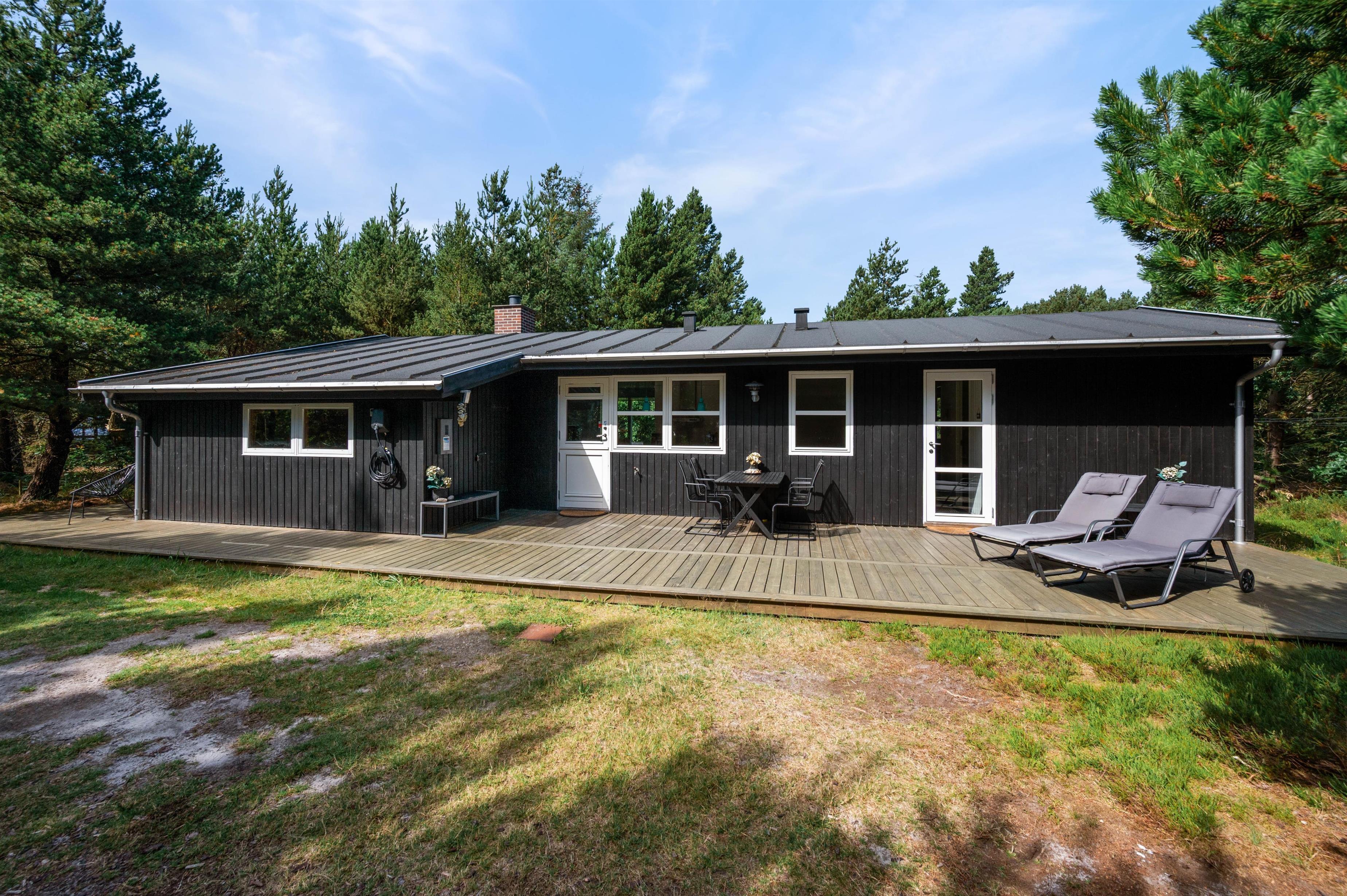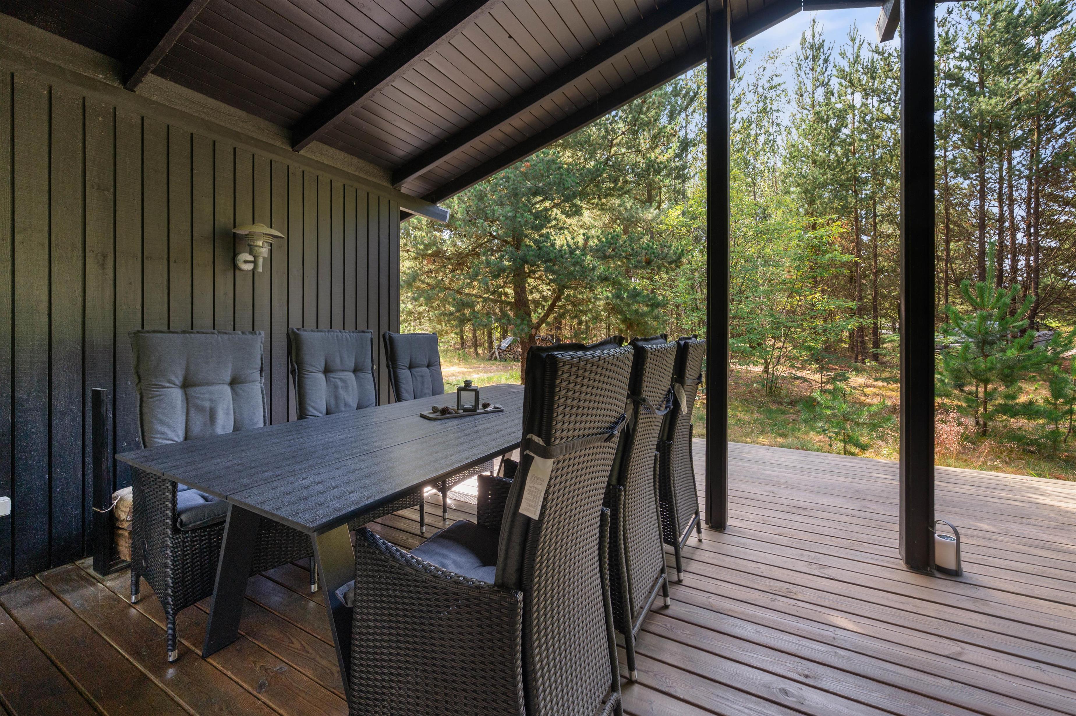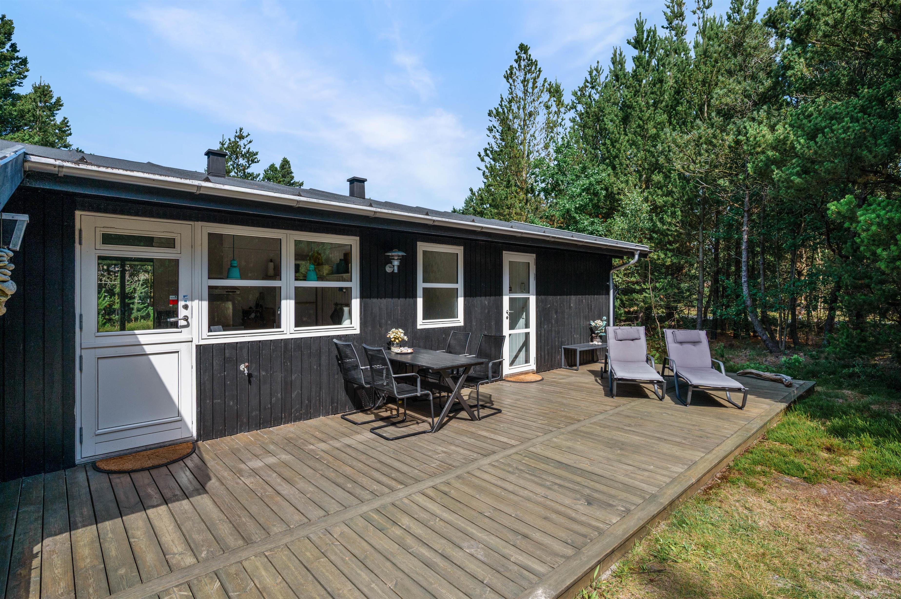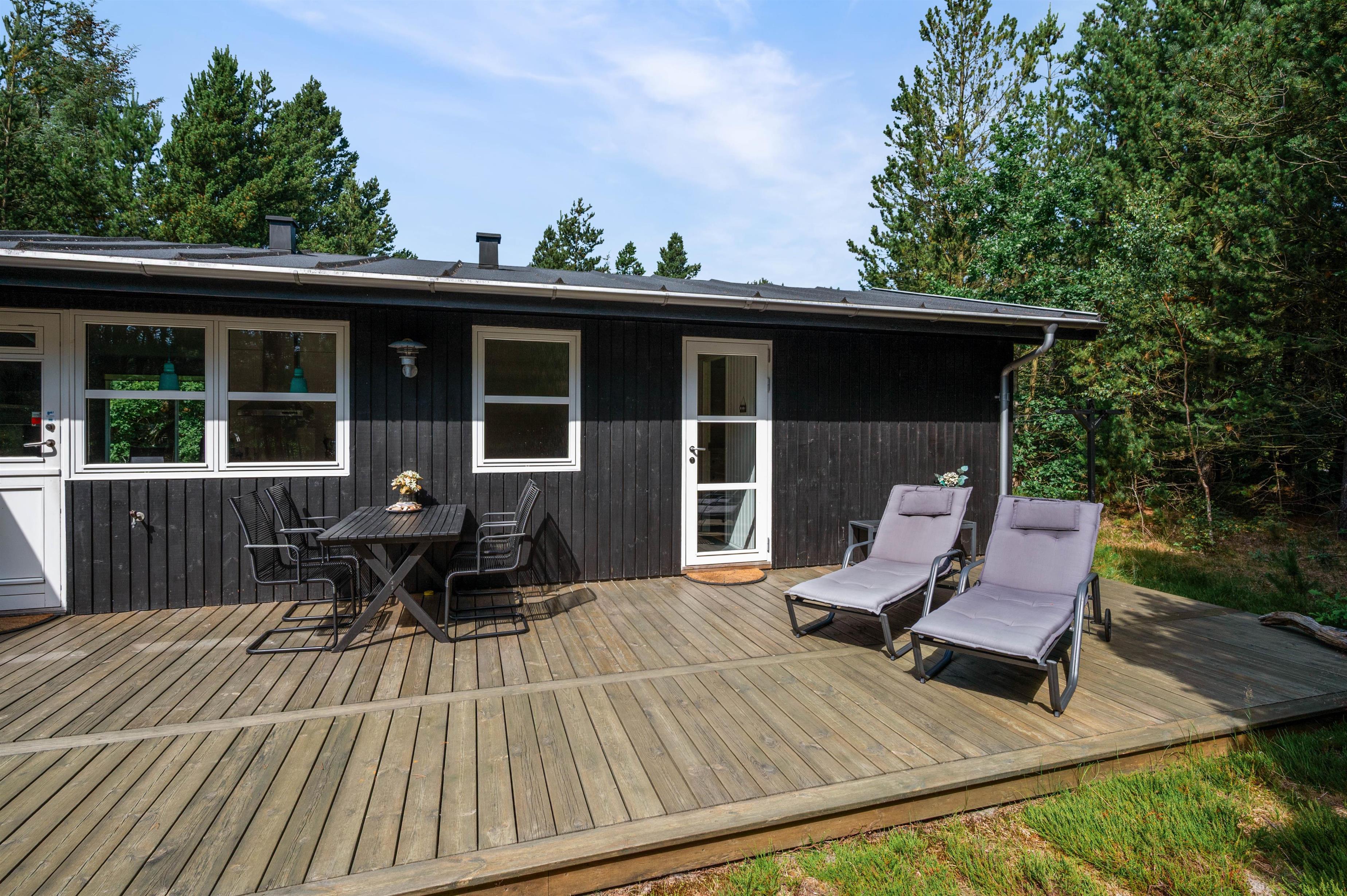 Med udgang fra både køkken og stue er der dejlige ophøjede træ-terrasse på 3 sider af huset. Her kan I altid finde ro og en perfekt læplads til solslikkeri eller en lang "morfar" i skyggen i en af husets bekvemme liggestole. Efter at have tilbragt en lang dag ved stranden, er det skønt at se frem til en stille aften på terrassen med grillmad og gode samtaler, og skulle det dryppe lidt, kan I sagtens tænde op alligevel, da en del af terrassen er overdækket.