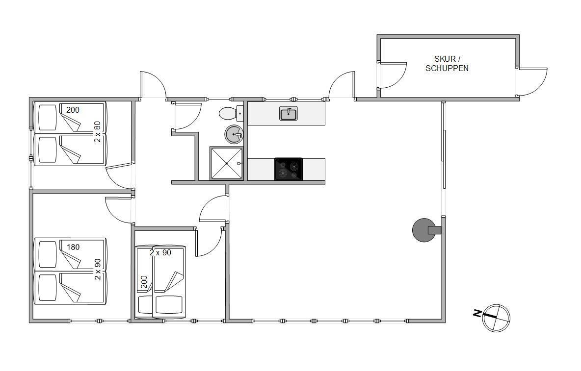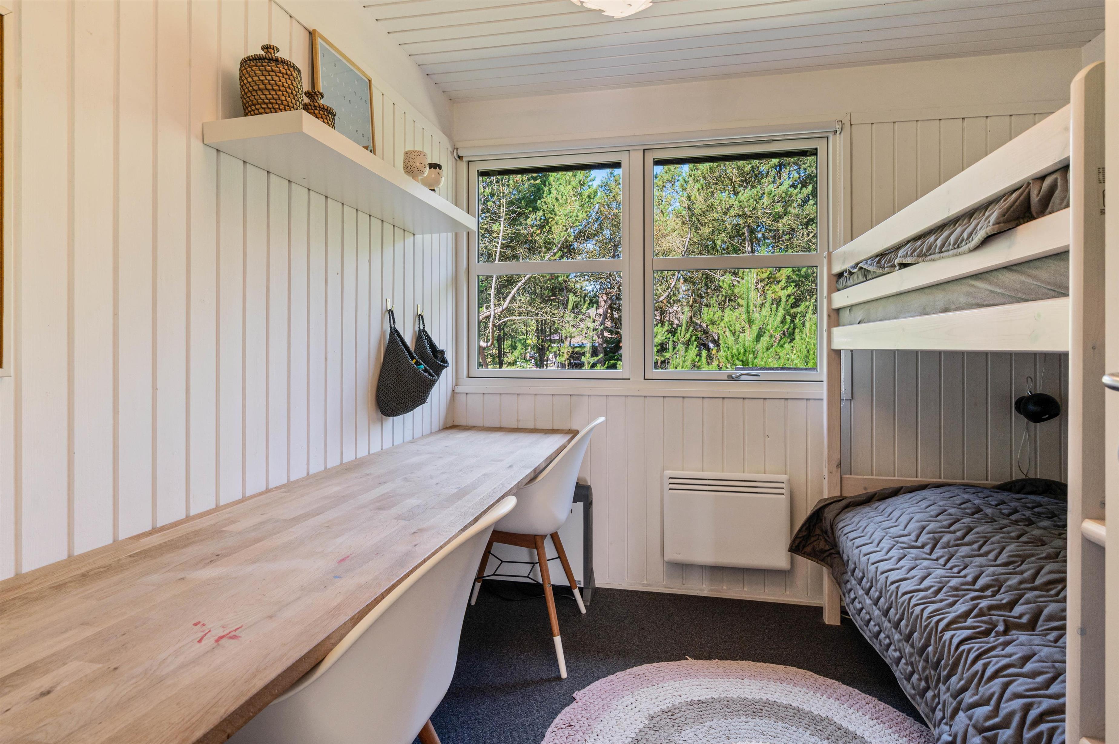 Her i dette feriehus forefindes både børneseng og højstol. Det ene køjerum er sågar indrettet med pusleplads og tremmeseng og i det andet finder I et langt skrivebord, så der er ekstra plads til hobby eller computer.