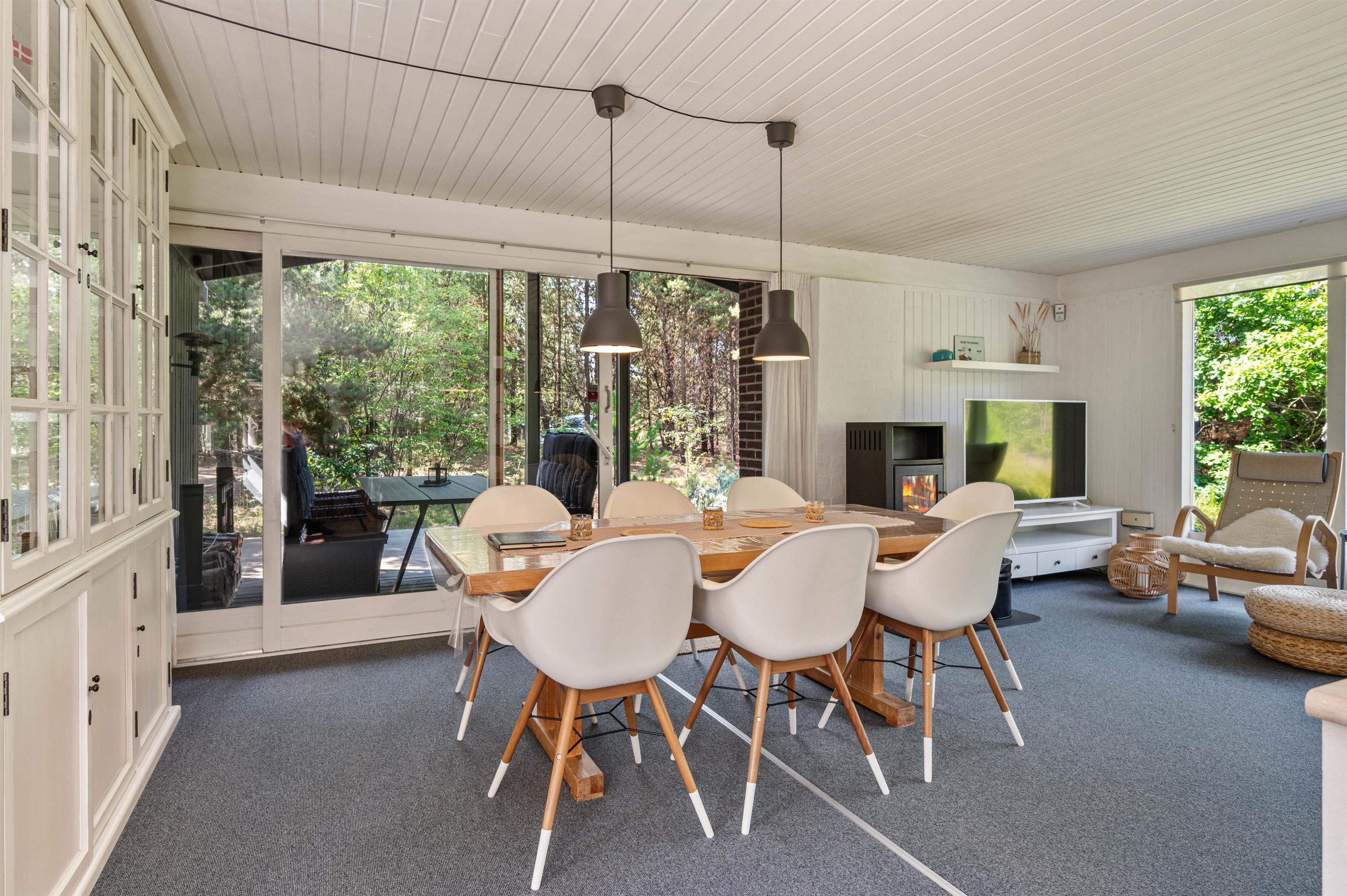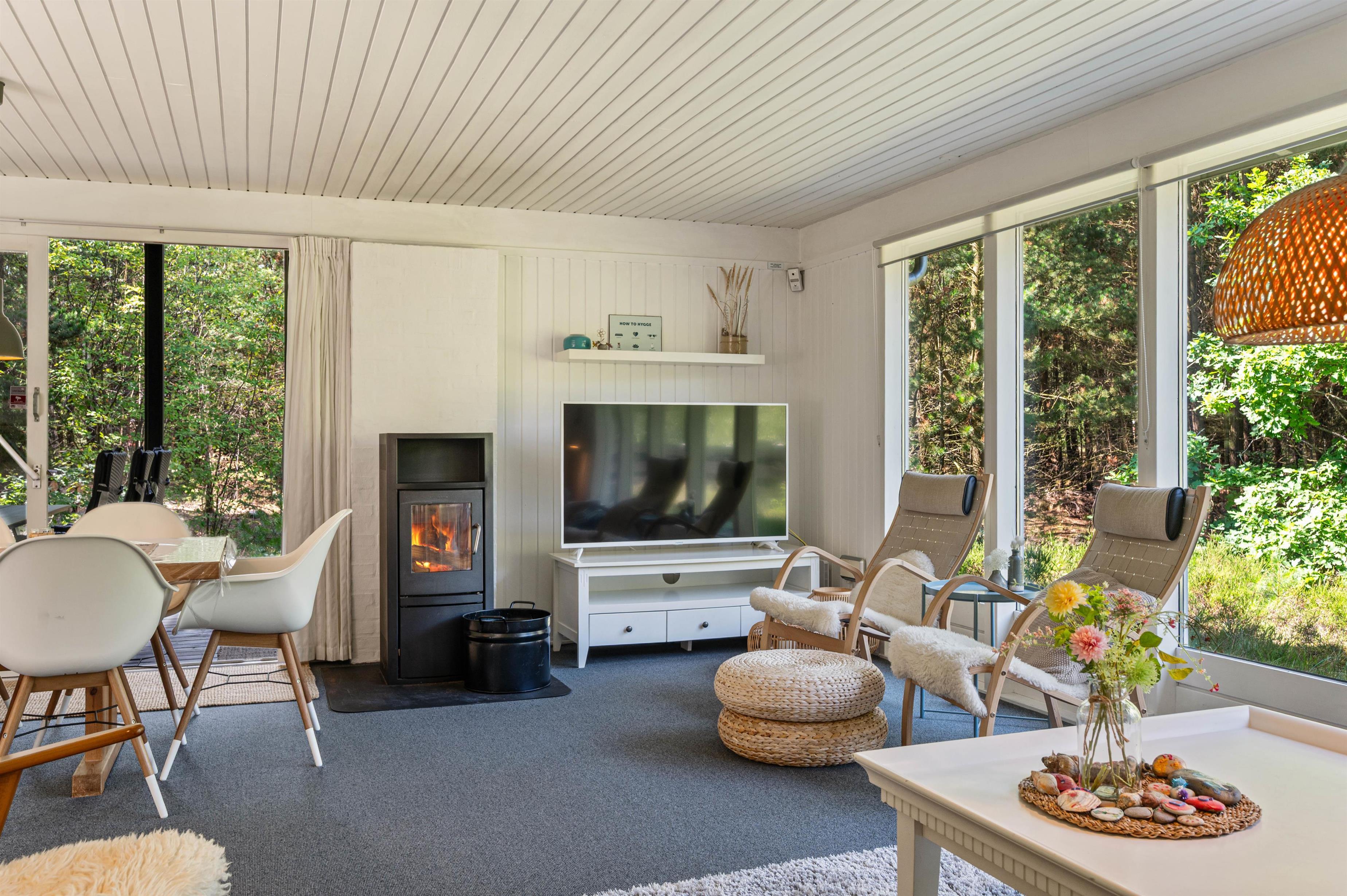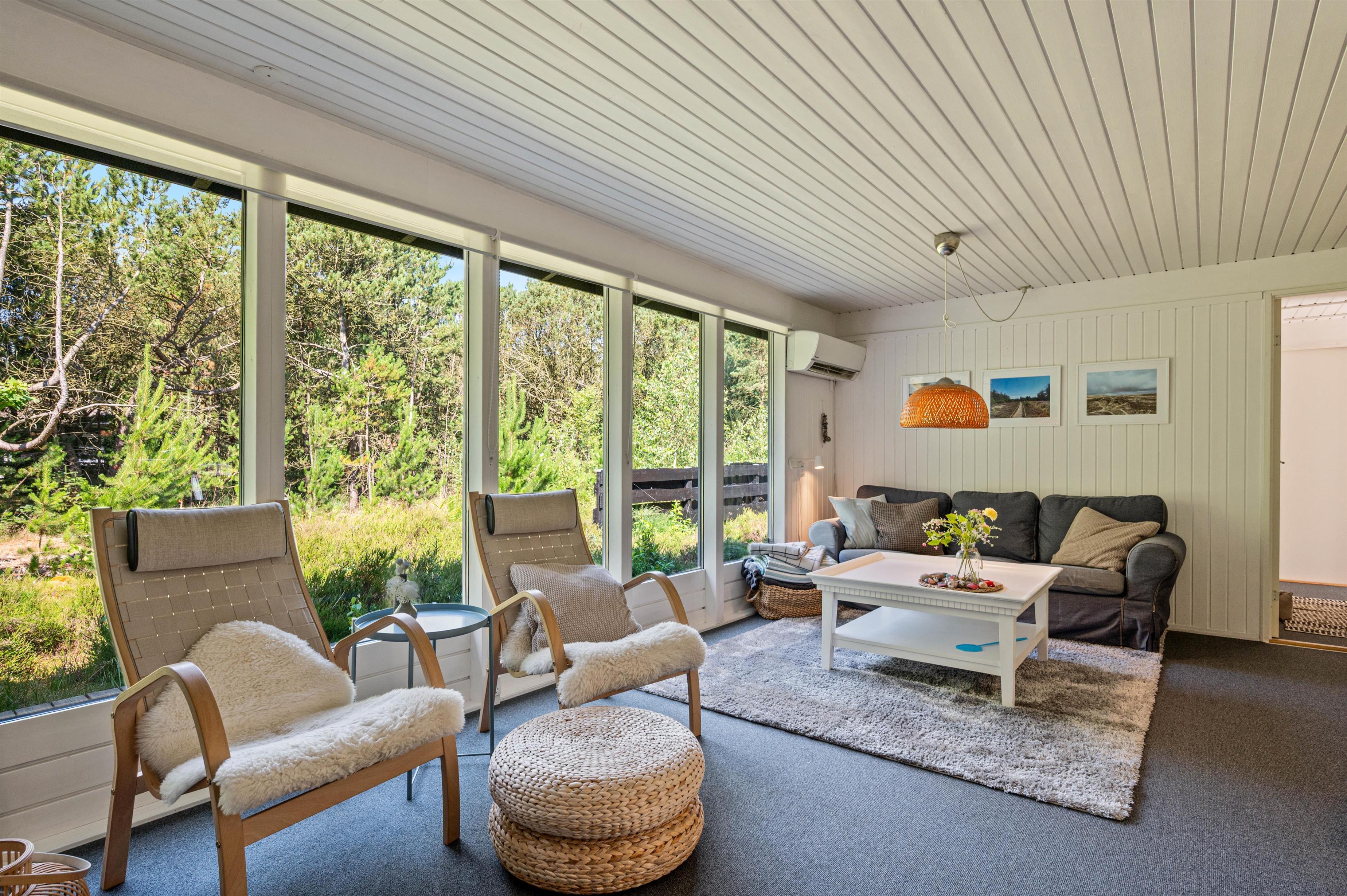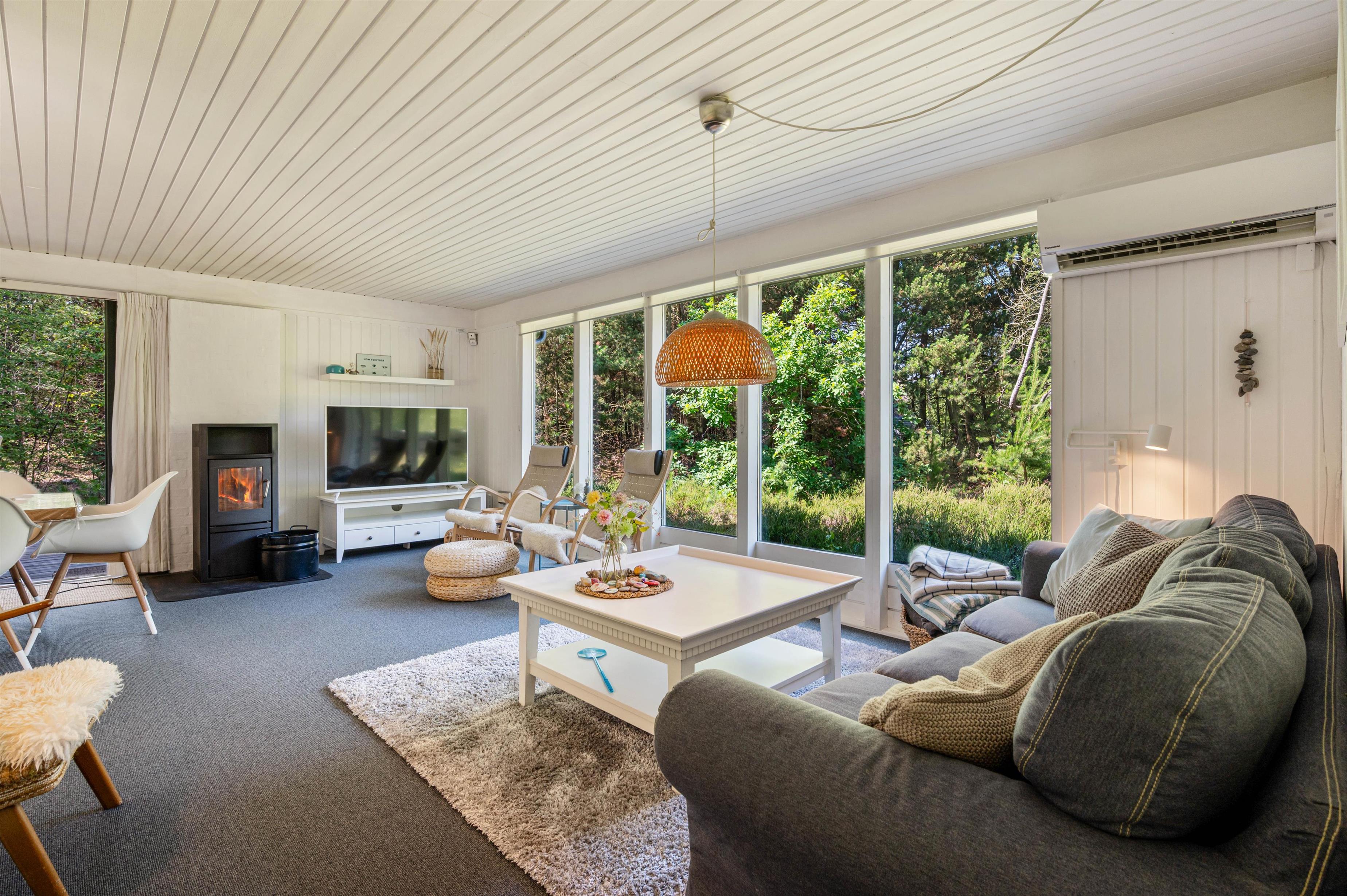 De store stuevinduer, der følger hele stuens længde åbner op for et dejligt blik ud på lyng og nåletræer.