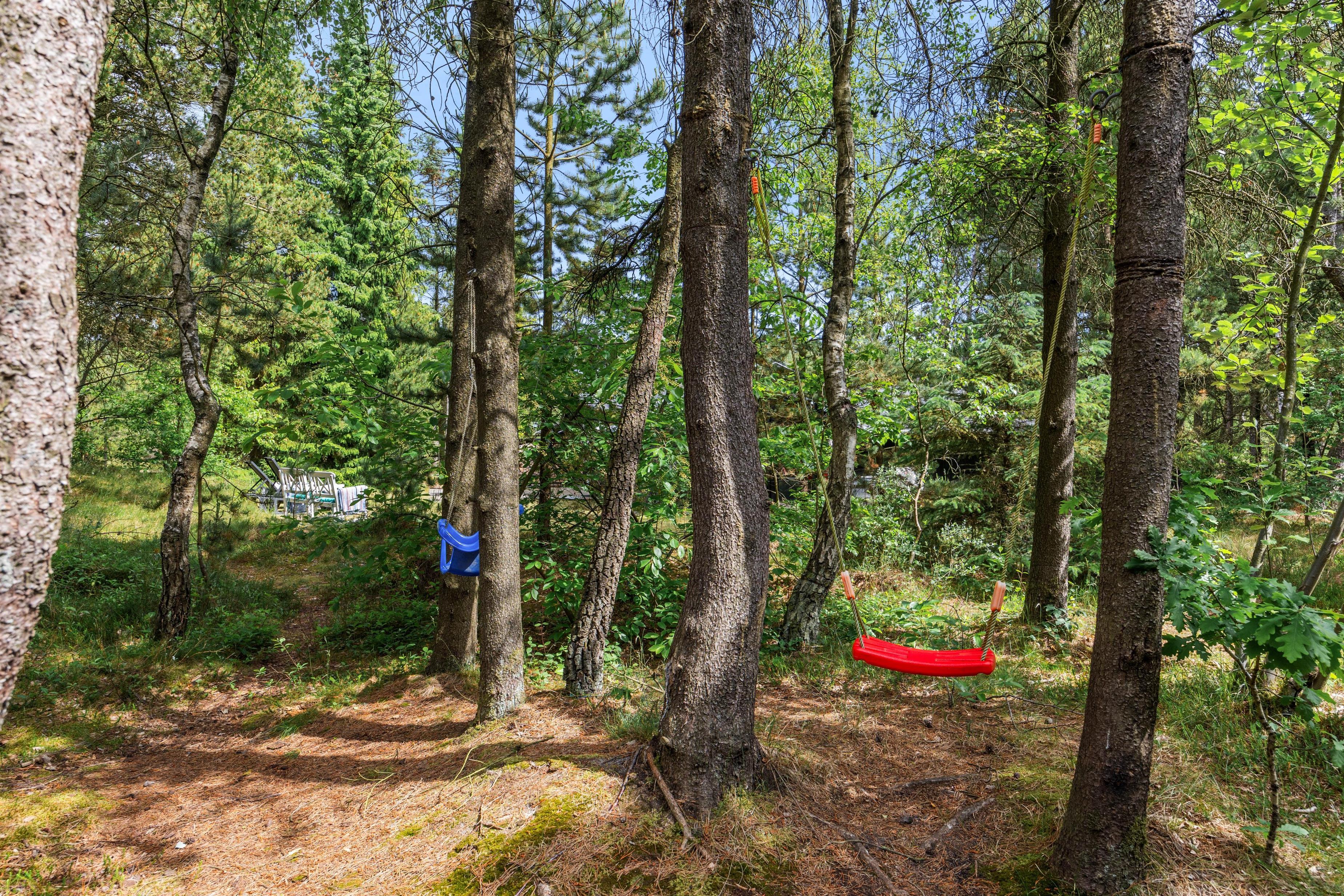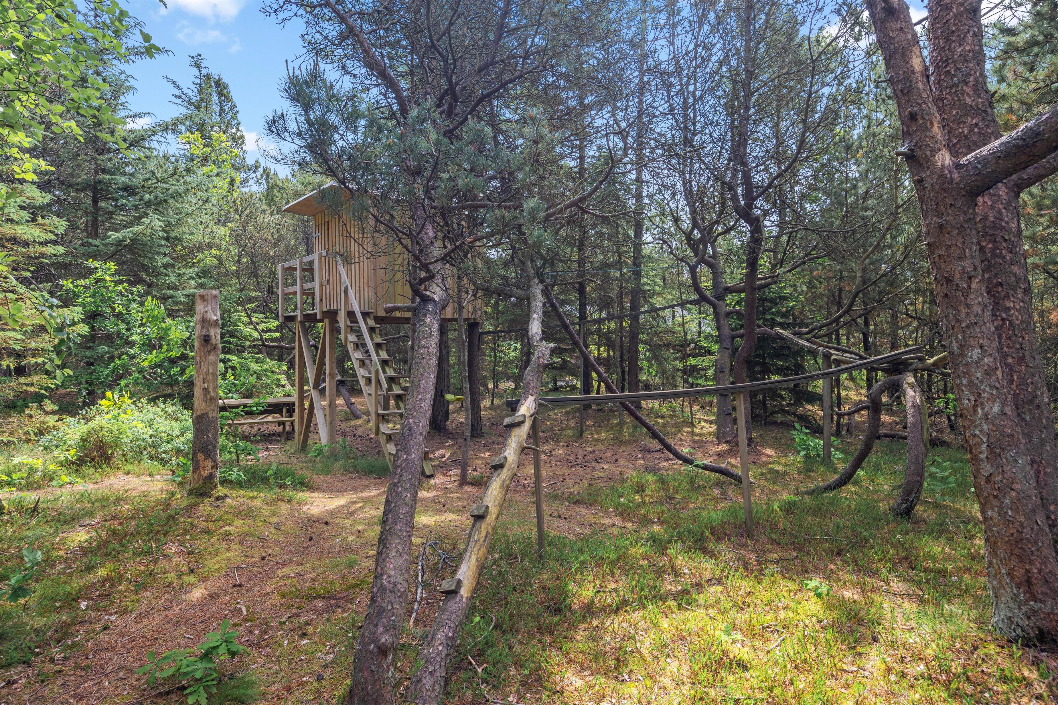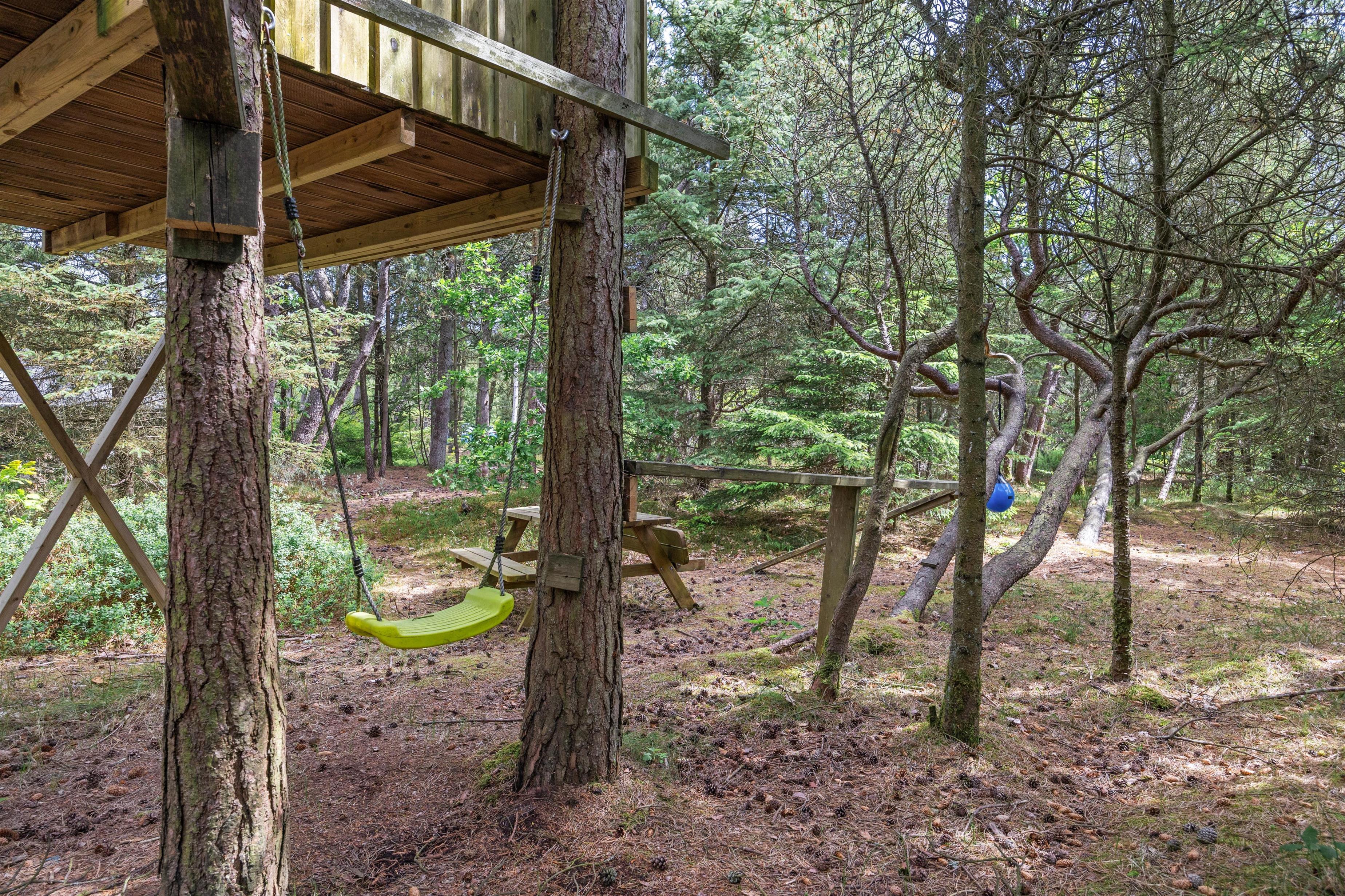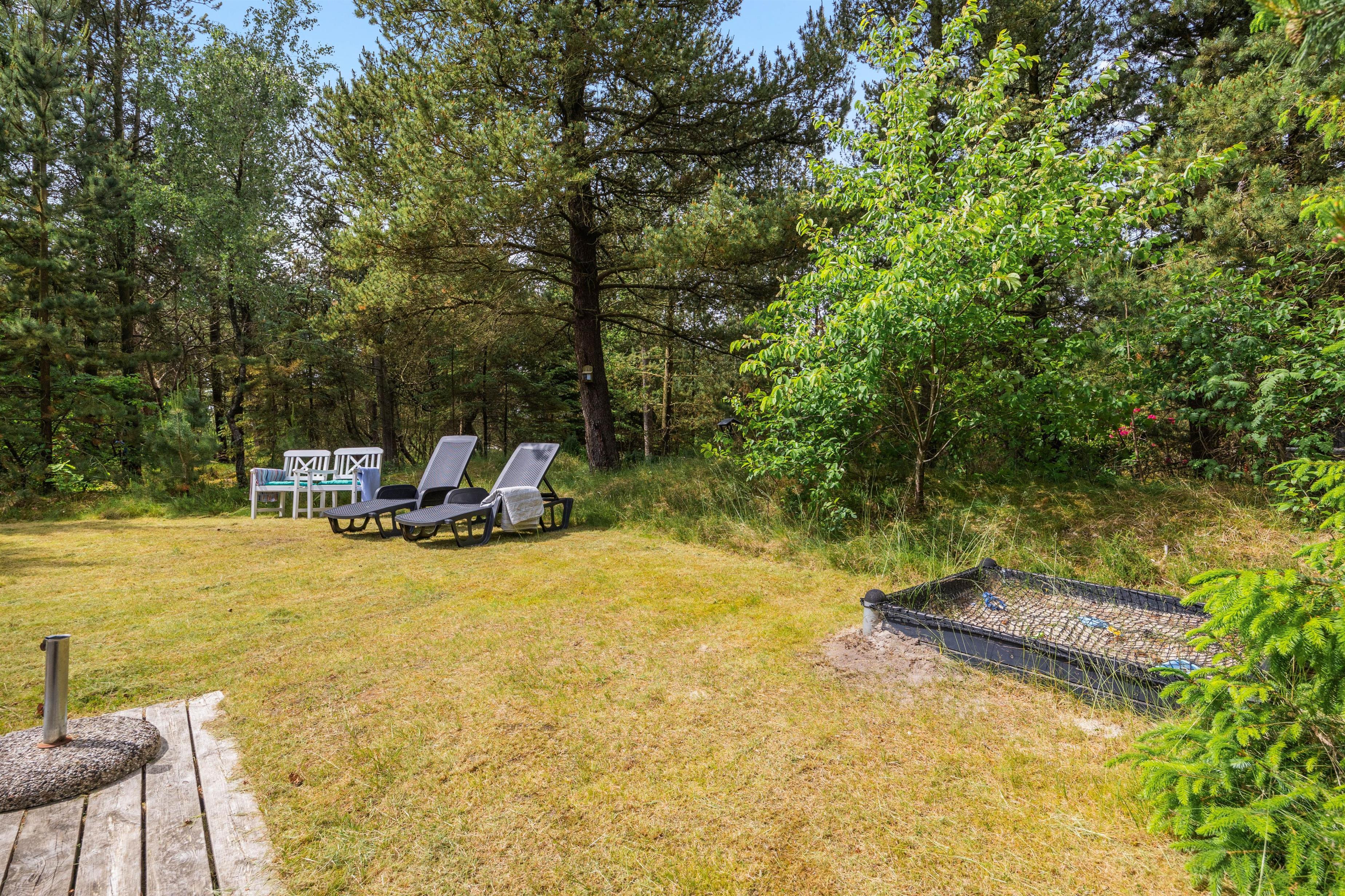 Sommerhuset er placeret på en 1337 kvadratmeter stor naturgrund, som er omgivet af høje træer. Her er masser af plads til at boltre sig for både store og små. På matriklen finder I også en sandkasse, gynge og et legehus, hvor yngre børn bestemt kan bruge mange timer på leg. Imens kan de voksne sætte sig på terrassen i de behagelige havemøbler, eller slappe af på en liggestol. Hen ad dagen kan I tænde op i grillen og lave et udsøgt feriemåltid, som kan nydes under åben himmel.