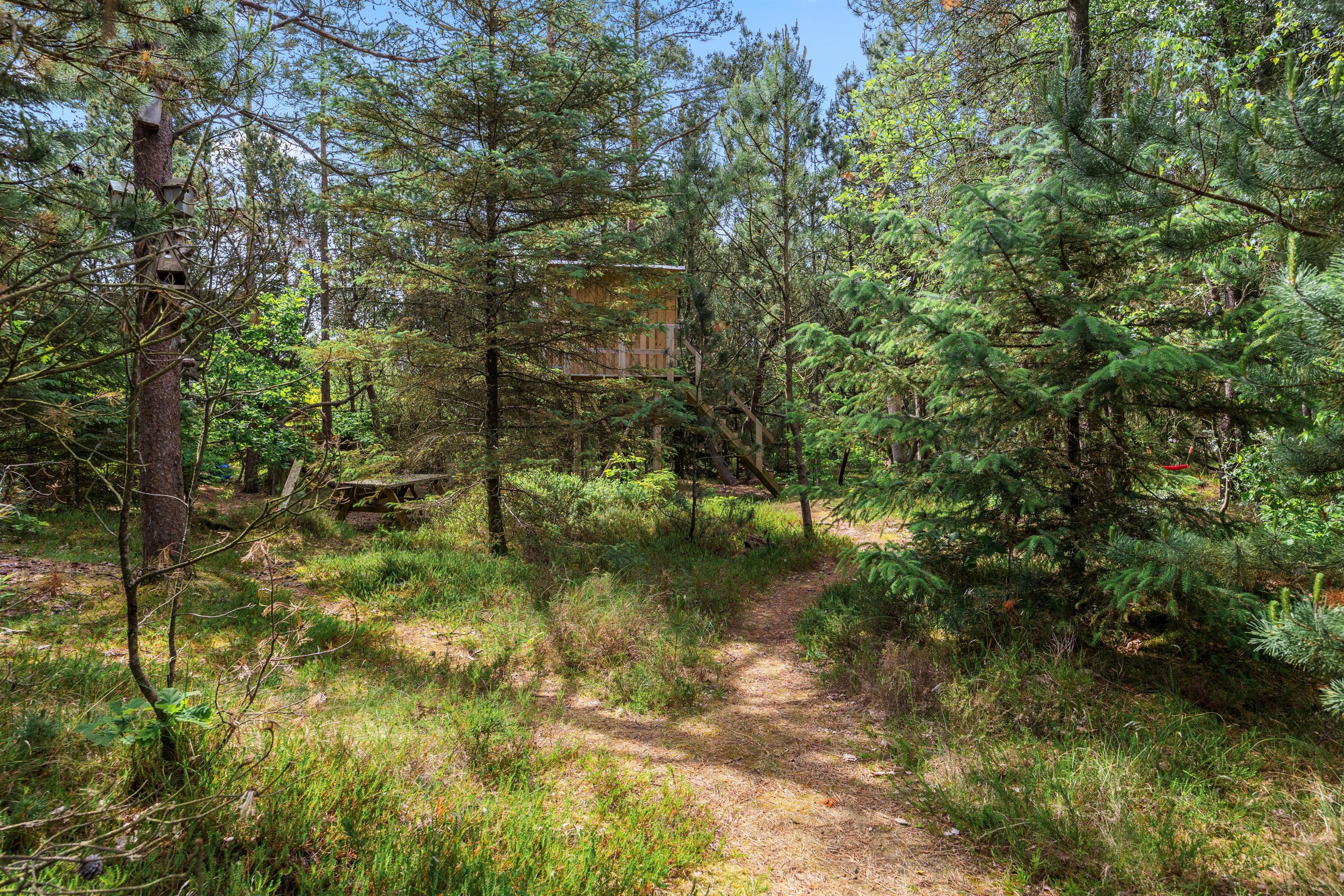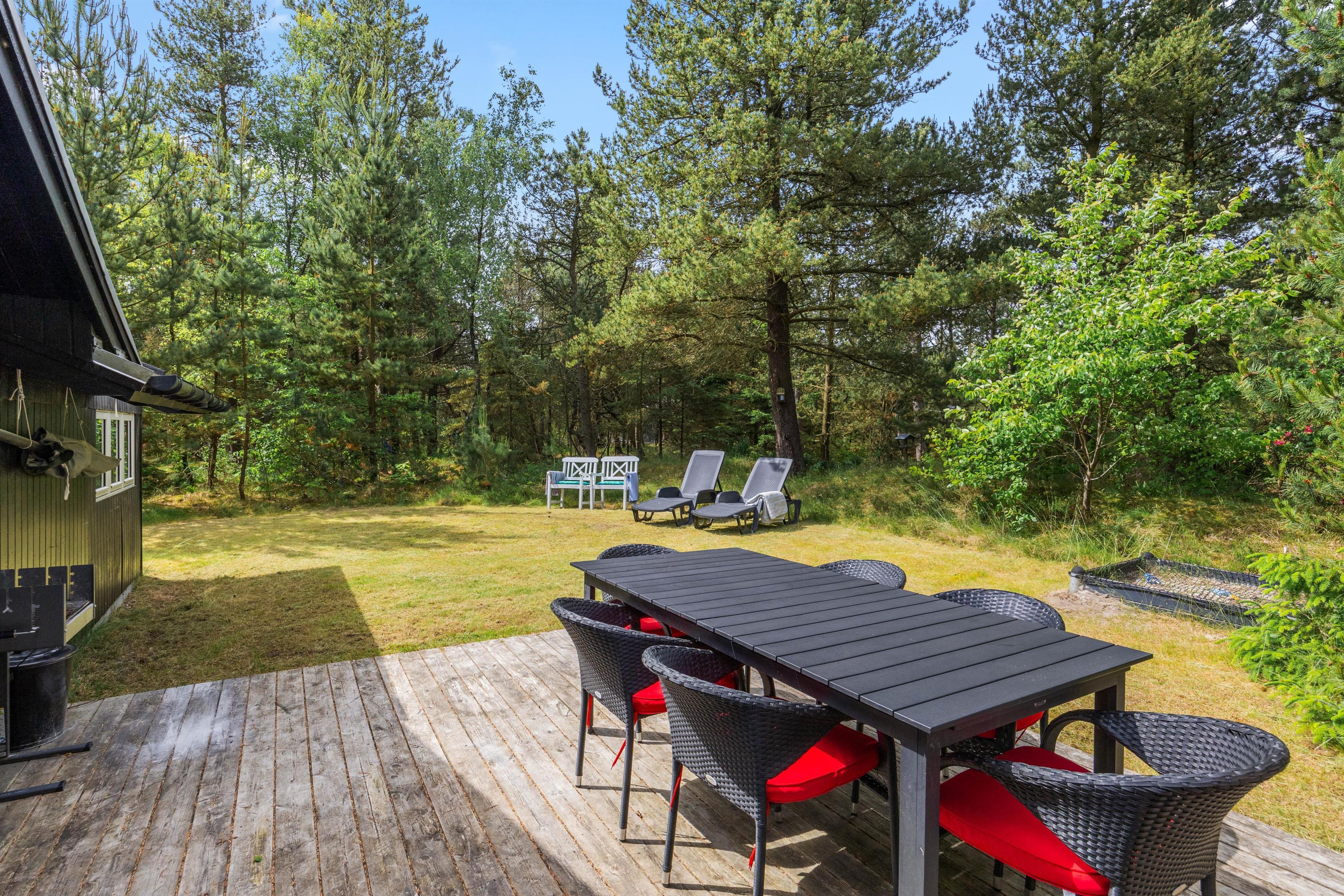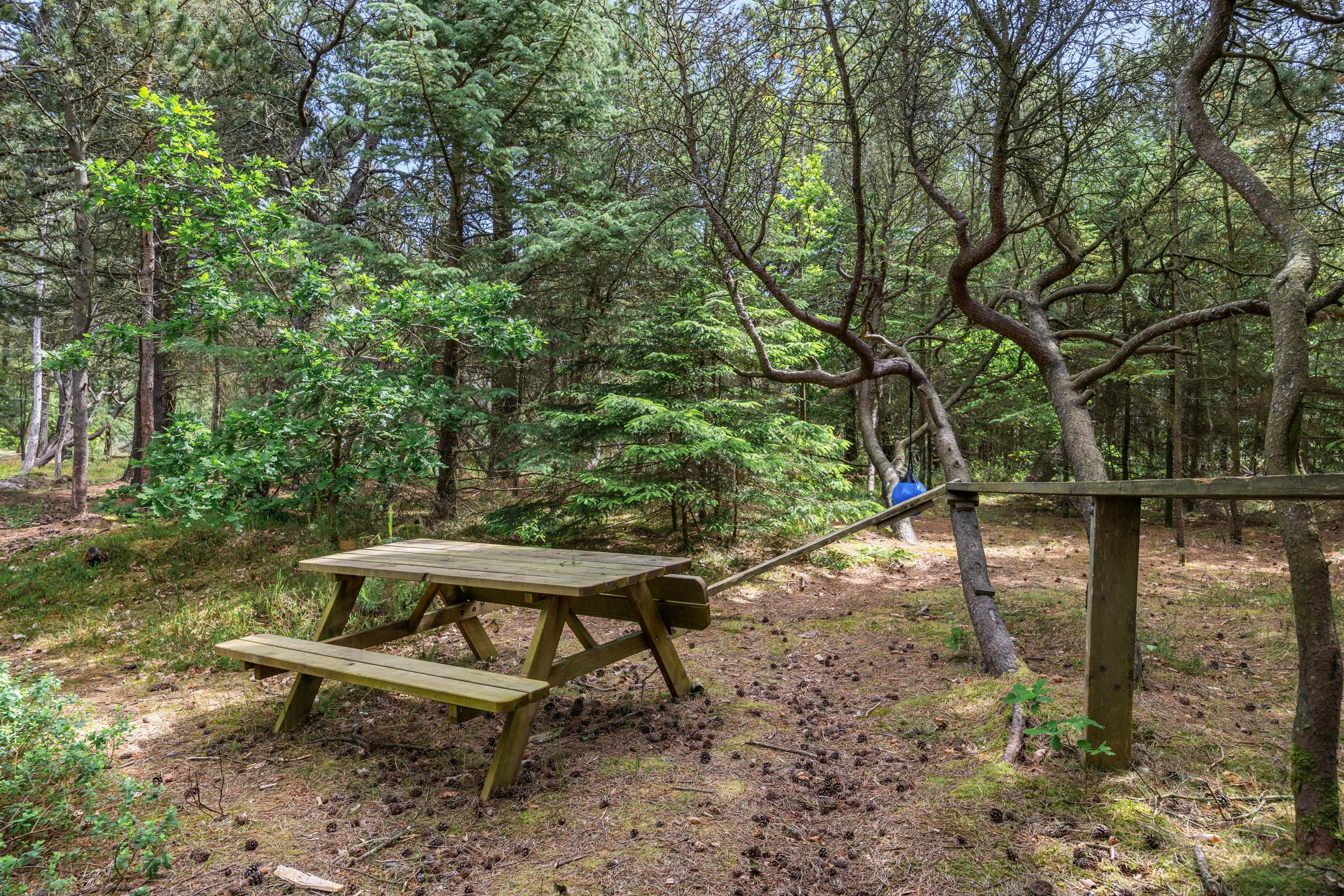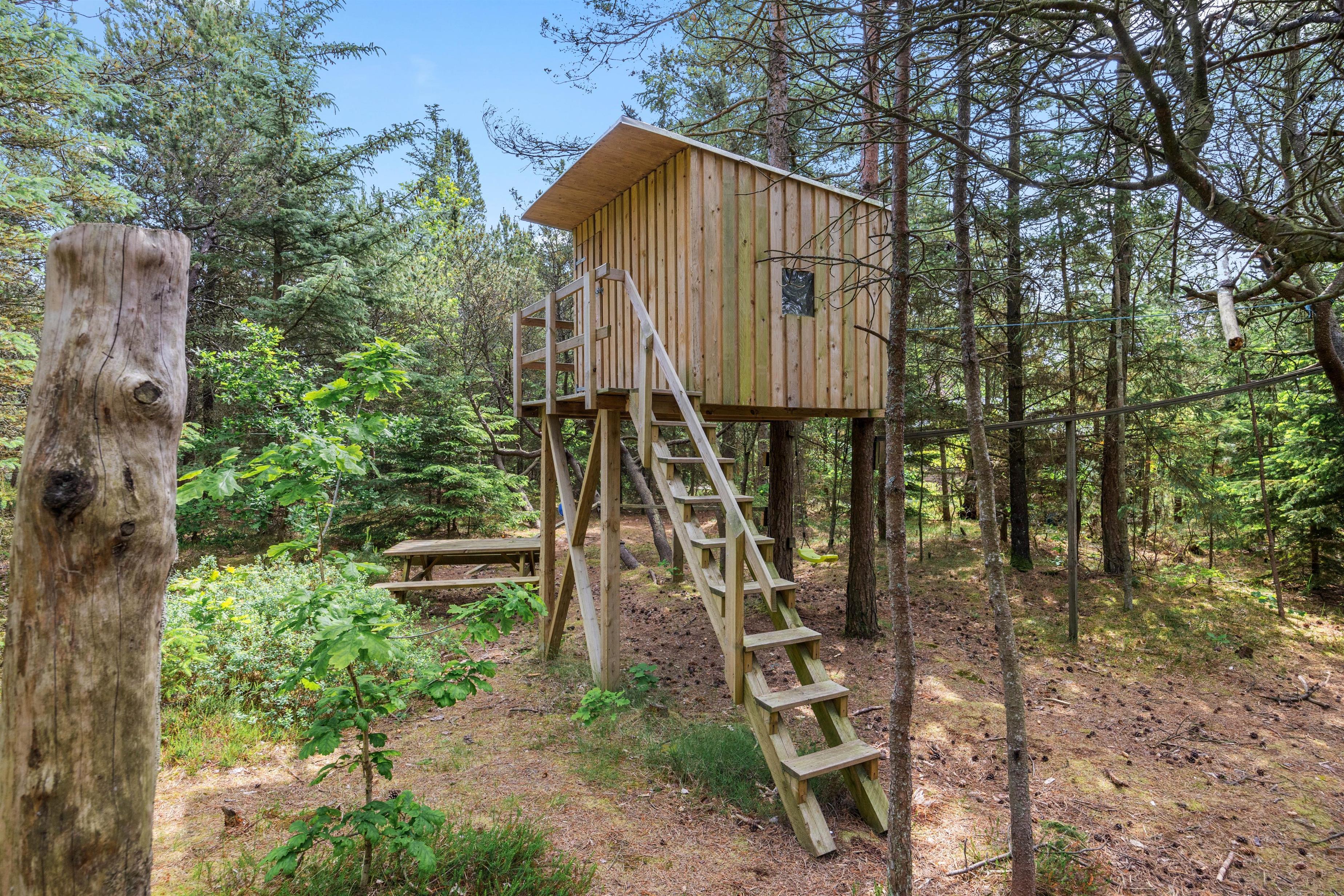 Sommerhuset er placeret på en 1337 kvadratmeter stor naturgrund, som er omgivet af høje træer. Her er masser af plads til at boltre sig for både store og små. På matriklen finder I også en sandkasse, gynge og et legehus, hvor yngre børn bestemt kan bruge mange timer på leg. Imens kan de voksne sætte sig på terrassen i de behagelige havemøbler, eller slappe af på en liggestol. Hen ad dagen kan I tænde op i grillen og lave et udsøgt feriemåltid, som kan nydes under åben himmel.