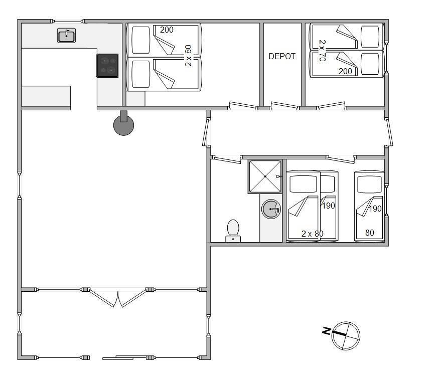 De 7 pladser fordeler sig på 3 soverum. Børnene vil elske feriestemningen med køjesenge og de voksne kan sove lidt mere luksuriøst i elevationssengene. Om morgenen er der ingen fare for kolde tæer, da der er installeret gulvvarme i badeværelset.