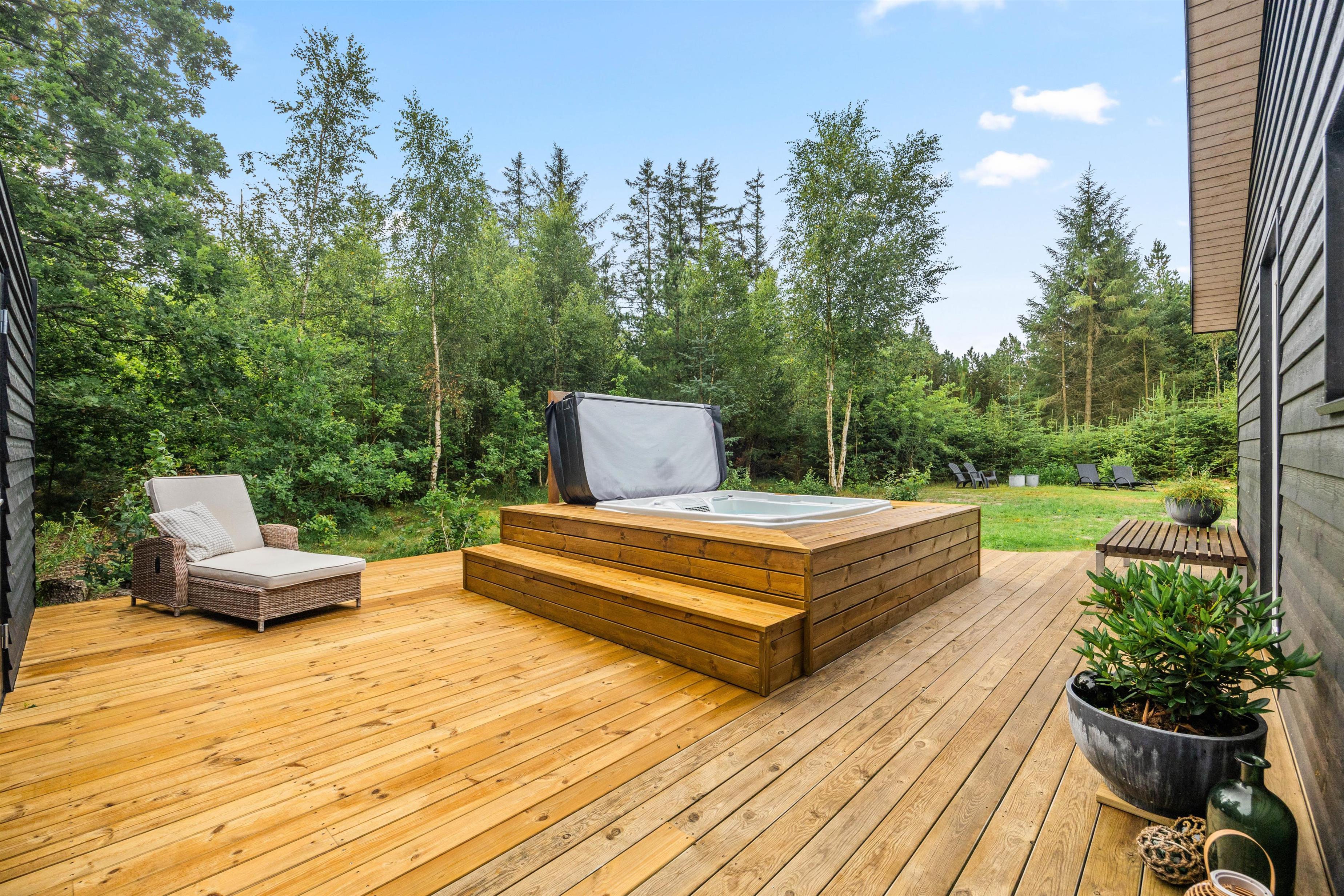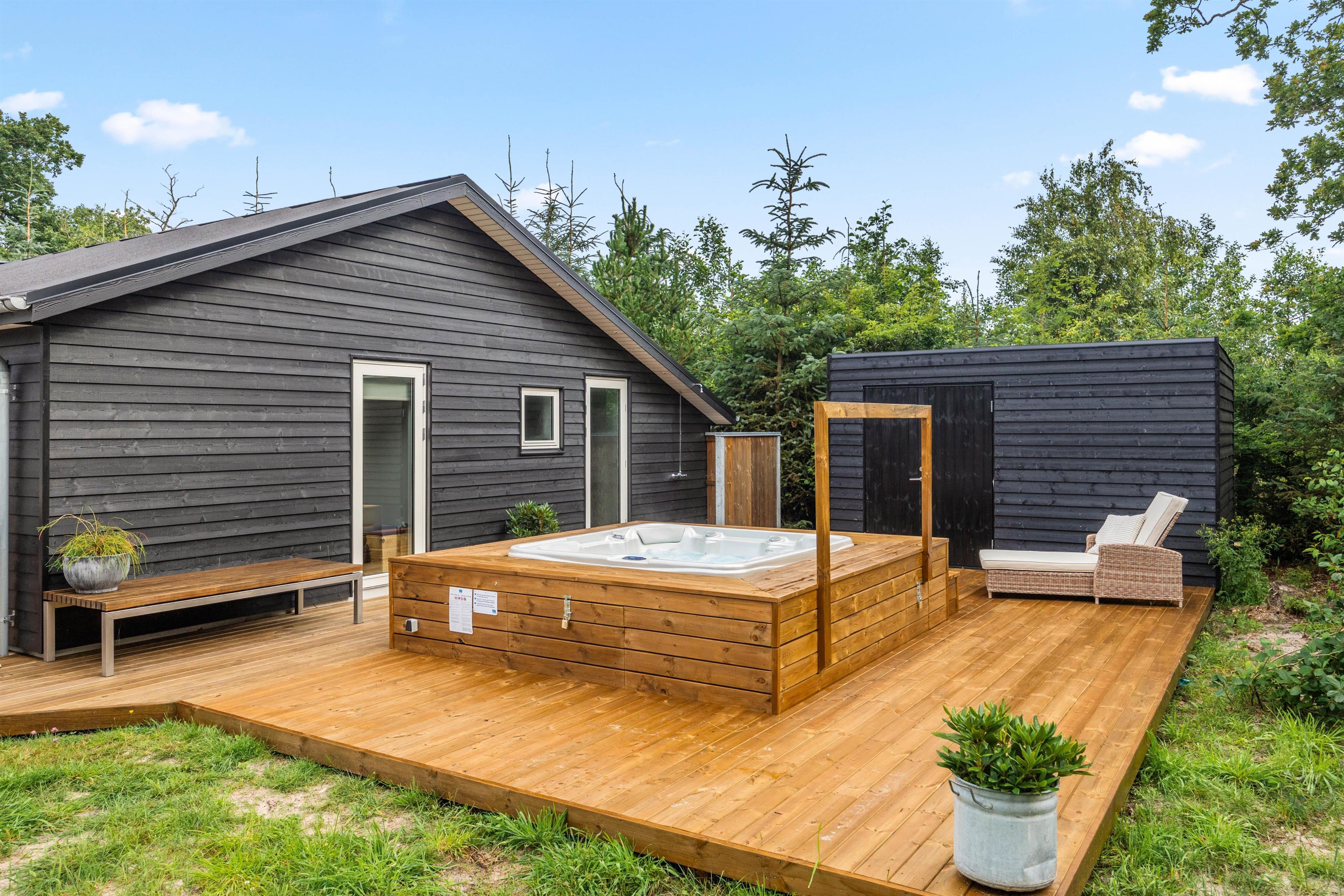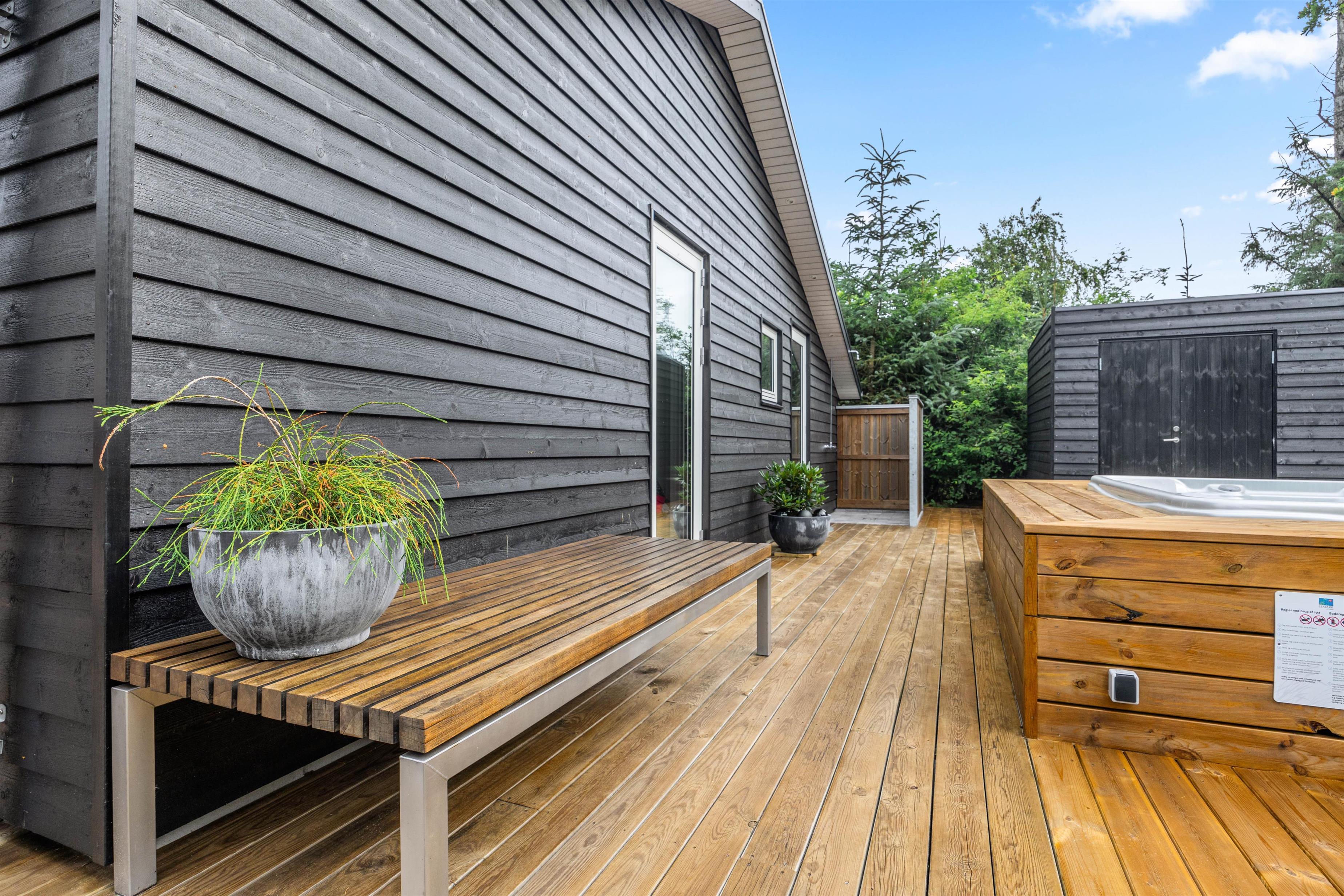 Terrassens højdepunkt er uden tvivl udespaen, en perfekt oase for at lade musklerne slappe af. Efter en tur i spaen kan I tage en forfriskende skyller under udebruseren, som kan benyttes fra april til november. Mens I slapper af og nyder omgivelserne på terrassen, kan I også oplade bilen klar til næste dags eventyr ved sommerhusets ladestander.