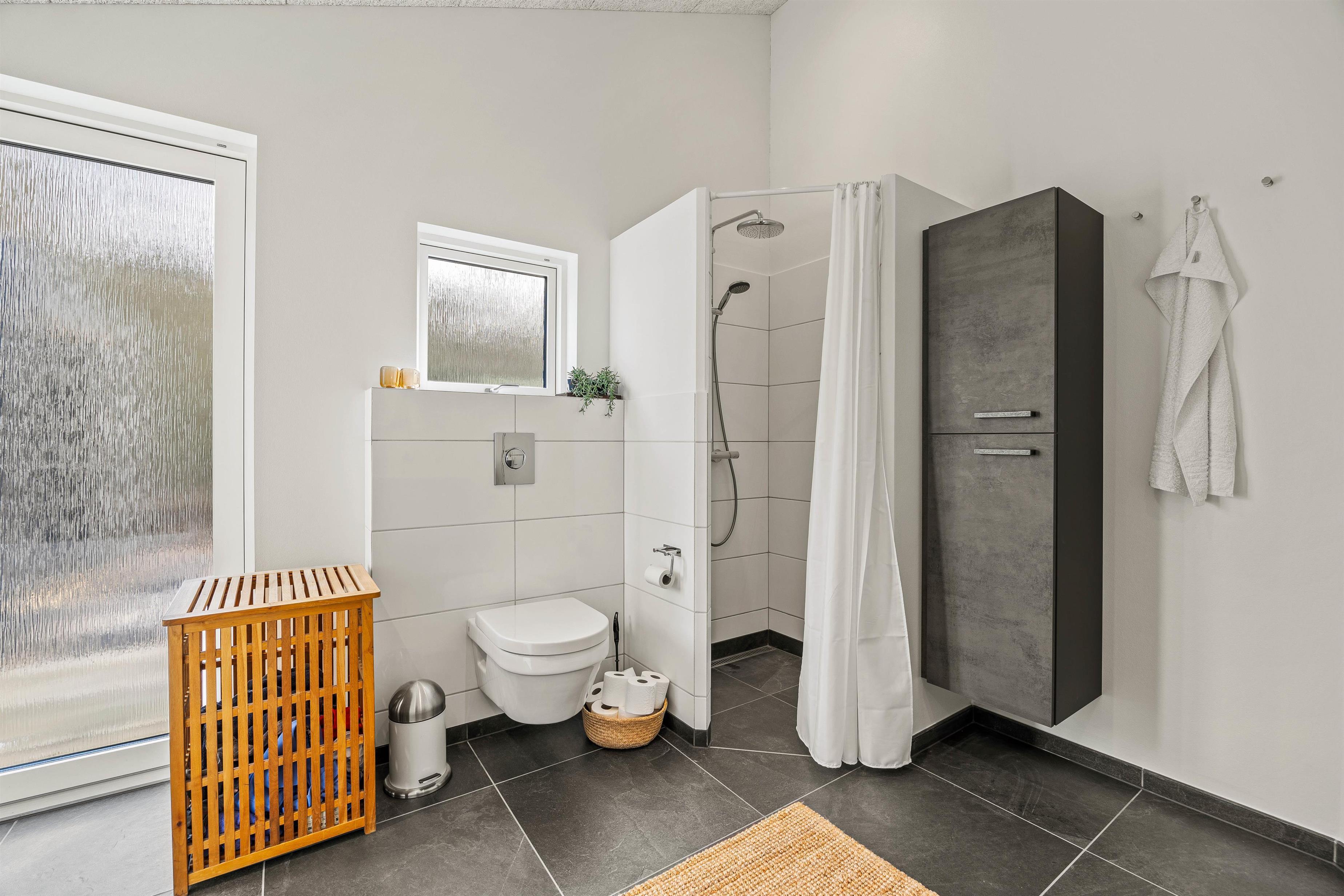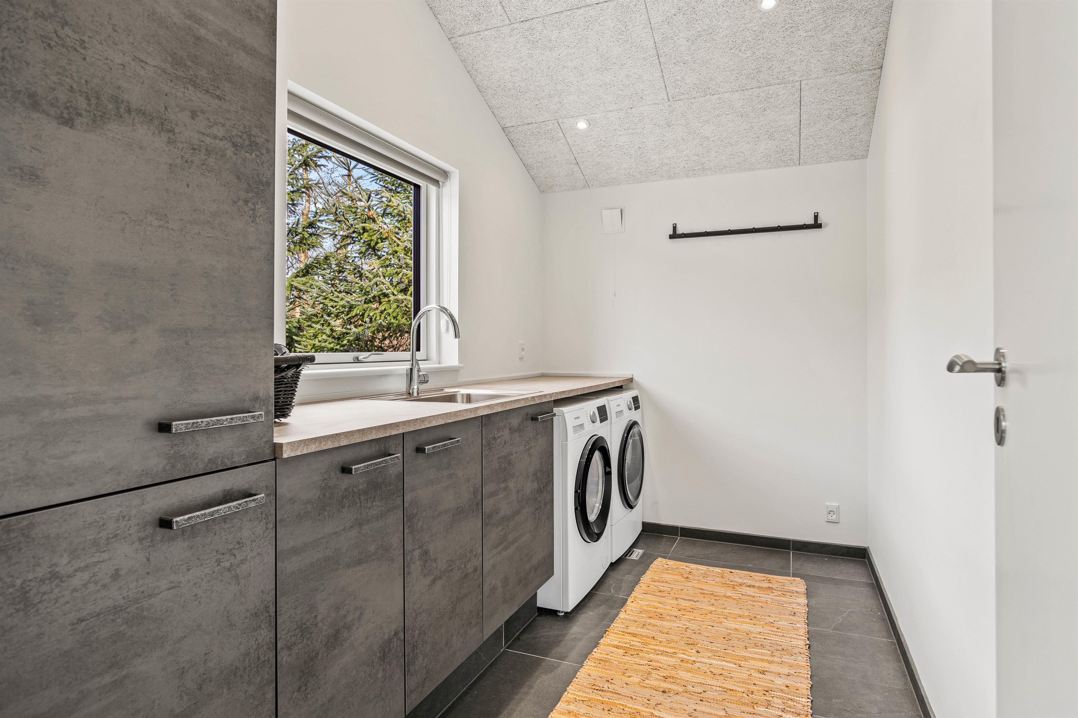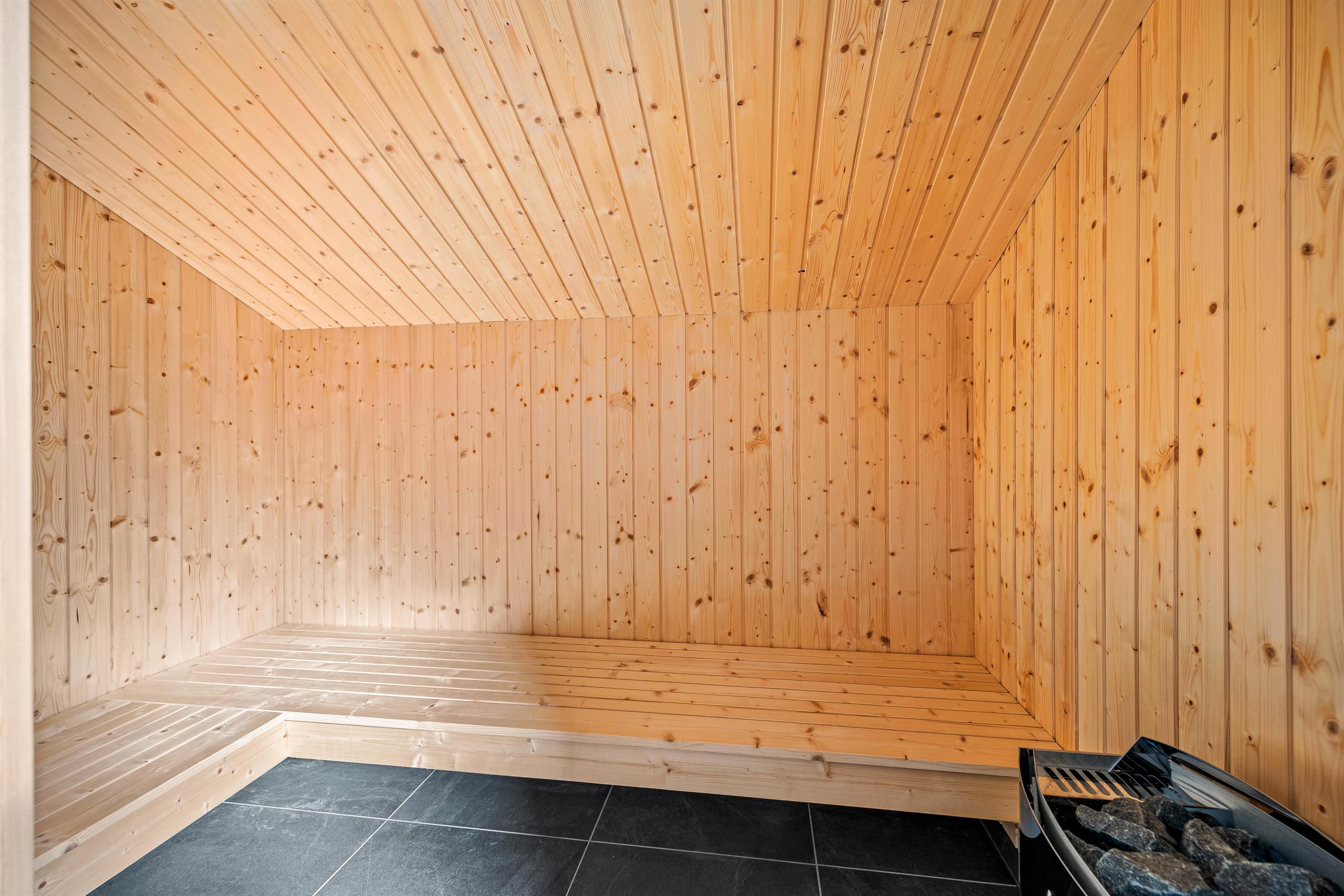 De 2 badeværelser, begge med dejlig gulvvarme, forvandler daglige rutiner til ren luksus. Som prikken over i’et kan I nyde en afslappende stund i saunaen. Praktiske faciliteter som vaskemaskine og tørretumbler sørger for, at I altid kan føle jer komfortable under opholdet.