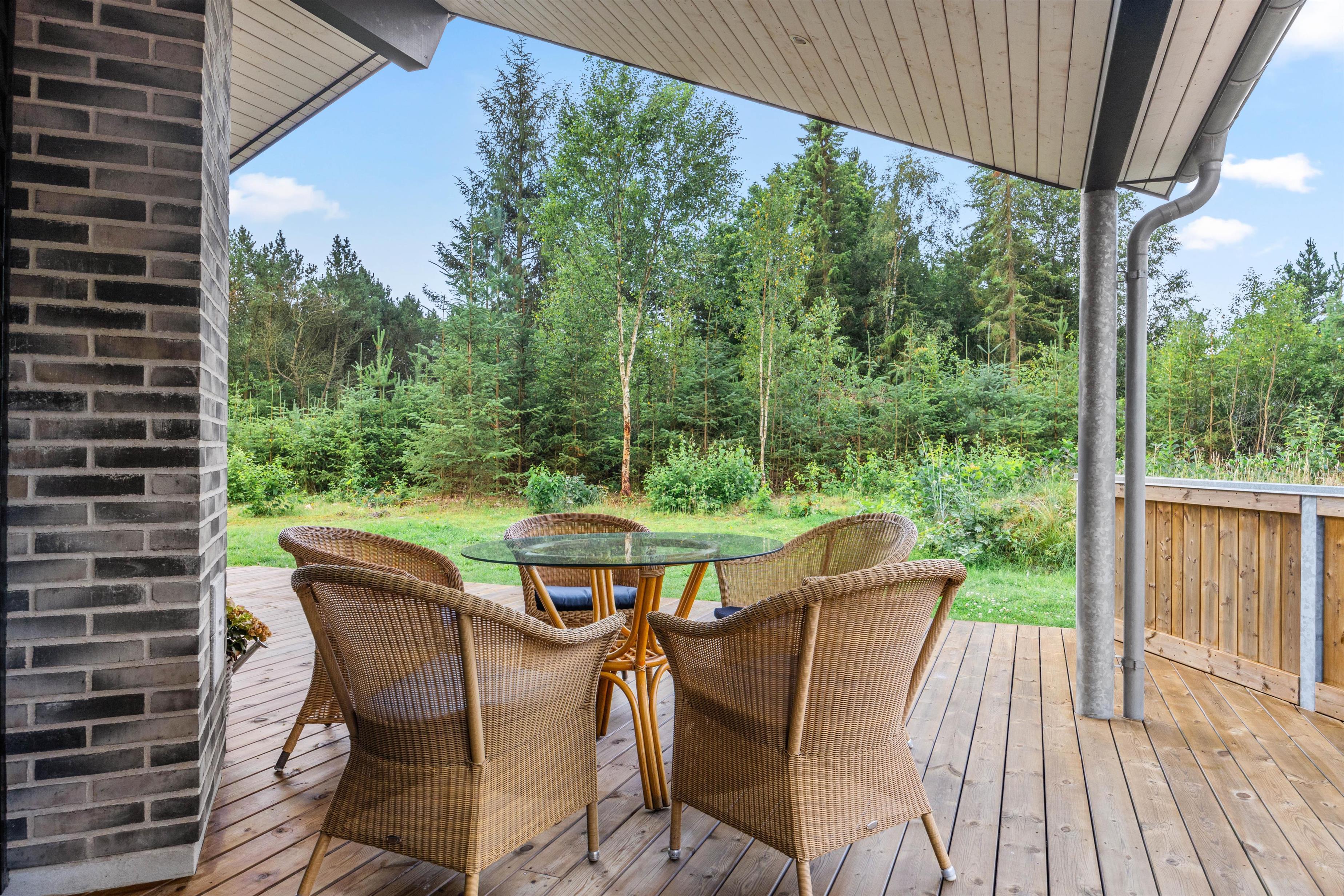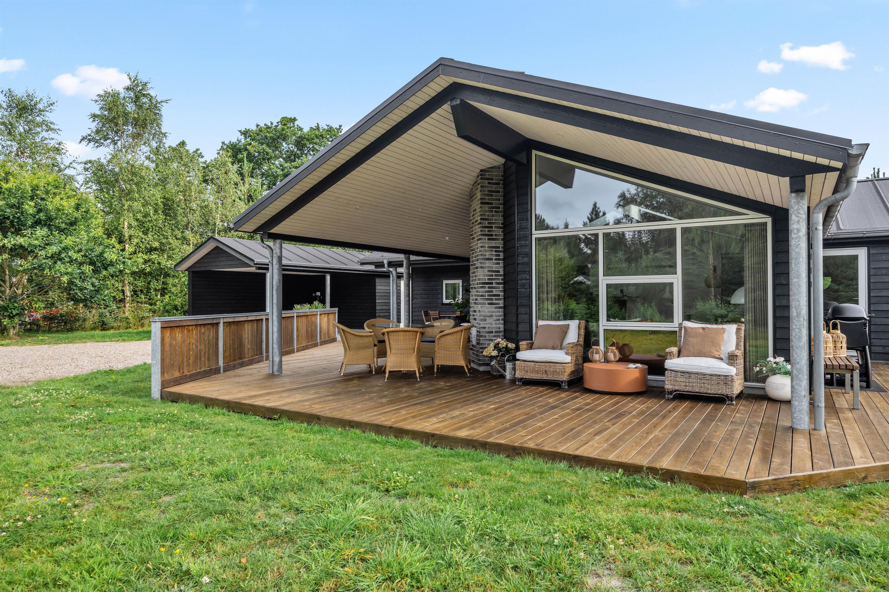 Fra stuen kan I træde ud på den overdækkede terrasse, der er det ideelle sted for måltider under åben himmel, uanset om det er en saftig BBQ eller en hyggelig brunch. Terrassen er også perfekt til at slappe af, hvor I kan lade jer synke ned i solvognene med en god bog under solen. Herfra har I en dejlig udsigt over den frodige plænegrund, som byder på masser af plads til spil og leg for hele familien.