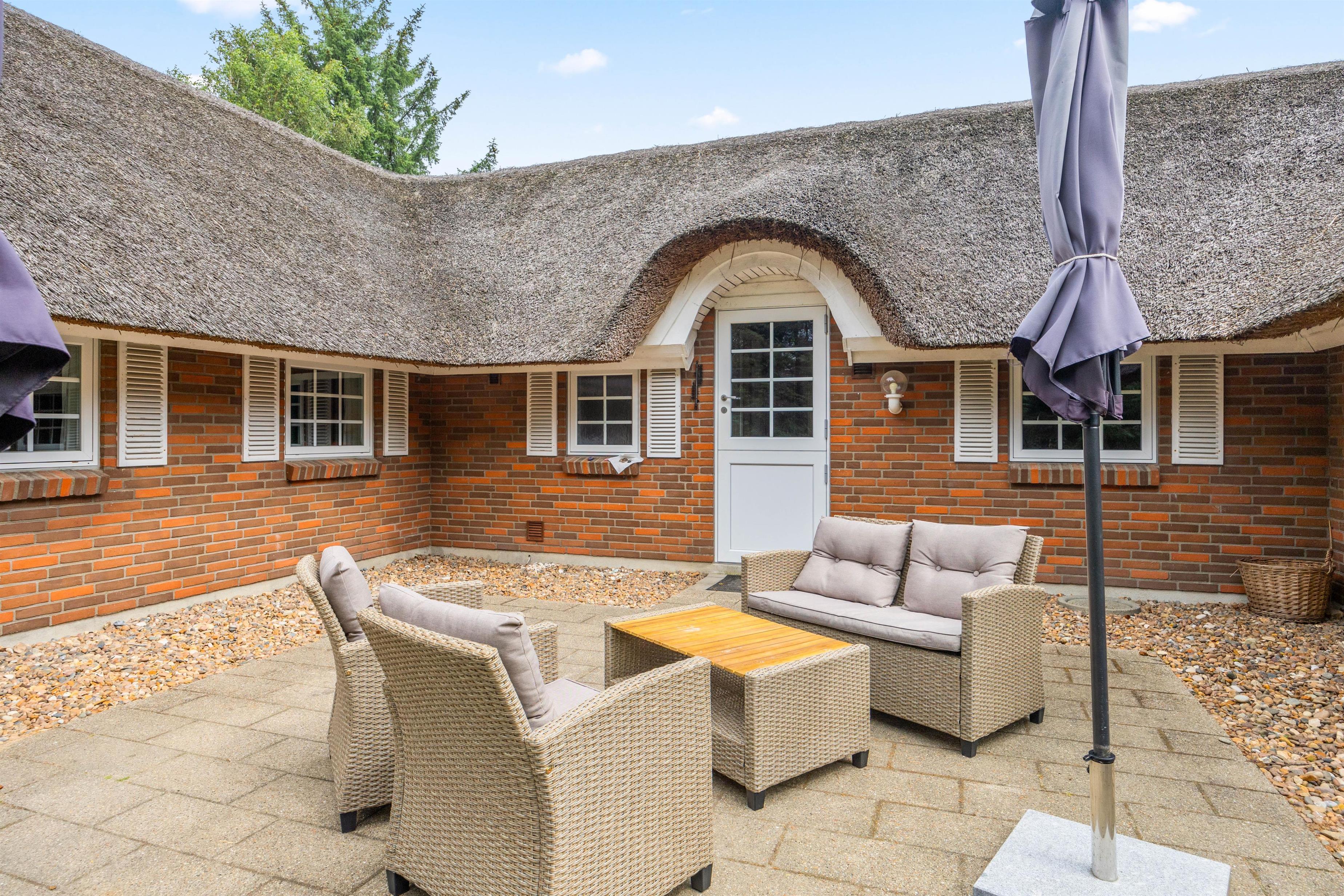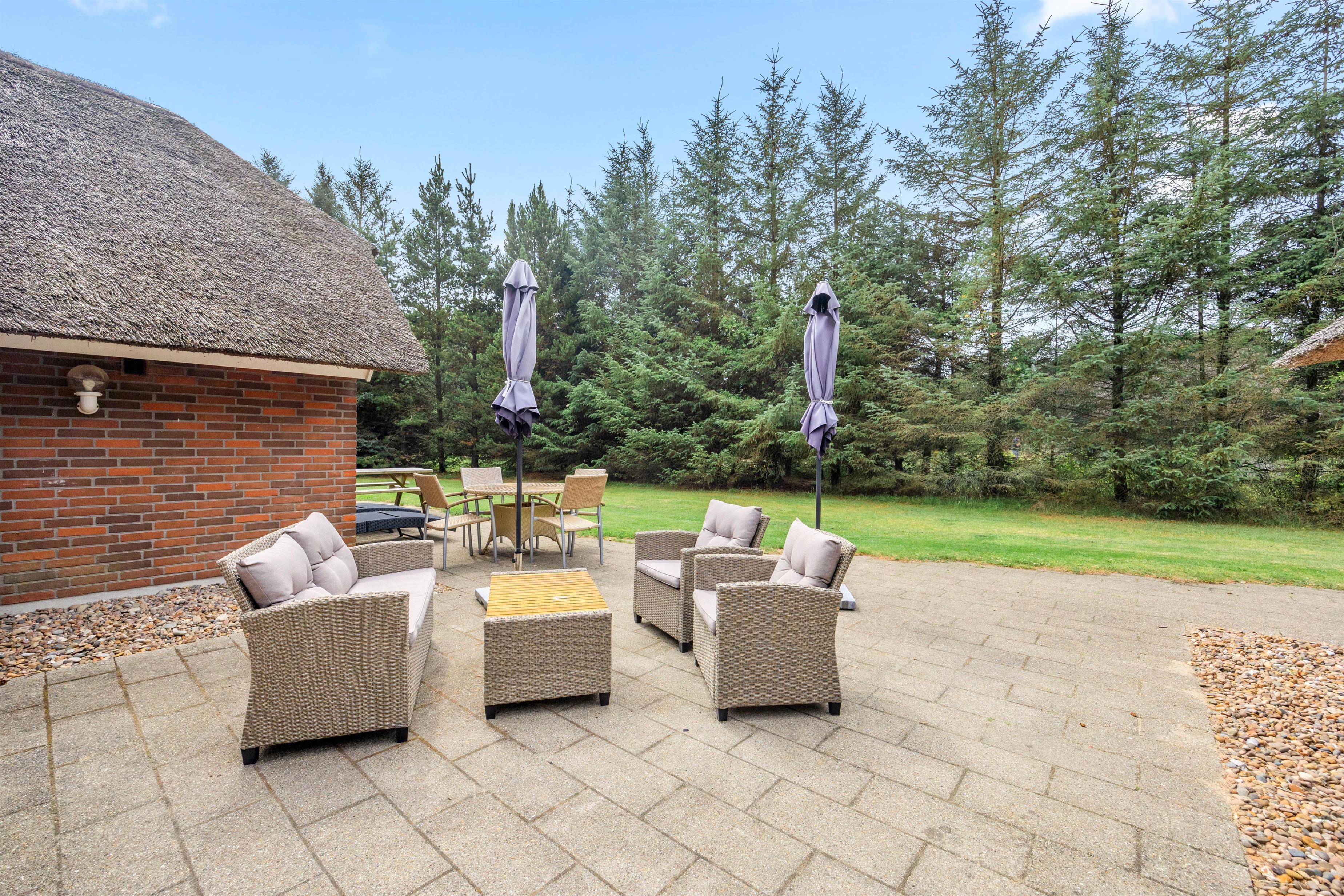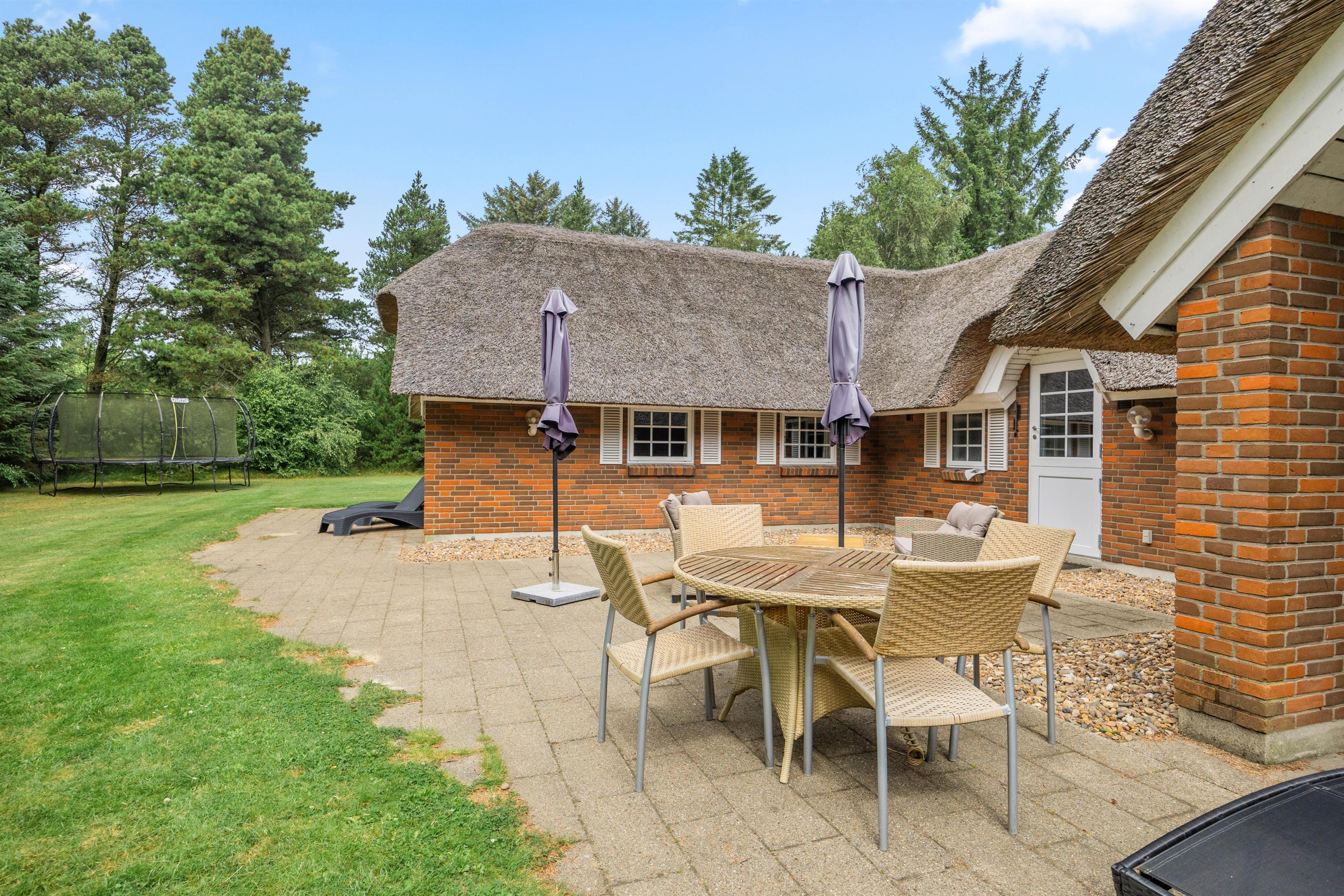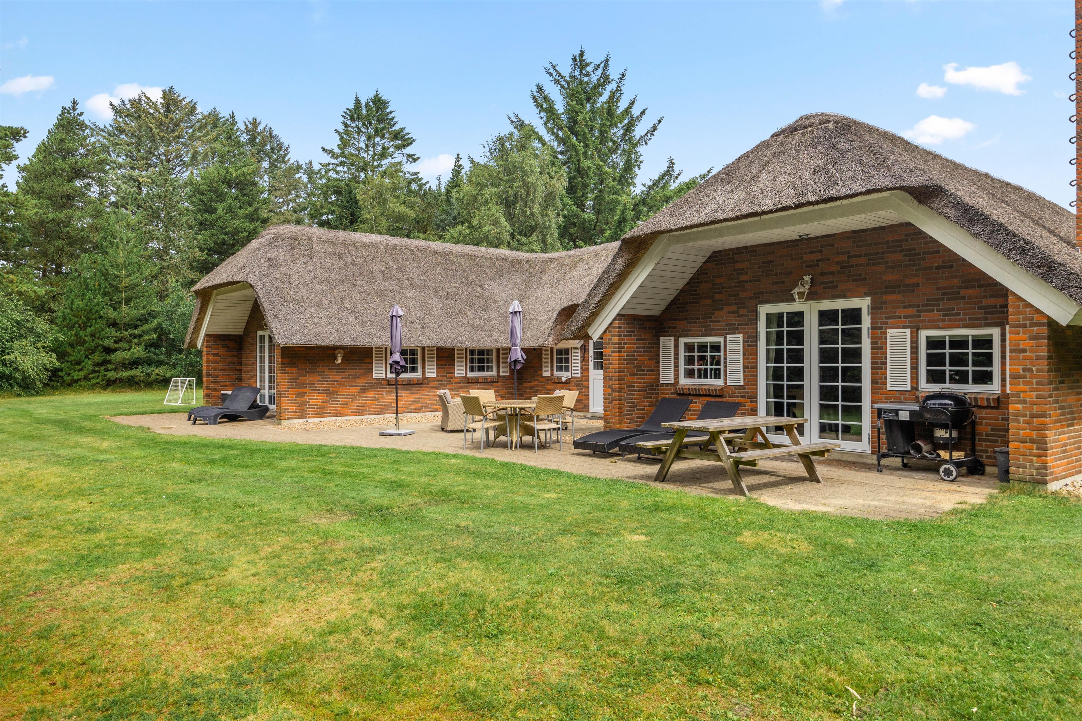 I det skønne ferieområde i Houstrup finder I dette superflotte stråtagshus beliggende på en skøn naturgrund. Udover at være udstyret med en pool, finder I også både sauna og spabad i huset, ligesom der er gode legemulighederne for de mindste udendørs.
