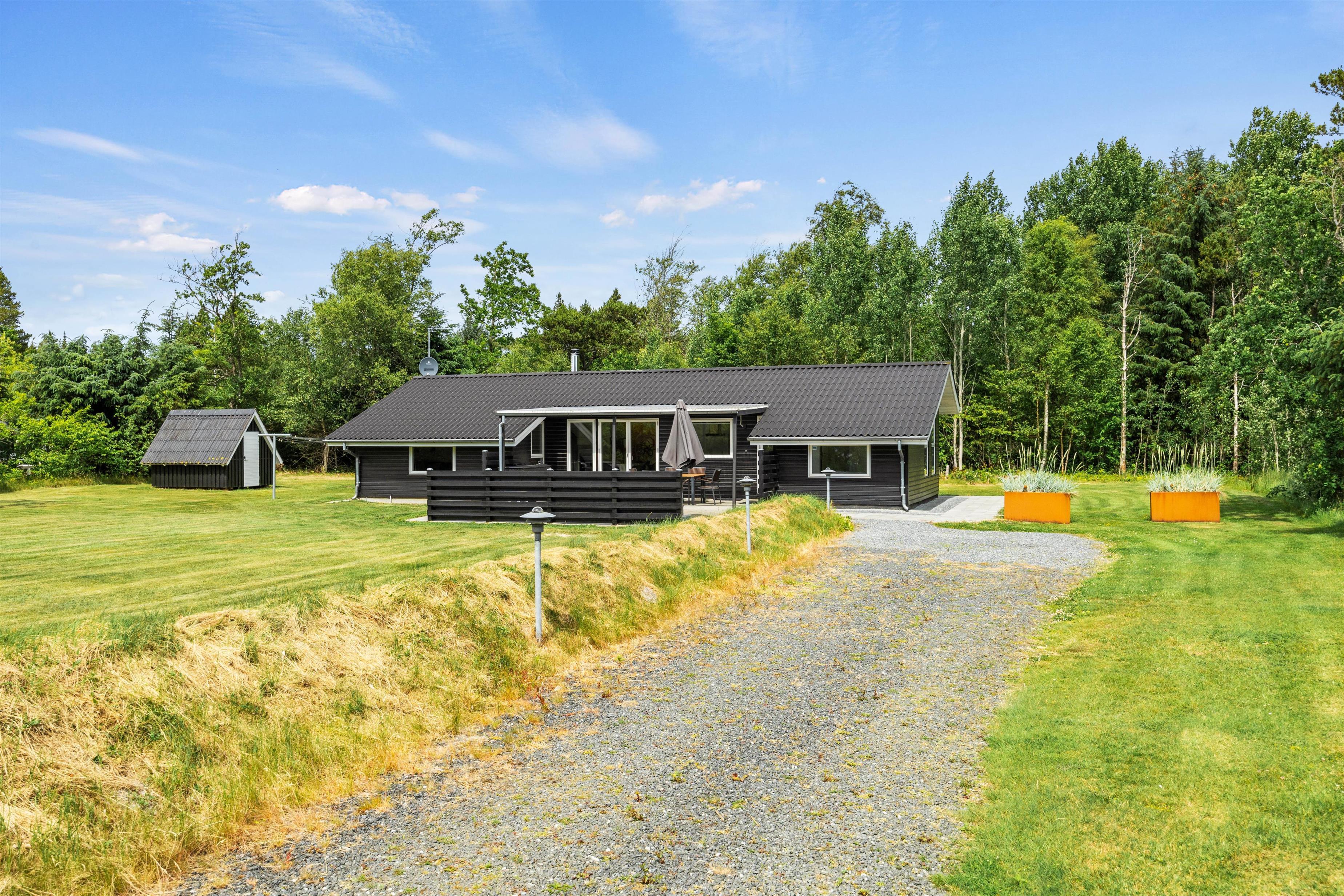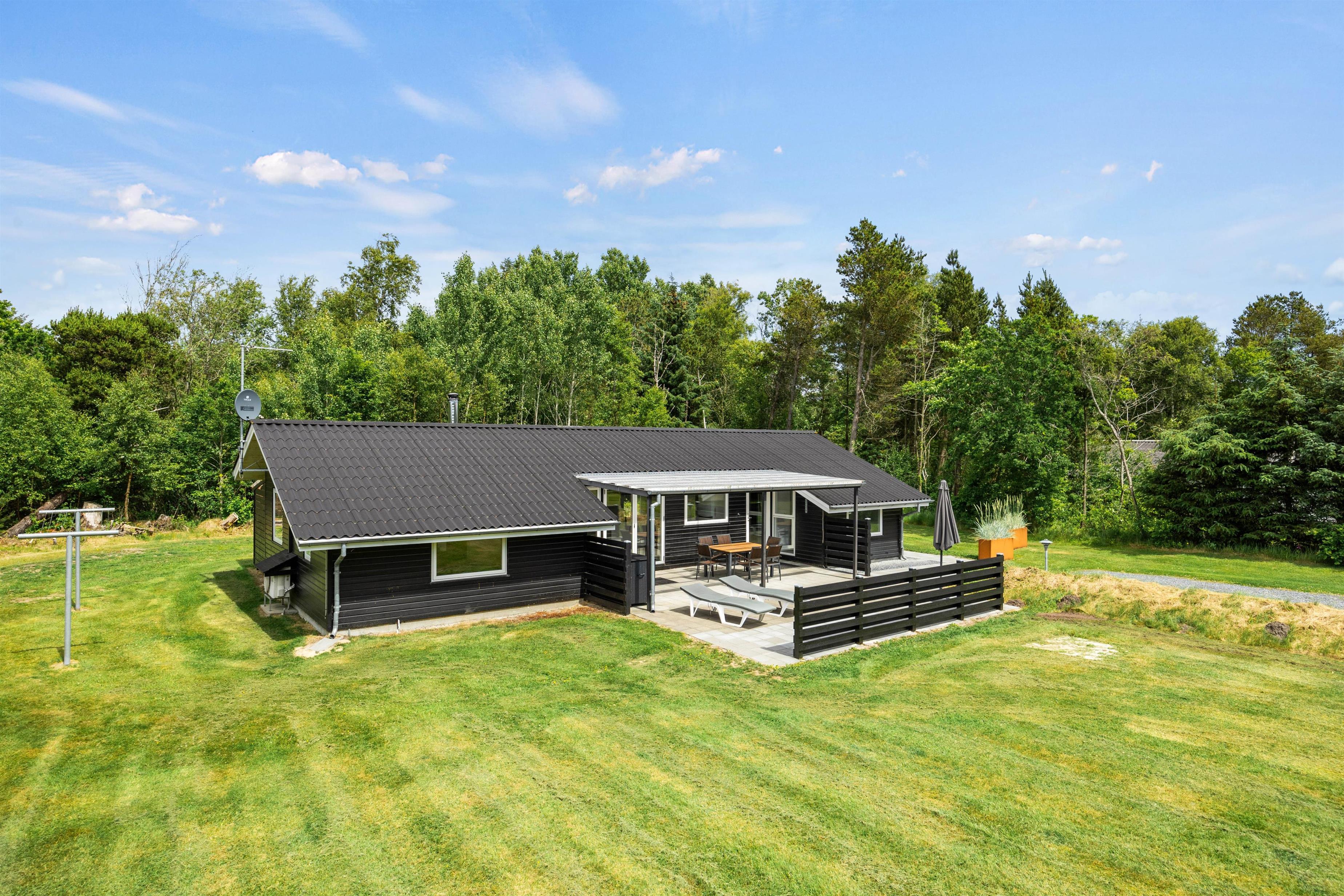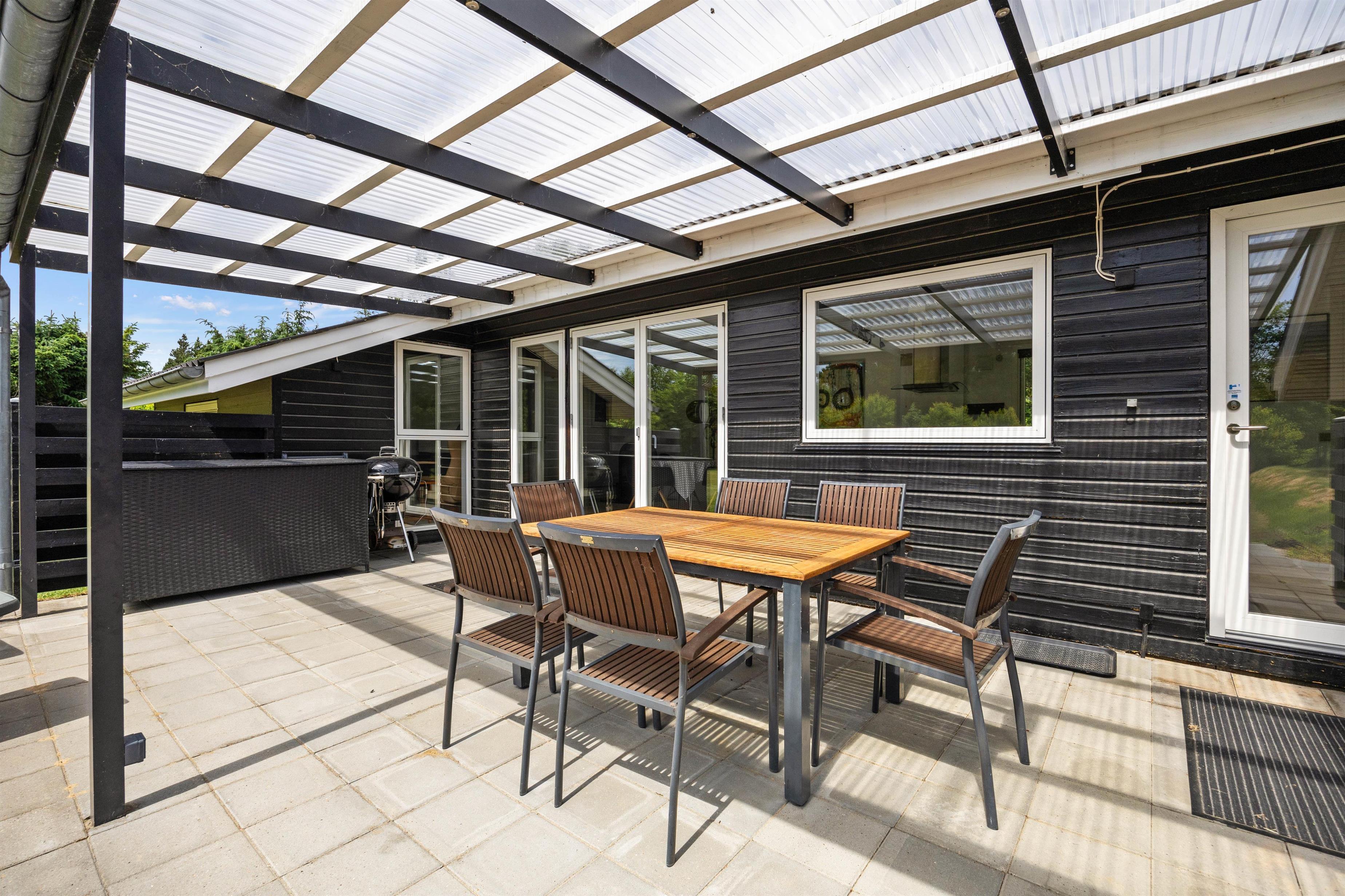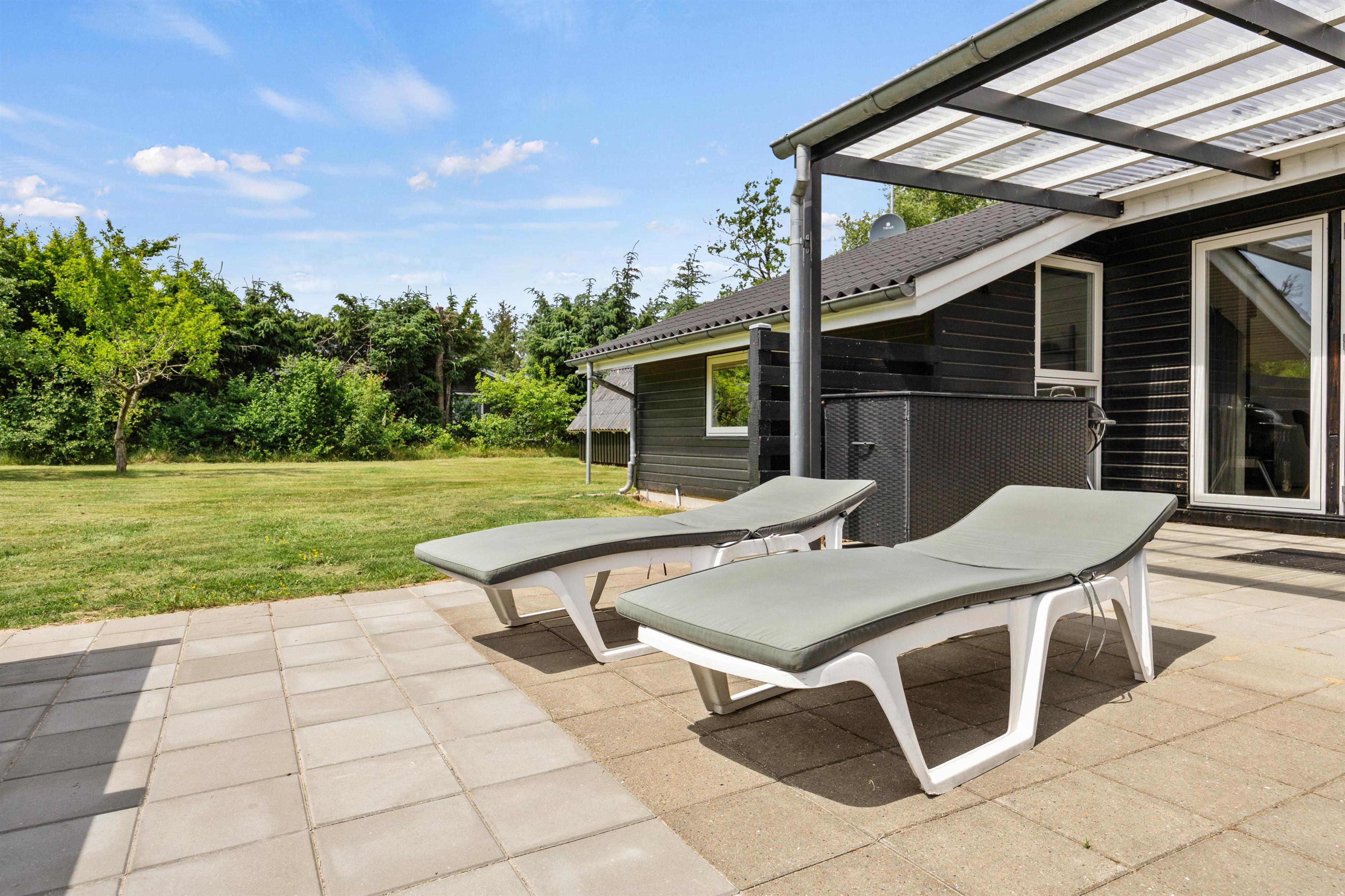 På den åbne terrasse er der gjort klar til, at I kan nyde det gode vejr, og både havemøbler, liggestole og grill står til rådighed fra feriens start, så I kan læse en god bog i solen eller flytte det nybagte morgenbrød og den friskbryggede kaffe udenfor på en lun sommermorgen. De høje træer, der omkranser grunden, giver jer en helt ugeneret beliggenhed med masser af ro og fred.
