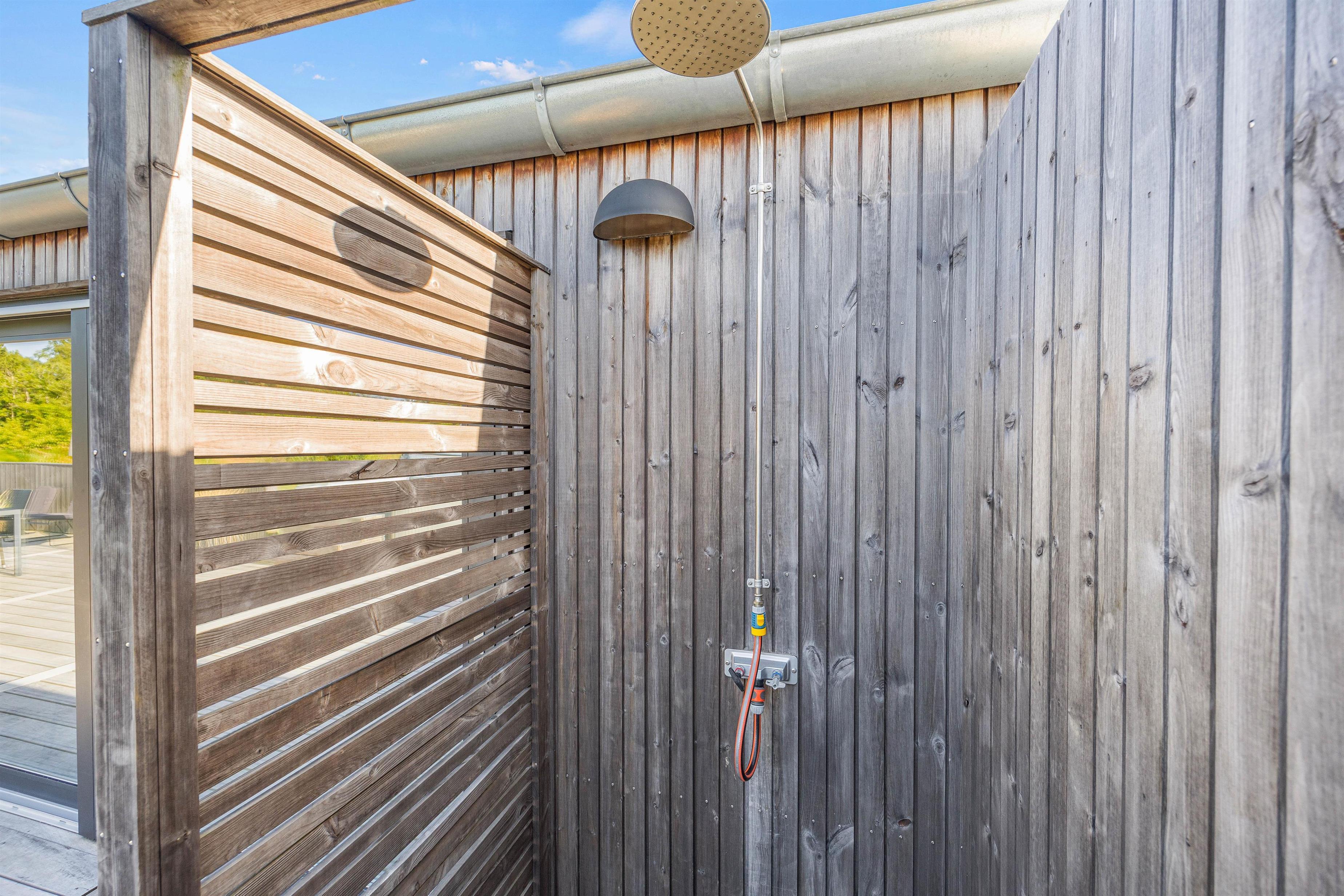 Sommerhuset har en stor lækker terrasse, der er delvist overdækket, hvor I finder en række lækre faciliteter. Her kan I forkæle jer selv med en tur i udespaen, hvor I kan nyde det varme, afslappende vand med en udsigt over den smukke og rolige natur, som sommerhuset er omgivet af. Desuden er der en udendørs bruser på terrassen, hvor I kan skylle jer inden en tur i udespaen eller efter en tur på stranden. Denne kan benyttes fra april til november.