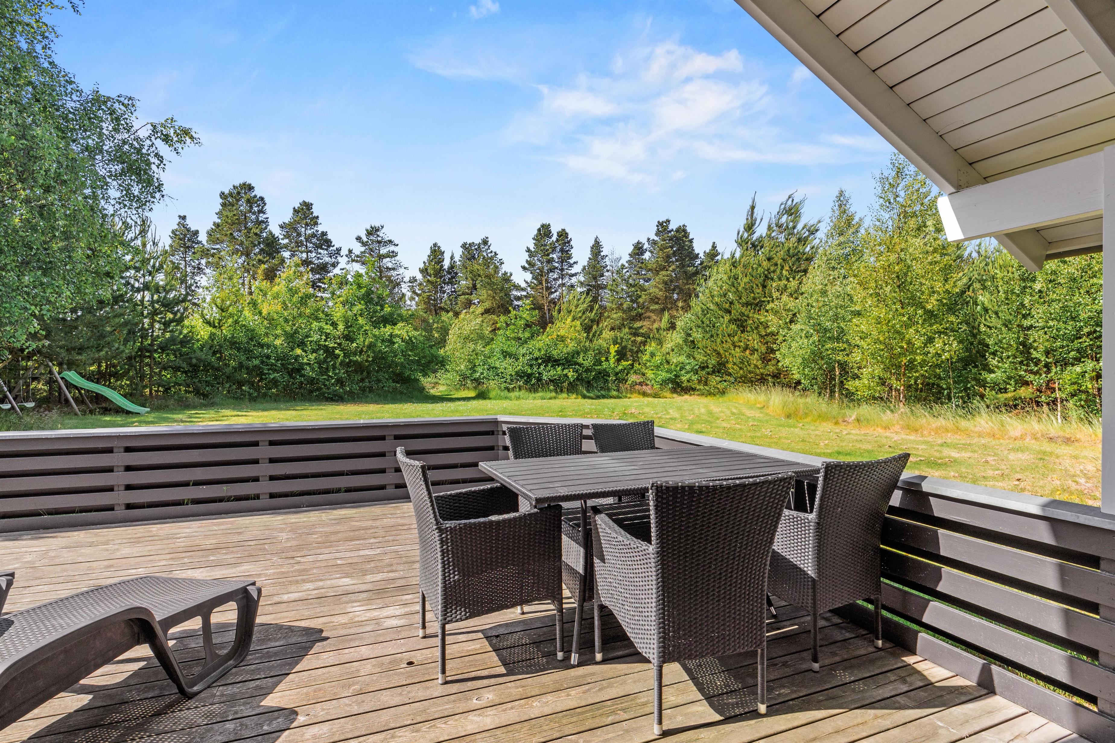 Fra stuen kommer I ud på den store terrasse, hvor havemøblerne står klar, så I rigtig kan nyde de skønne solskinsdage. Mens I nyder feriefreden, er der rig mulighed for leg og boldspil på den store græsplæne for hundene, børnene og de barnlige sjæle.