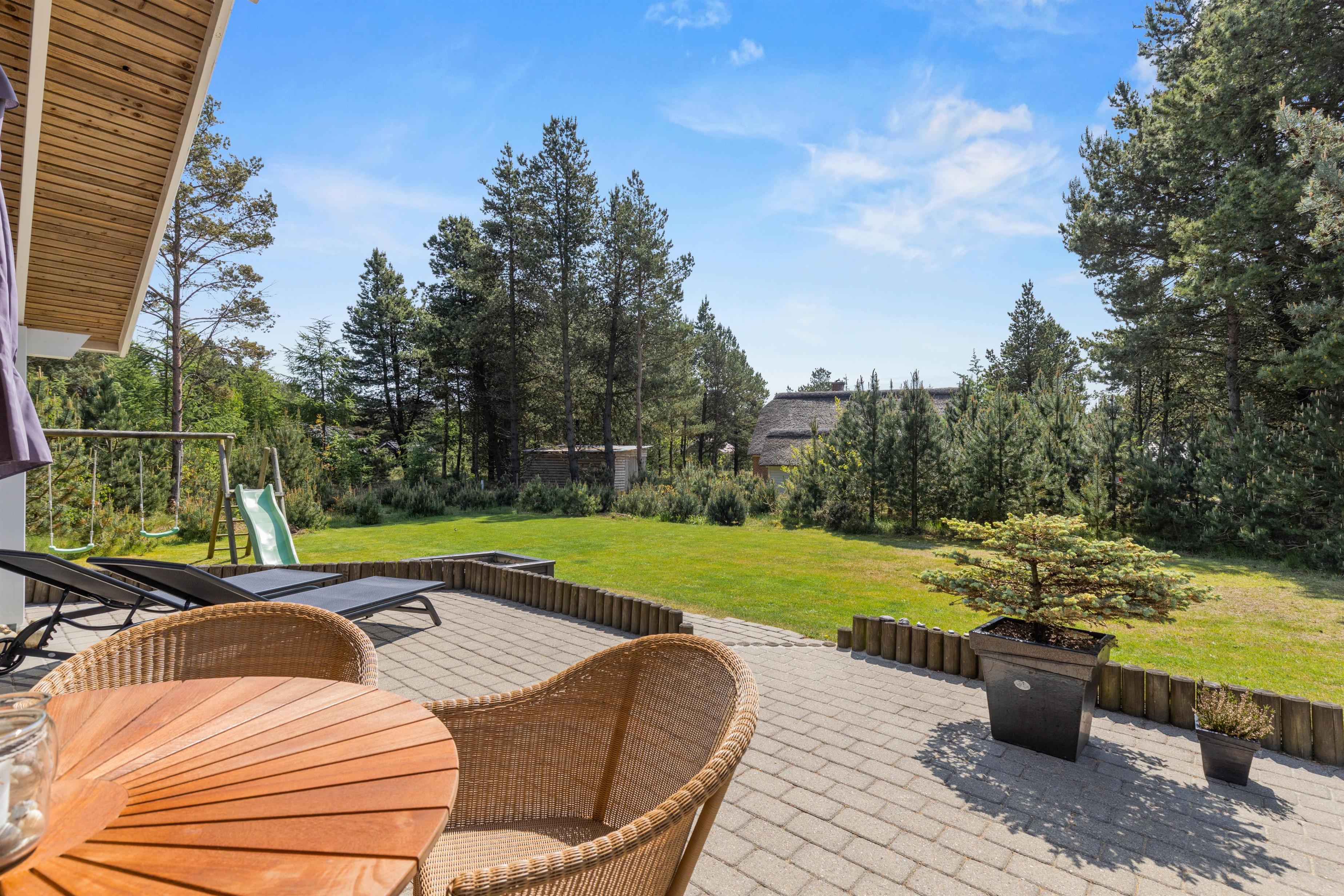 På Guldvangen 42 er terrassen belagt med sten, med flere hyggehjørner og komfortable havemøbler, så I kan nyde solen hele dagen. Fra stuen kan man gå direkte ud på terrassen, der er delvist overdækket. Til sommerhuset hører også liggestole, så I kan lade batterierne op. Foretrækker I afslapning i skyggen, kan I benytte jer af havens parasol.