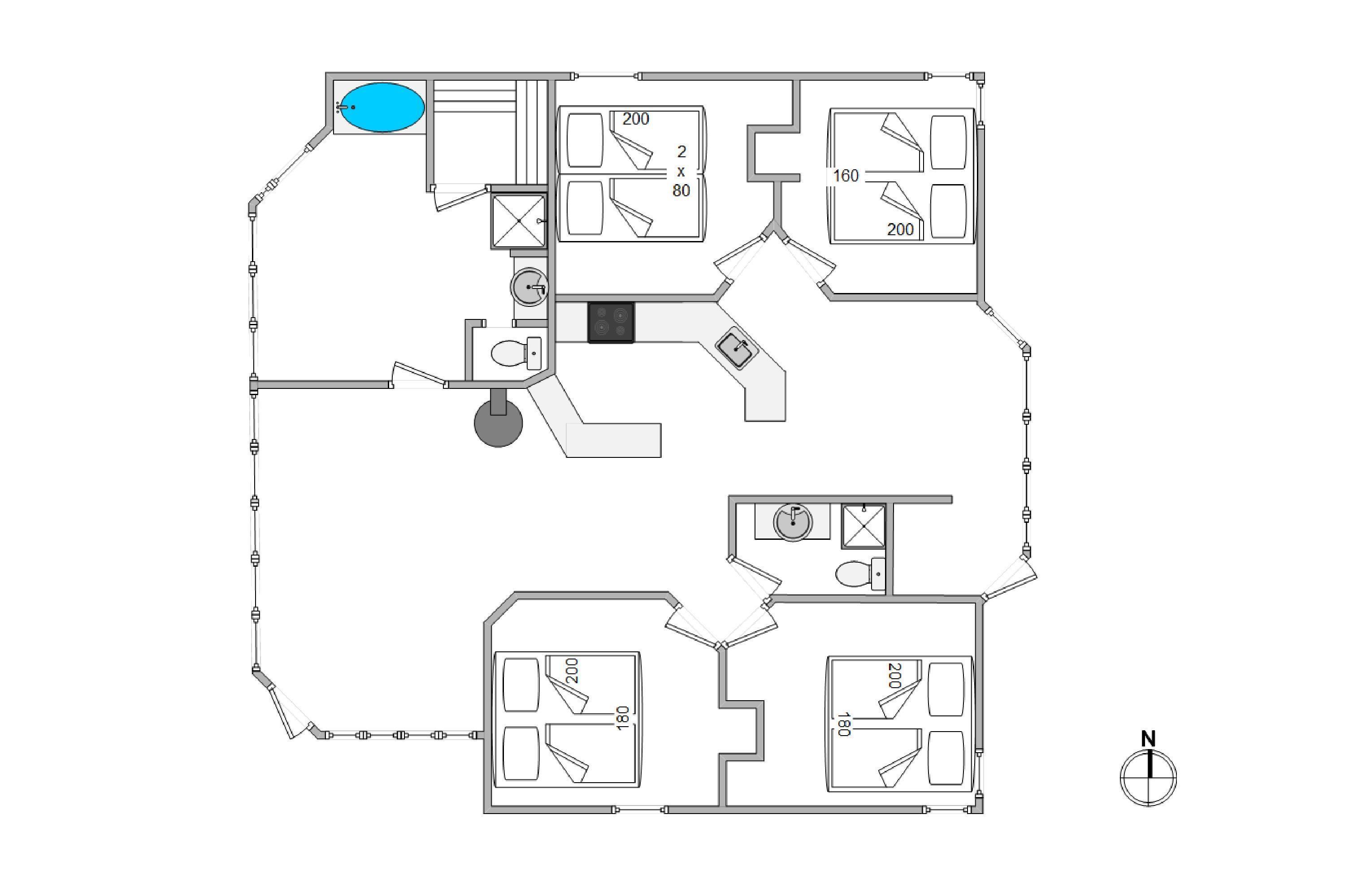 I dette hyggelige sommerhus er der plads til helt op til 8 personer. Sommerhuset er godt opdelt og kan sagtens rumme to familier, og det er også udstyret med 2 badeværelser, så I slipper for toiletkø om morgenen. På det største badeværelse finder I sommerhusets highlights, saunaen og spabadet, som ligegyldigt årstid, vind og vejr giver perfekte muligheder for at slappe af og lade batterierne op, langt væk fra hverdagen.
