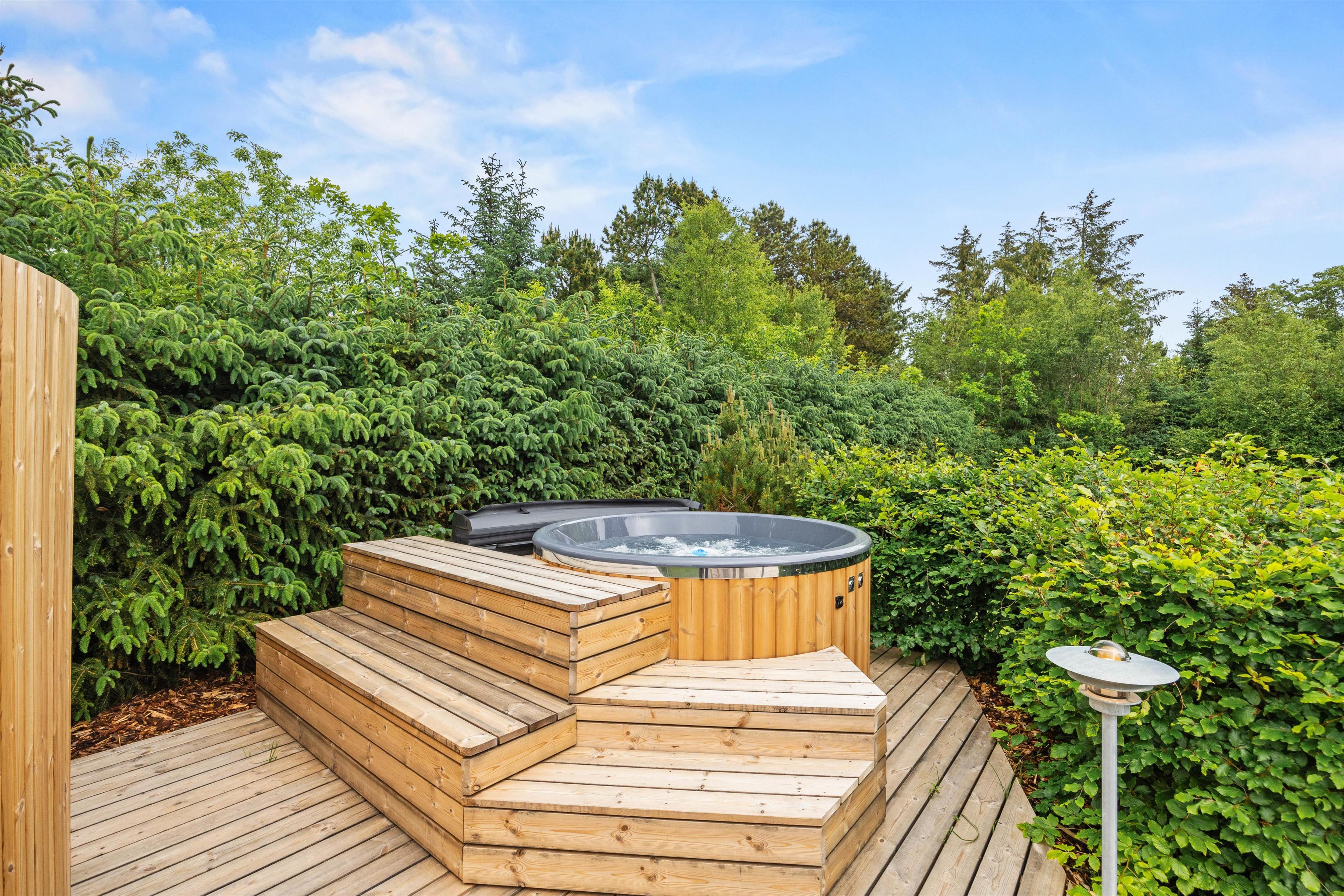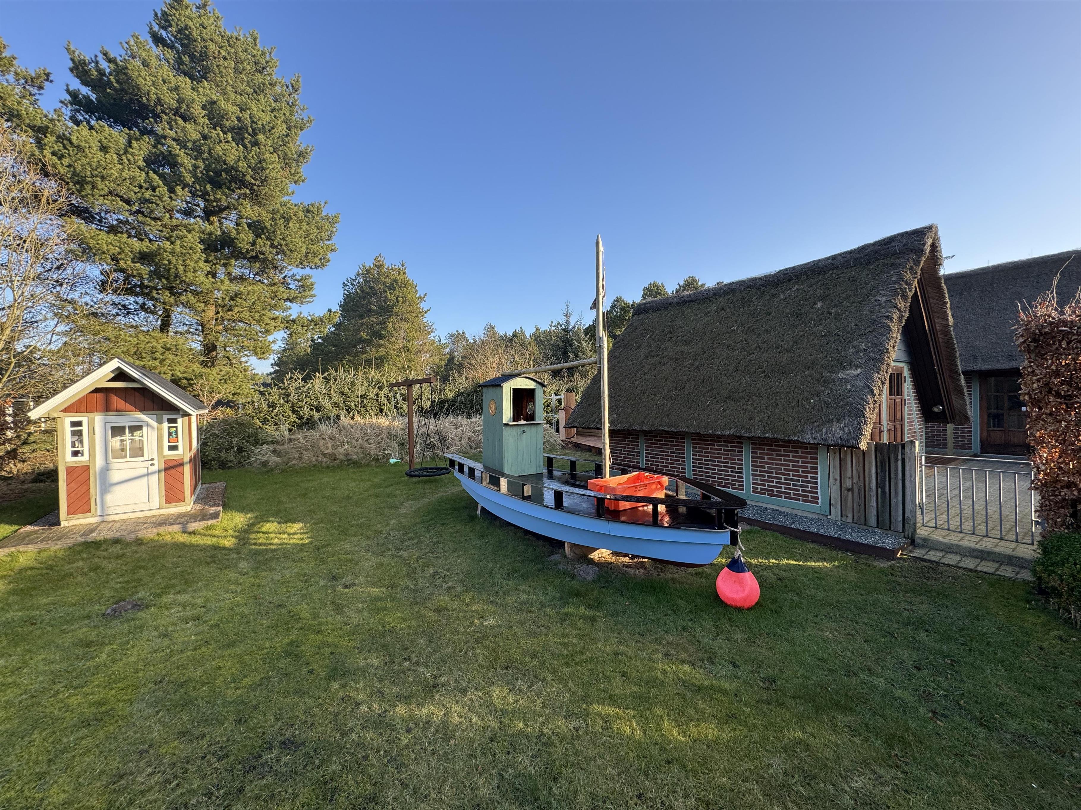 For børnene er der en gynge, et legehus og et piratskib at lege på, som også har sandkasse, der indbyder til timevis af sjov og leg. Rundt om feriehuset findes både en afskærmet og en åben terrasse, hvilket giver mulighed for at nyde solen hele dagen, når den skinner.