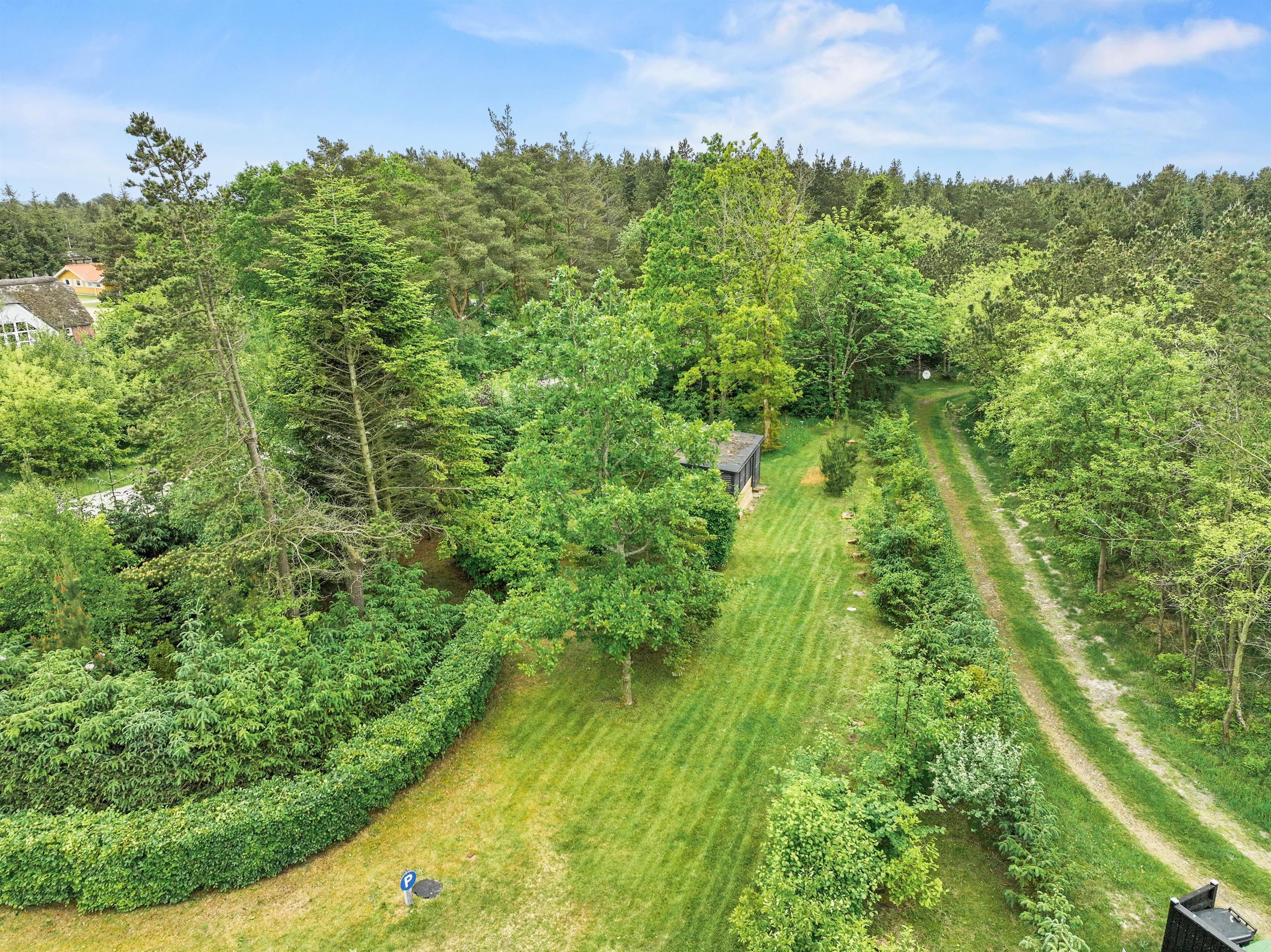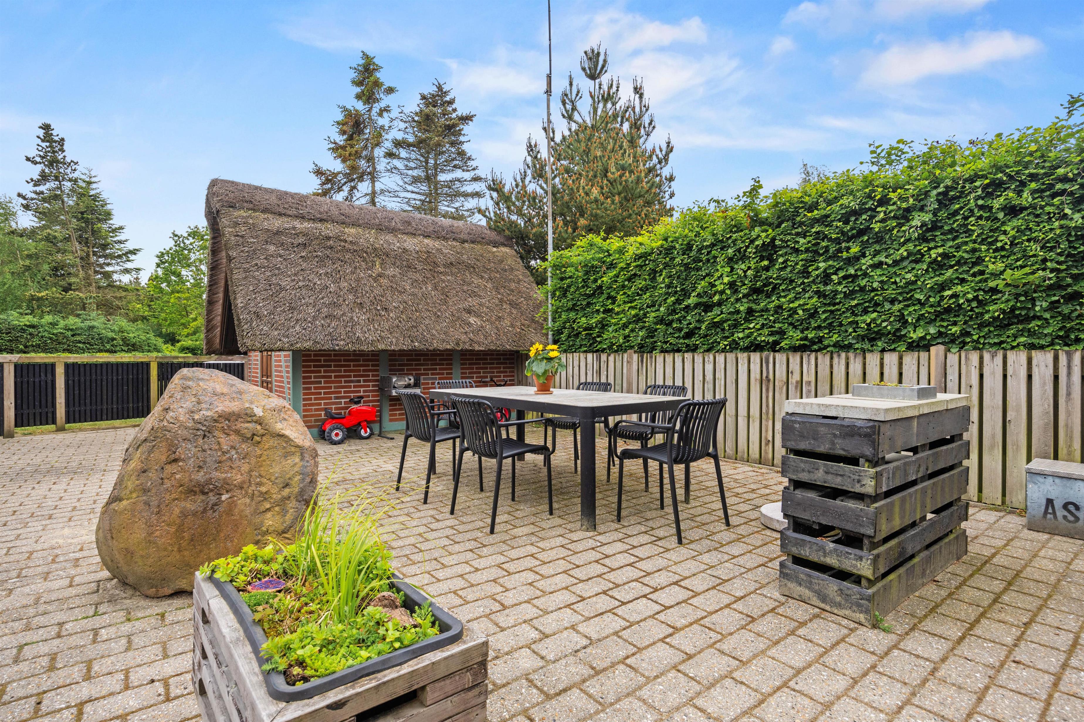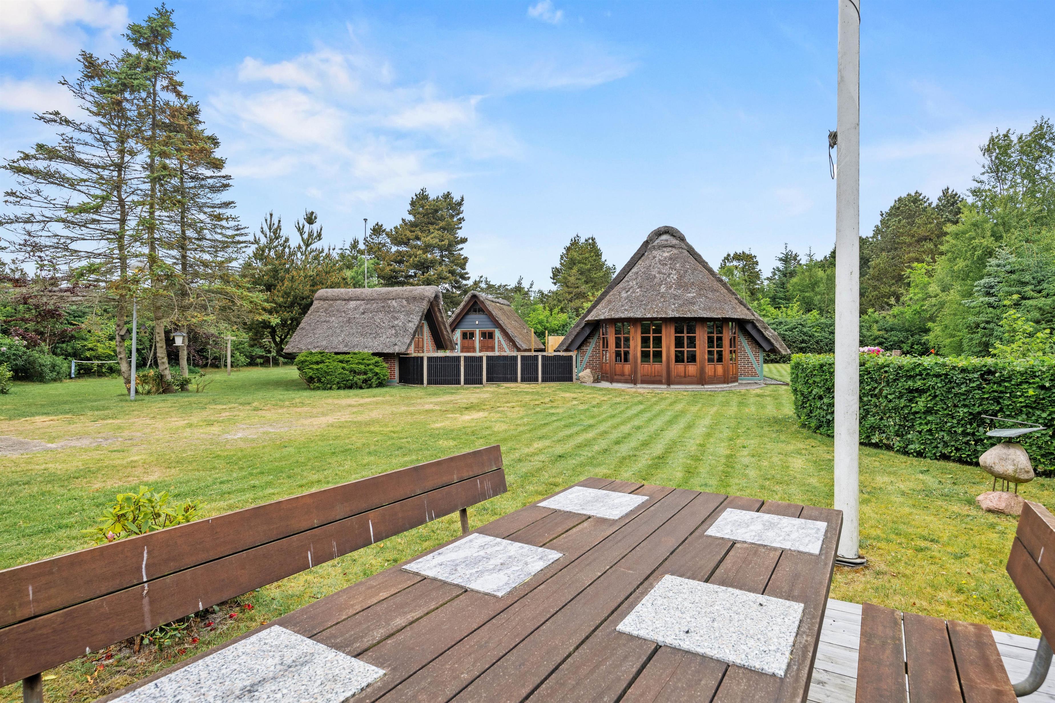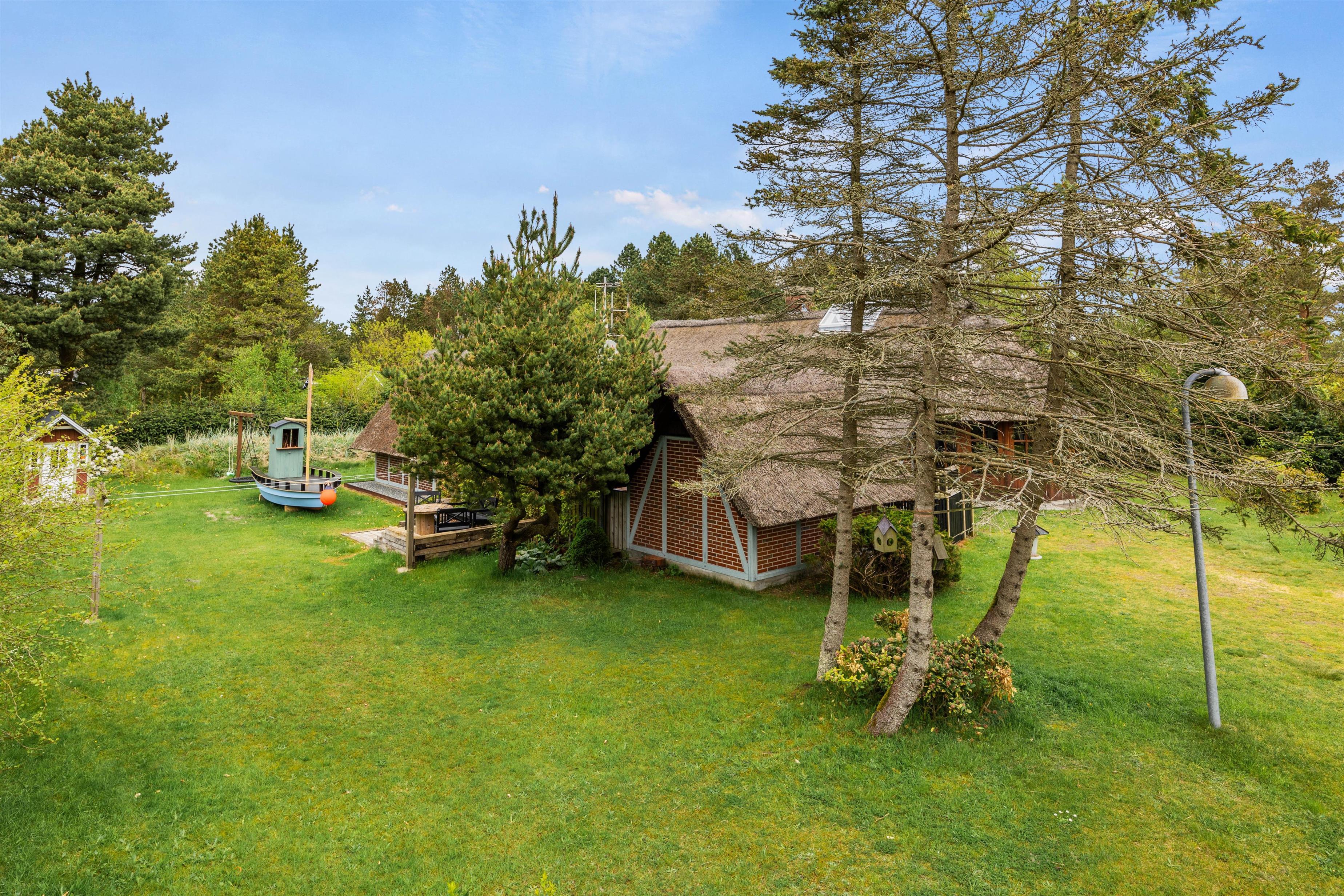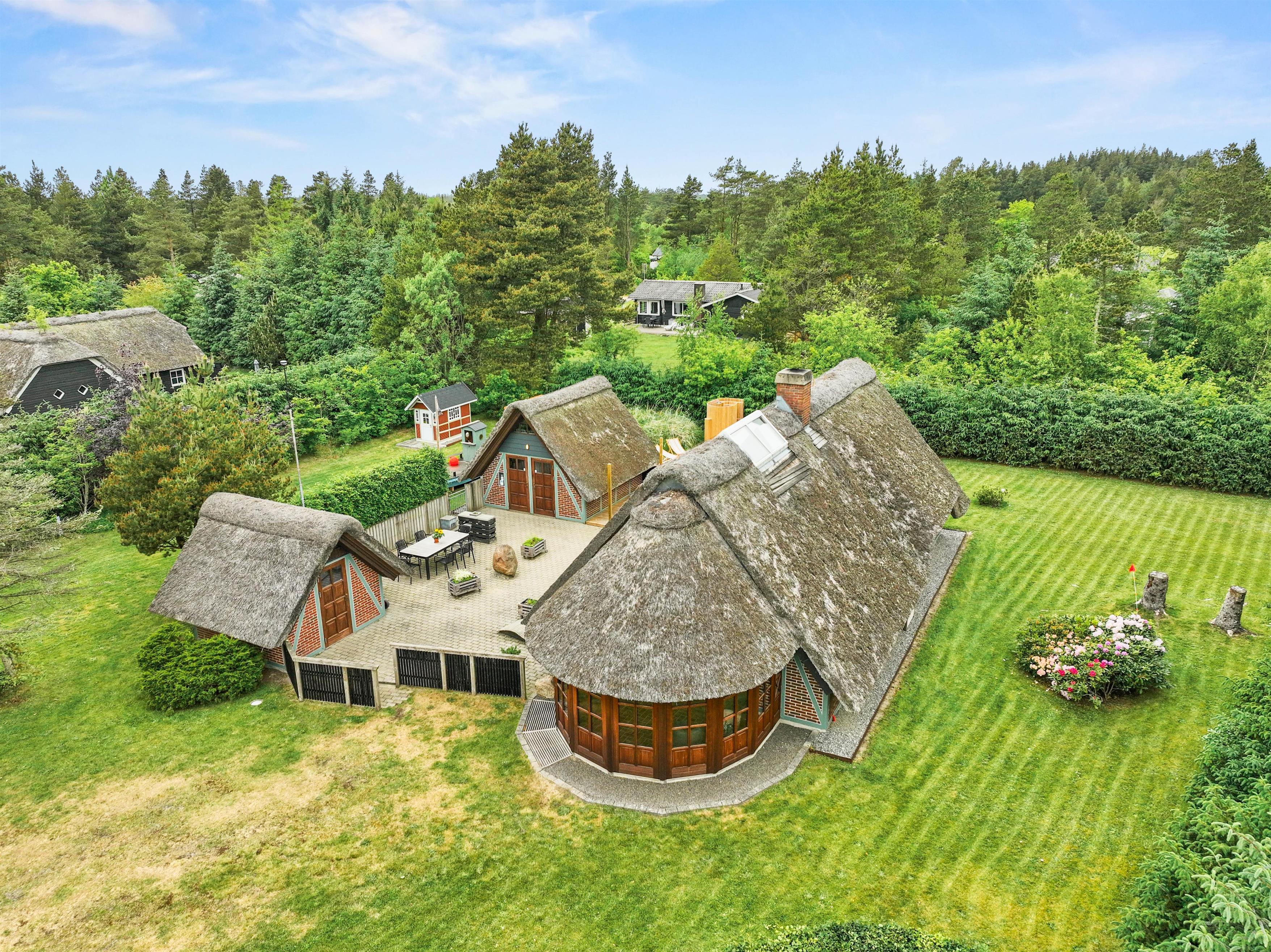 Det stråtækte sommerhus er indlejret på en 2949 kvadratmeter stor naturgrund, omgivet af store træer, der skaber en atmosfære af hygge og leg i haven. Udenfor tilbyder ferieboligen en grill, havemøbler og solvogne til afslapning under åben himmel.