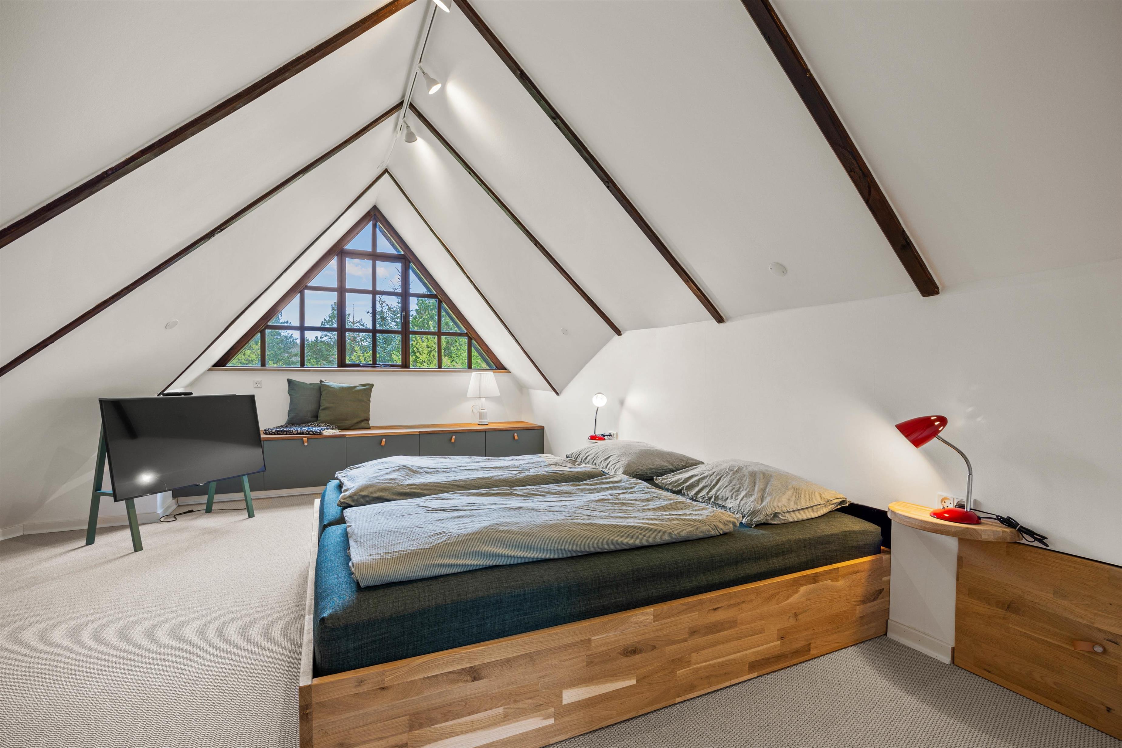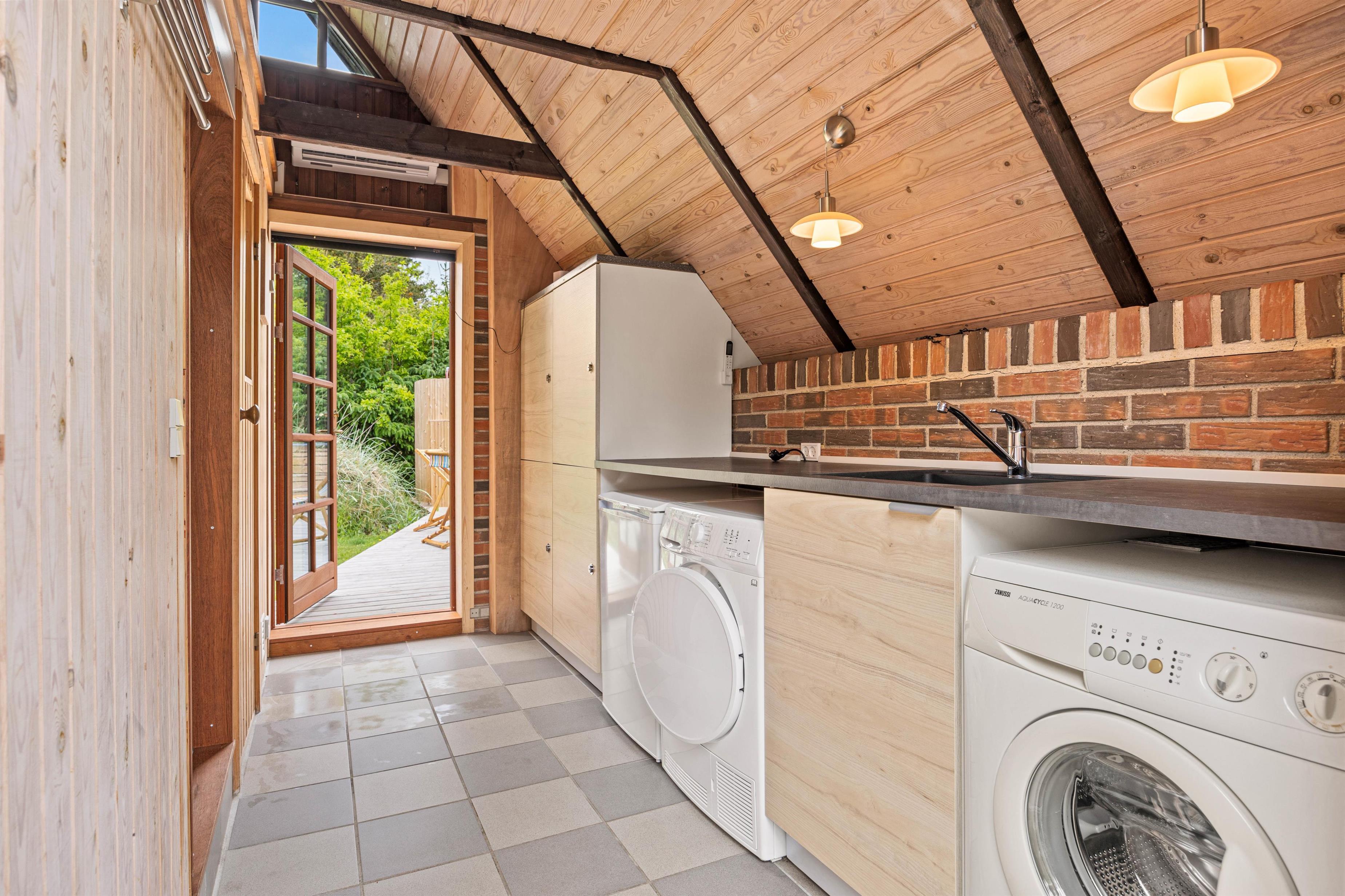 Feriehuset indvendigt er udstyret med moderne bekvemmeligheder og charmerende detaljer, der skaber den perfekte ramme for en afslappende ferie. Der er en vaskemaskine og en tørretumbler til rådighed, så du kan let holde dit tøj rent og frisk. En varmepumpe sikrer behagelige temperaturer året rundt. Med 2 soveværelser, hvoraf det ene har en dobbeltseng på 160x200 cm og det andet værelse har 2 enkelte senge på 80x200 cm, der nemt kan rykkes sammen som en dobbeltseng. På 1. sal er der et værelse med en sovesofa der nemt kan udtrækkes til en dobbeltseng på 180x200 cm og her er også fjernsyn.