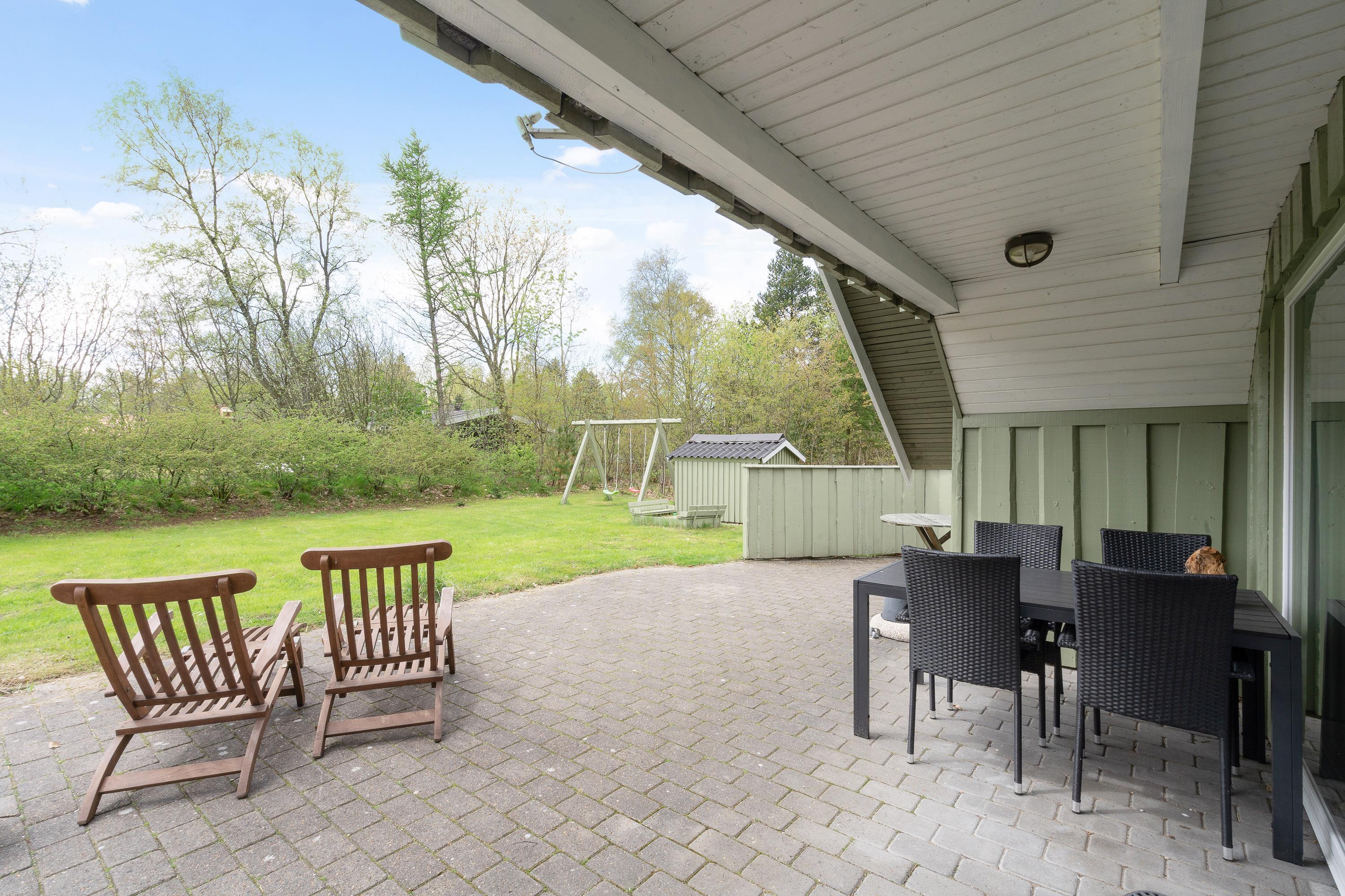Fra stuen kommer I ud på den delvist overdækkede terrasse, hvor havemøblerne og grillen står klar til jer. Her kan I samle familien til hyggelige grillmiddage eller bare slappe af med en god bog og en kop kaffe, mens solens stråler finder vej gennem de omkringliggende træer. På de solrige dage kan I nyde varmen på terrassen i den flotte natur, mens børnene leger i haven med både gyngestativ og sandkasse.