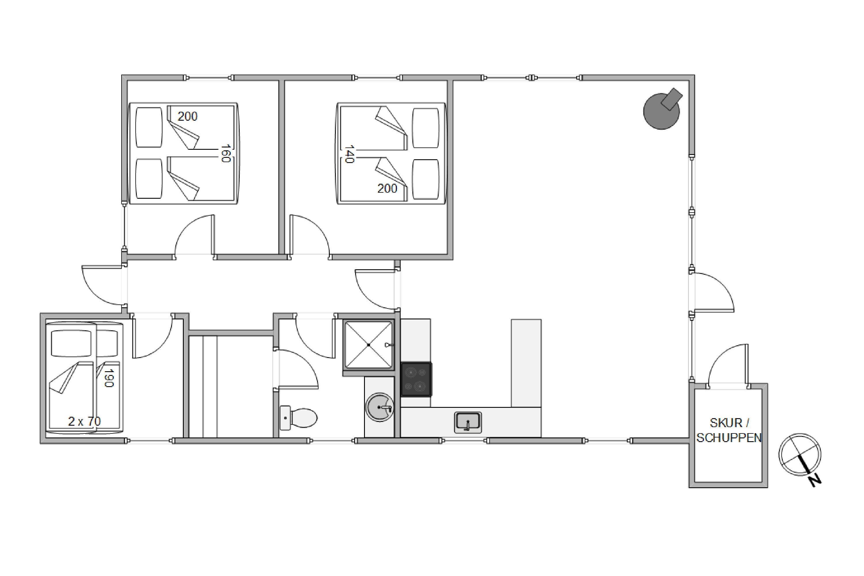 Når mørket falder på, og I har nydt flammerne fra brændeovnen, kan I krybe ind i sommerhuset i alt 3 soverum med i alt 6 sovepladser, med henholdsvis dobbeltsenge og køjesenge, så der er plads til hele familien eller vennegruppen.