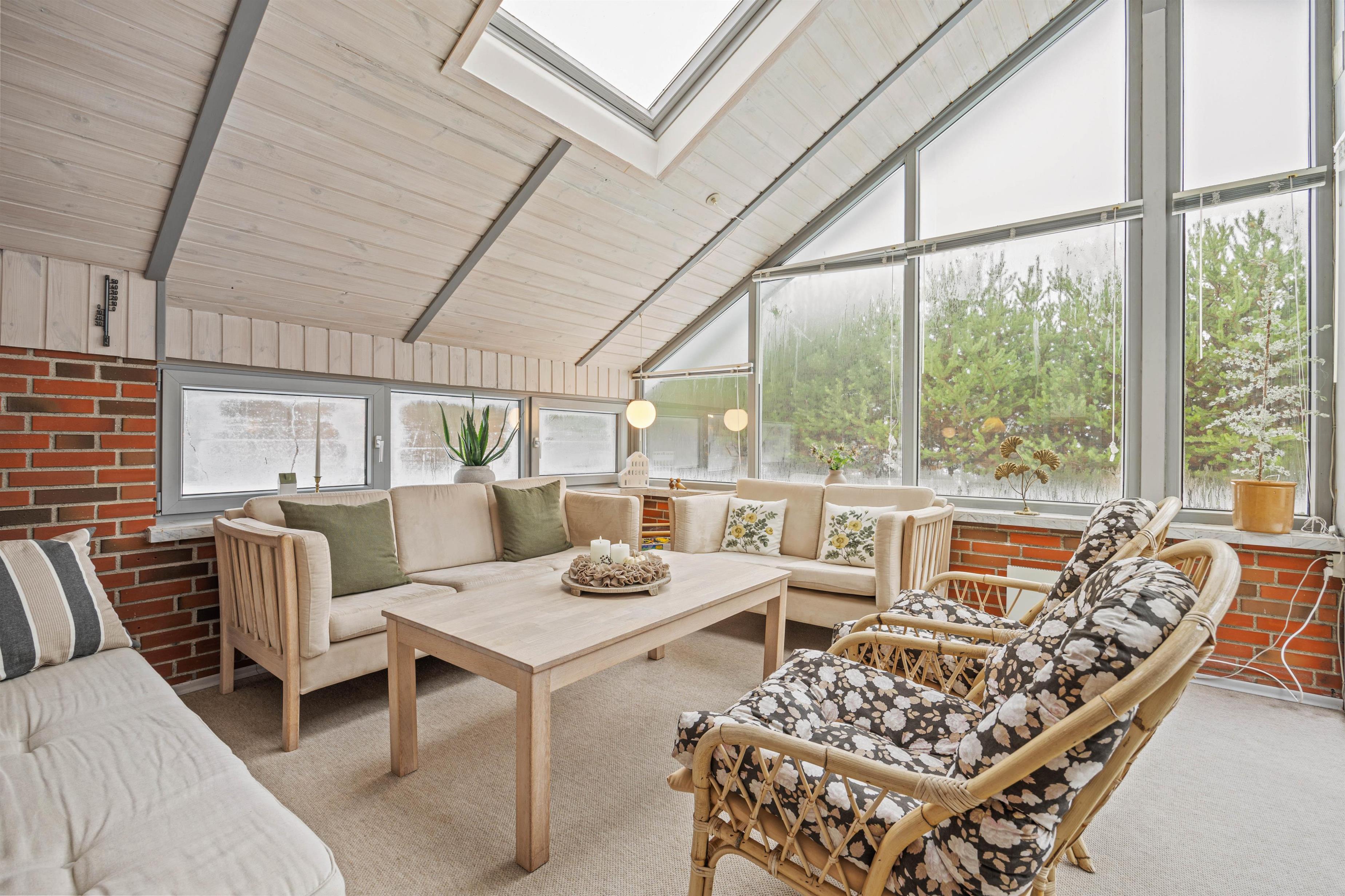 Fra stuen kommer I ind i et af feriehusets highlights, udestuen. Gennem de store vinduer har I frit udsyn til Houstrups grønne natur, og der findes næppe noget mere afslappende end at nyde en varm kop kaffe, mens regnen trommer på ruderne.