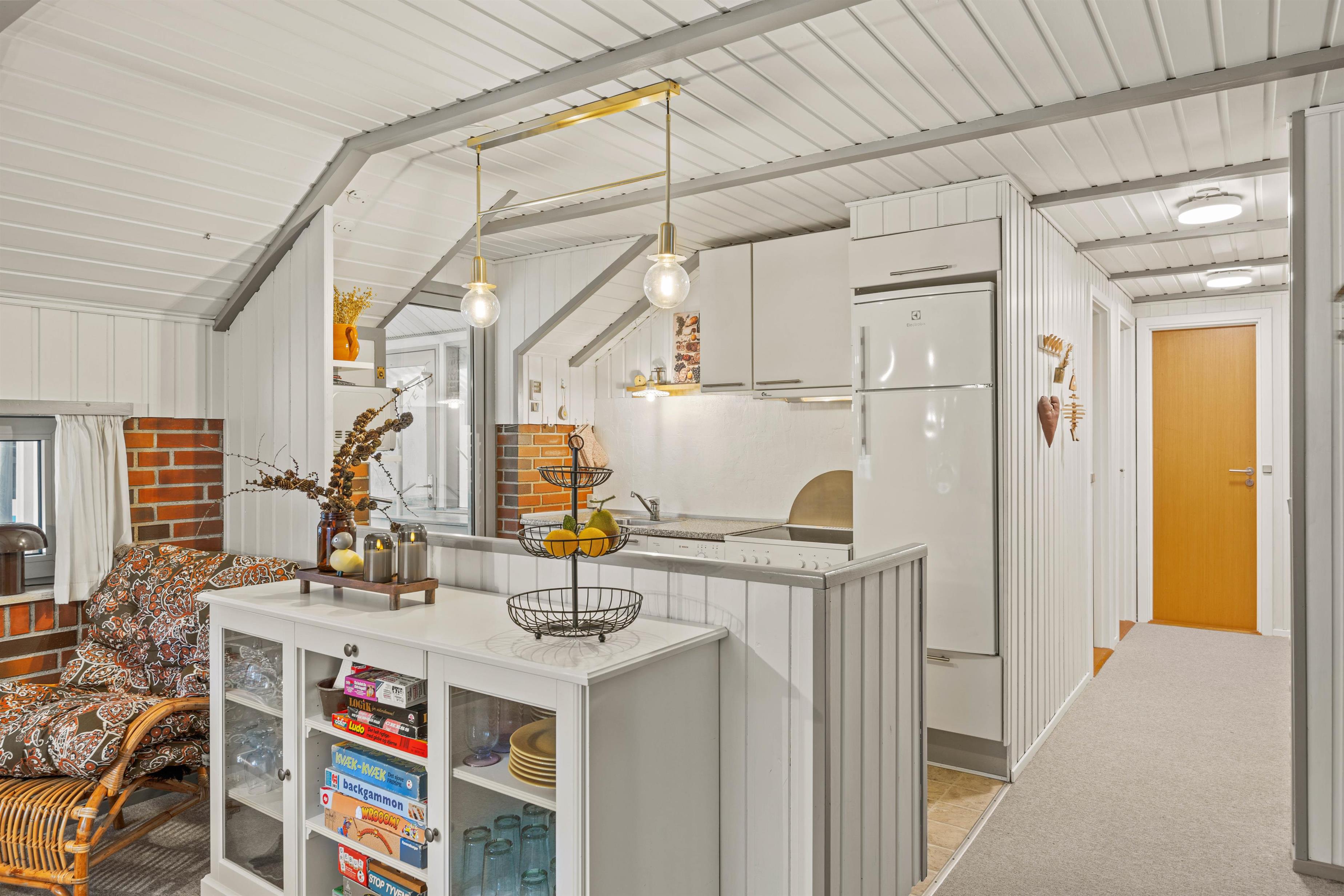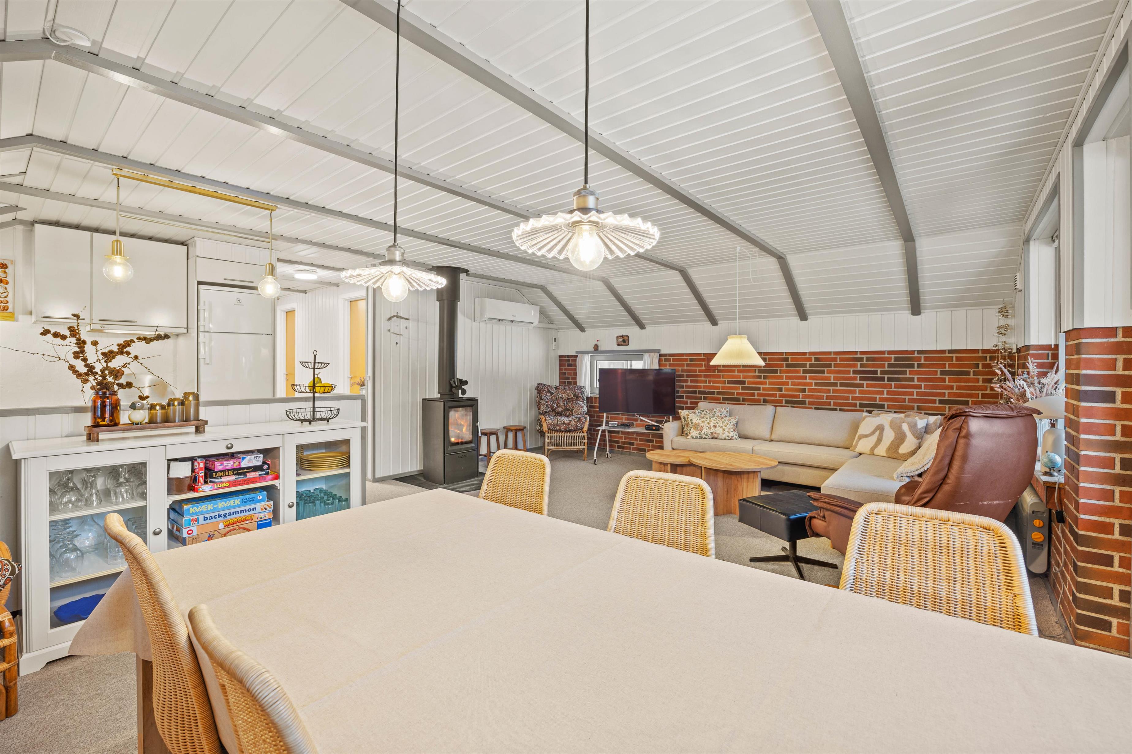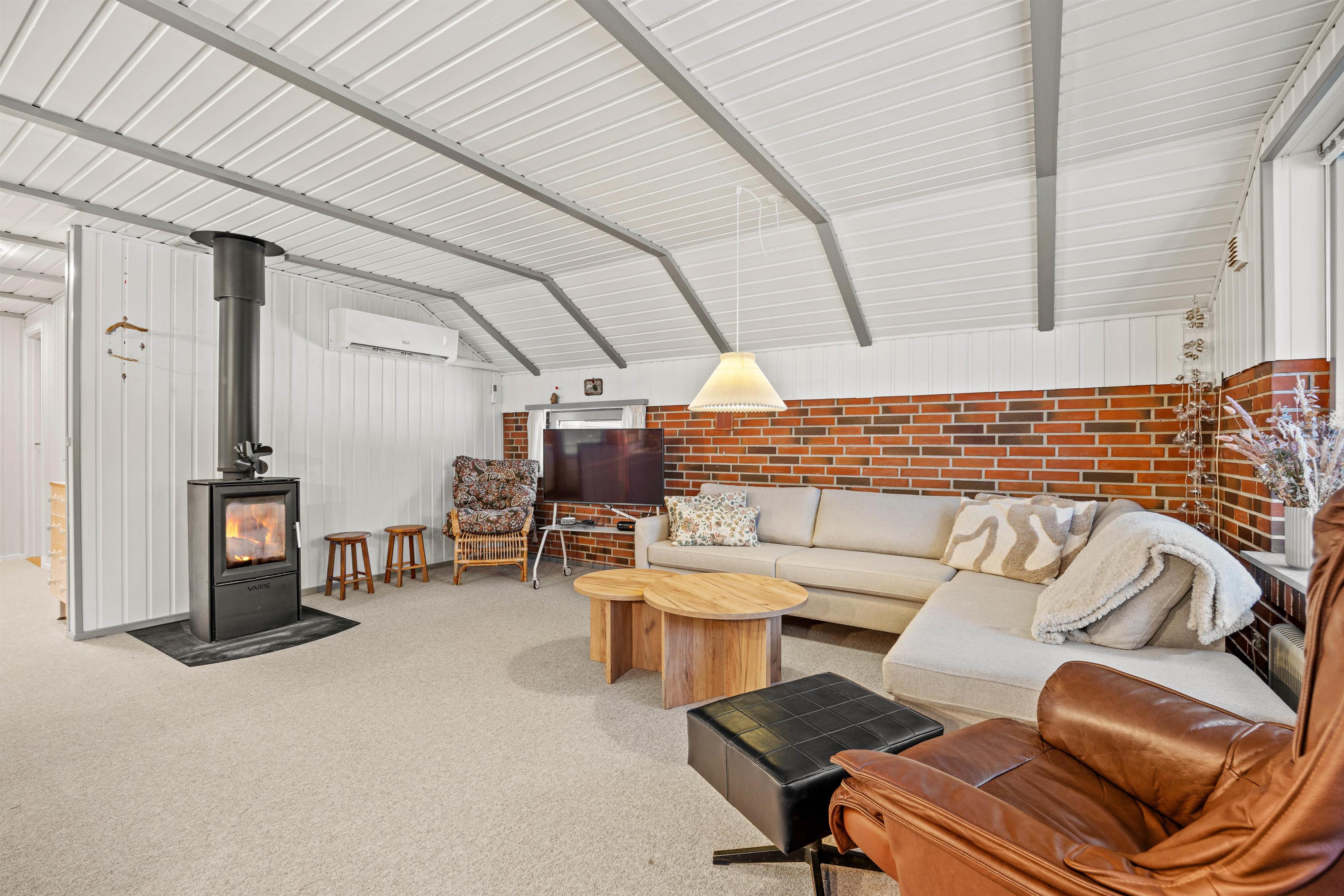 Opholdsrummet fungerer som sommerhusets hjerte og feriens mødested. Her kan I samle hele flokken til hyggelige feriestunder med god mad, brætspil og afslapning på sofaen. Brændeovnen sørger for god stemning og dejlig varme hele året rundt. En energibesparende varmepumpe er også tilgængelig til opvarmning.