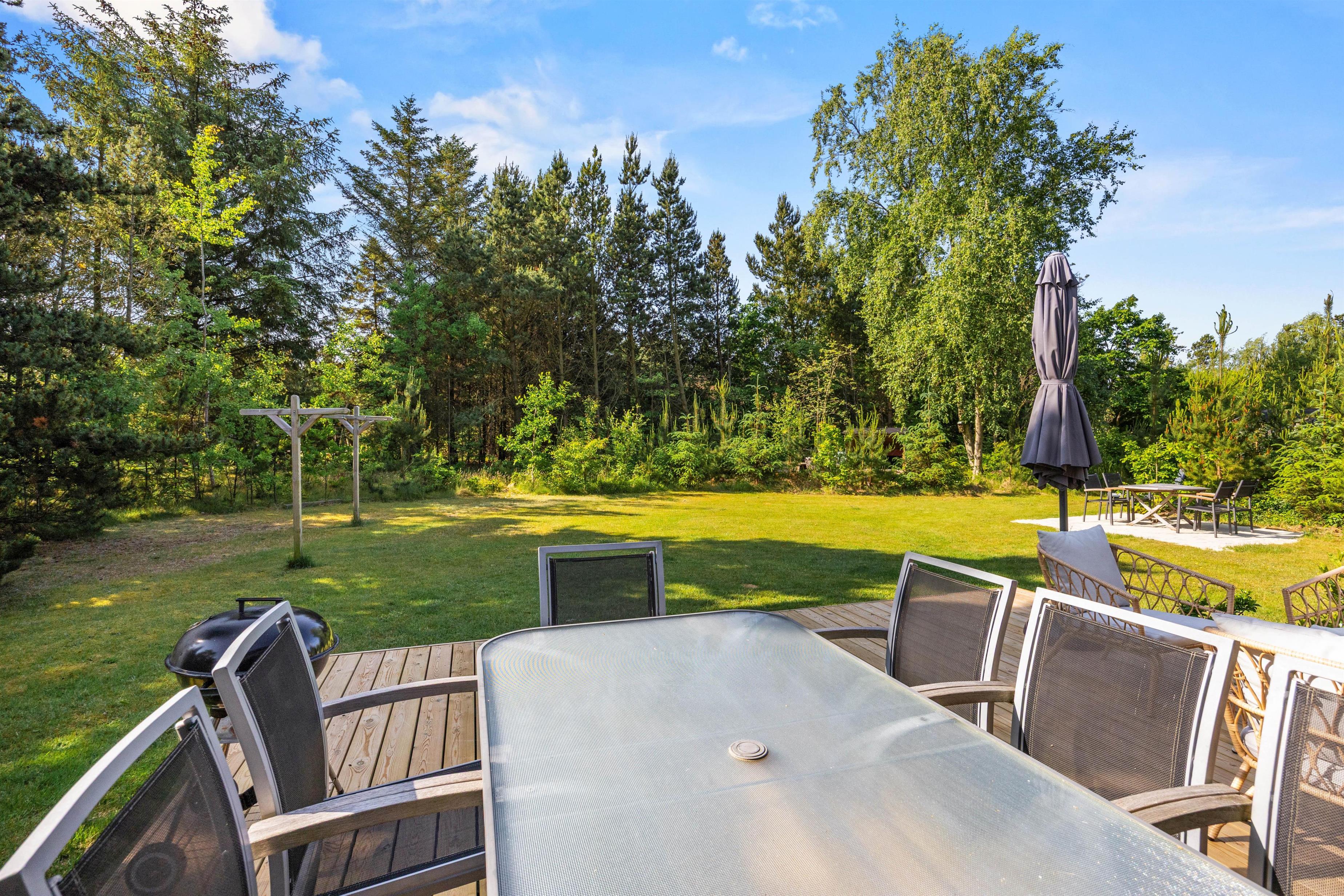Feriehuset er beliggende på en 1.400 kvadratmeter stor grund. Den er omkranset af træer og sørger for, at I har privatliv i ferieafslapningen. Sommerhusets store græsplæne er oplagt til leg med hunden og boldspil med børnene.